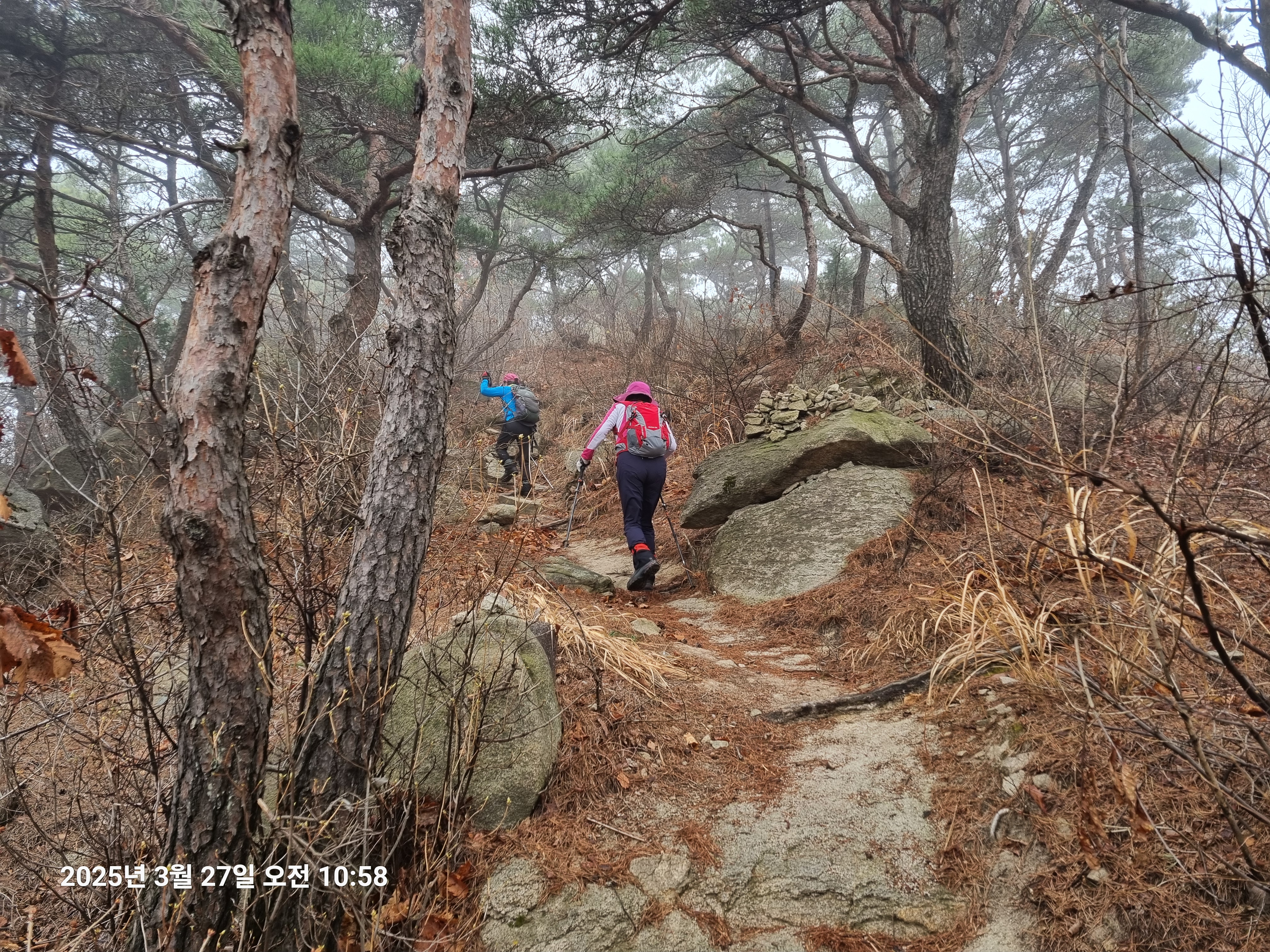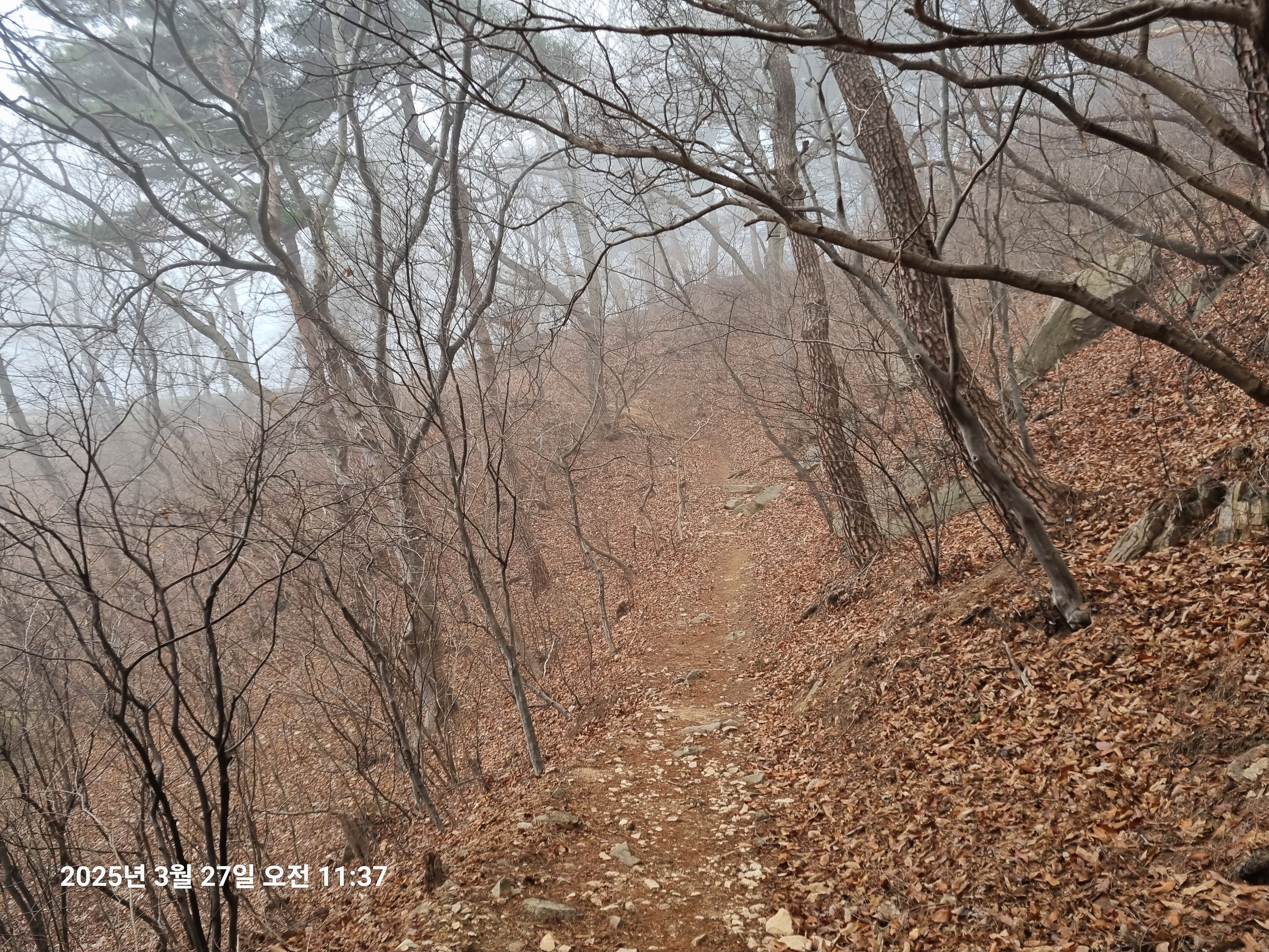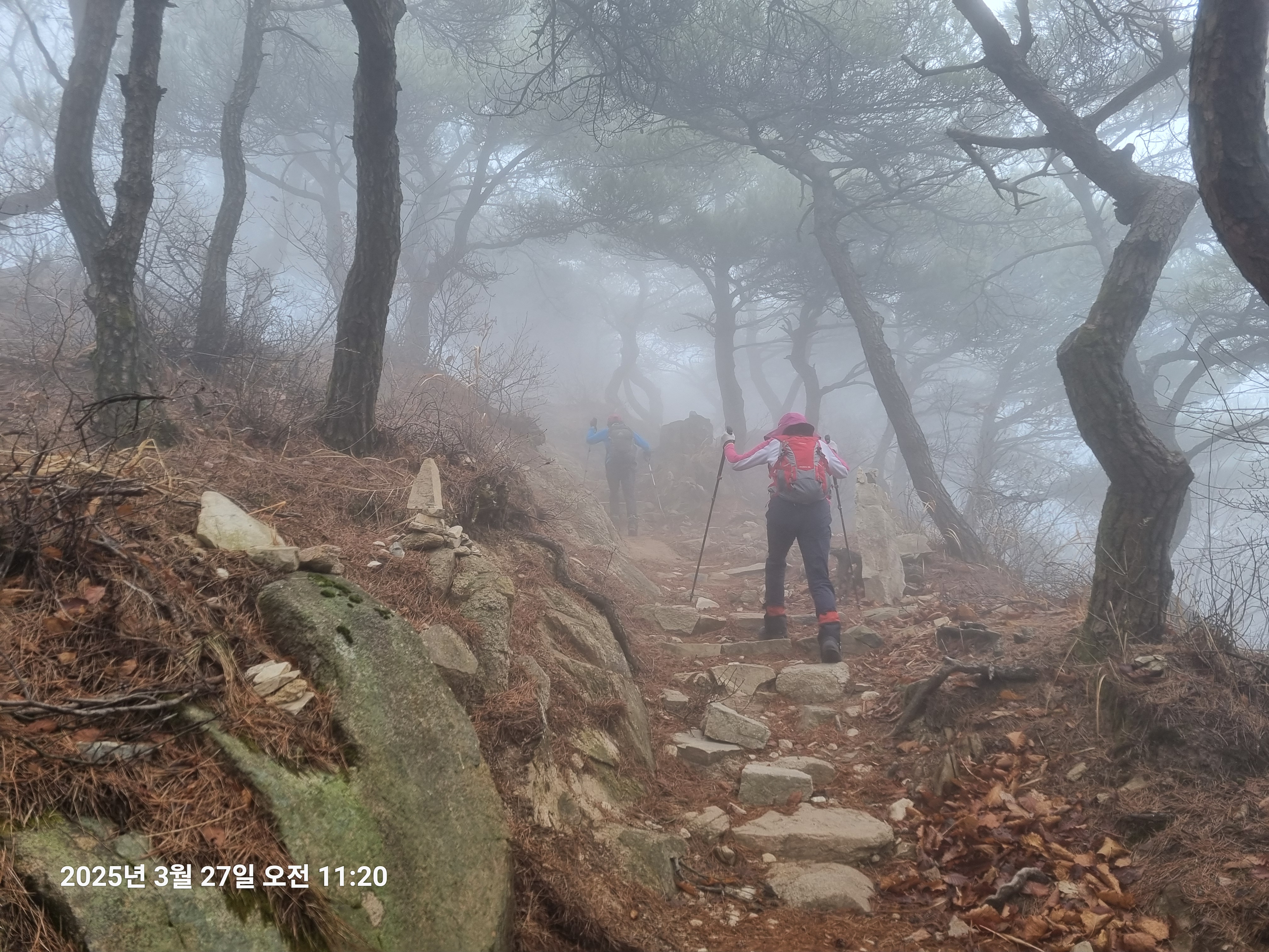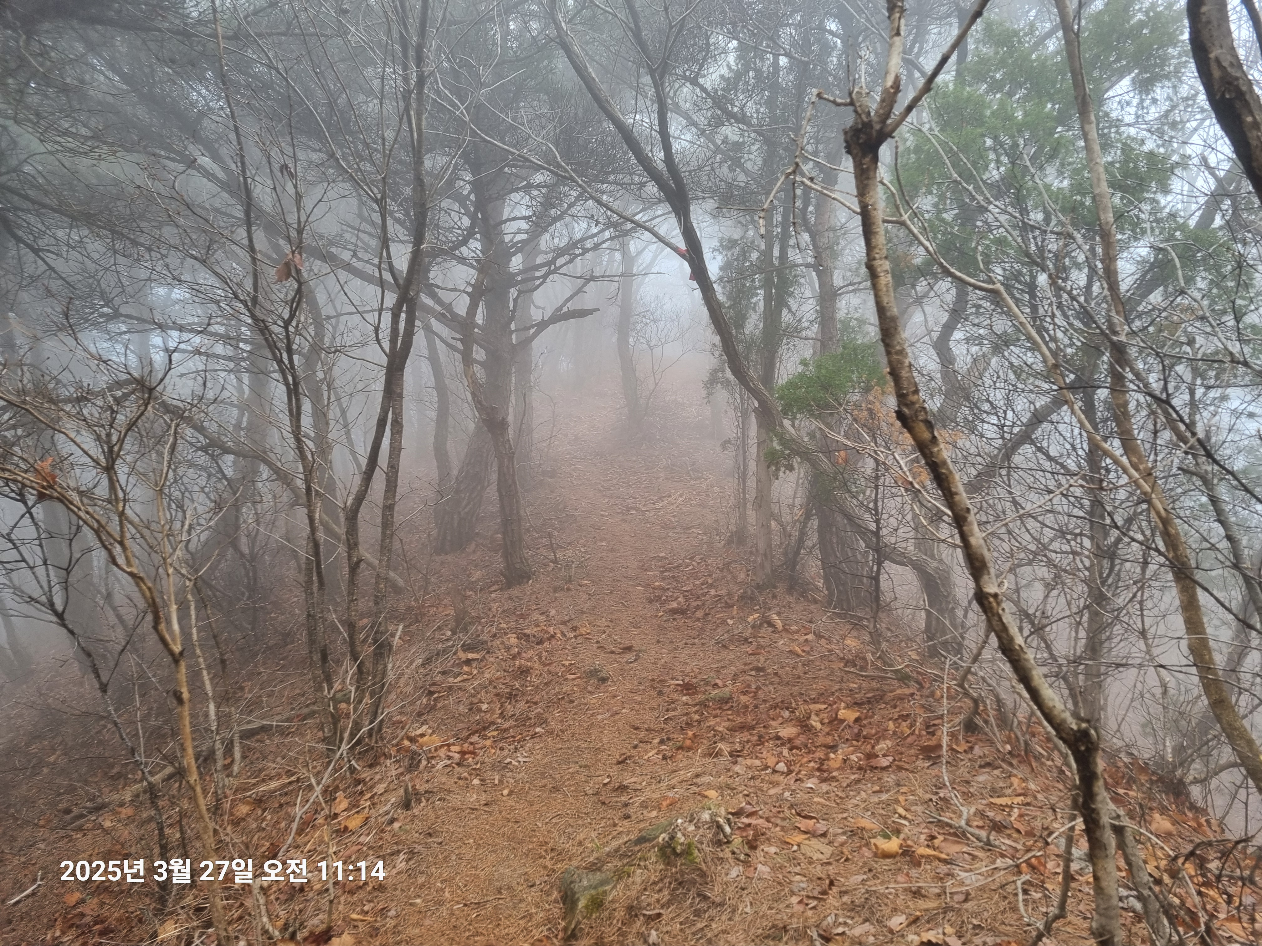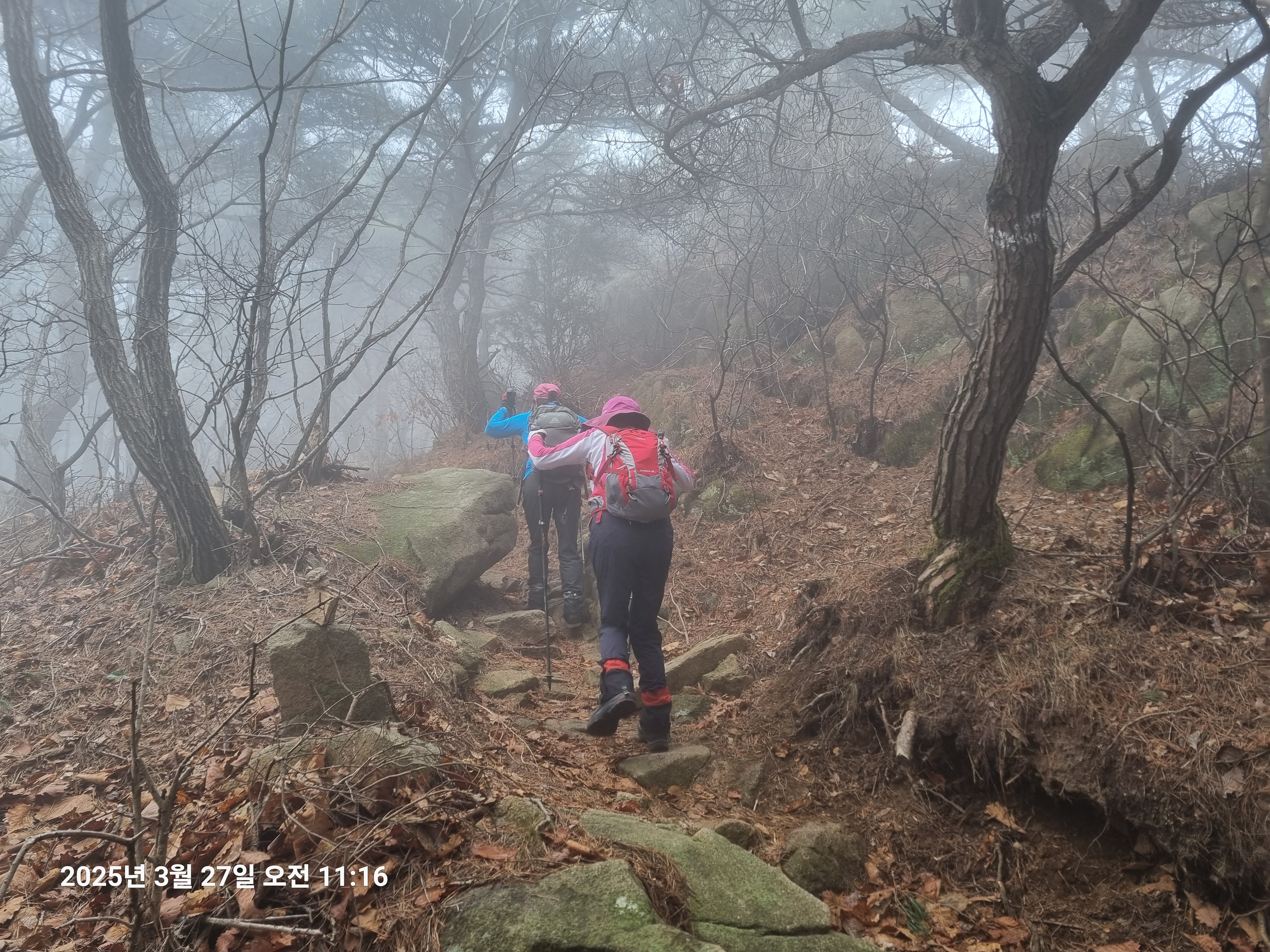 2025년 3월 27일 목요일. 친위 쿠데타에 대한 헌법재판소의 탄핵 결정이 하염없이 지체되고 있어, 행정부와 사법부 검찰 언론속에 있는 일류 엘리트 윤정권 부역자들에 의한 내란이 지속되고있다. 더불어 경상도 지방에 산불이 연일 강풍으로 계속되고 있어 우울하게 산행에 나선다. 또한 흐리고 운무가 끼어 조망이 전혀없는 날이다. 새마포산악회 시산제 날이다. 그래서 짧게 산행하고 뒷풀이를 하다.