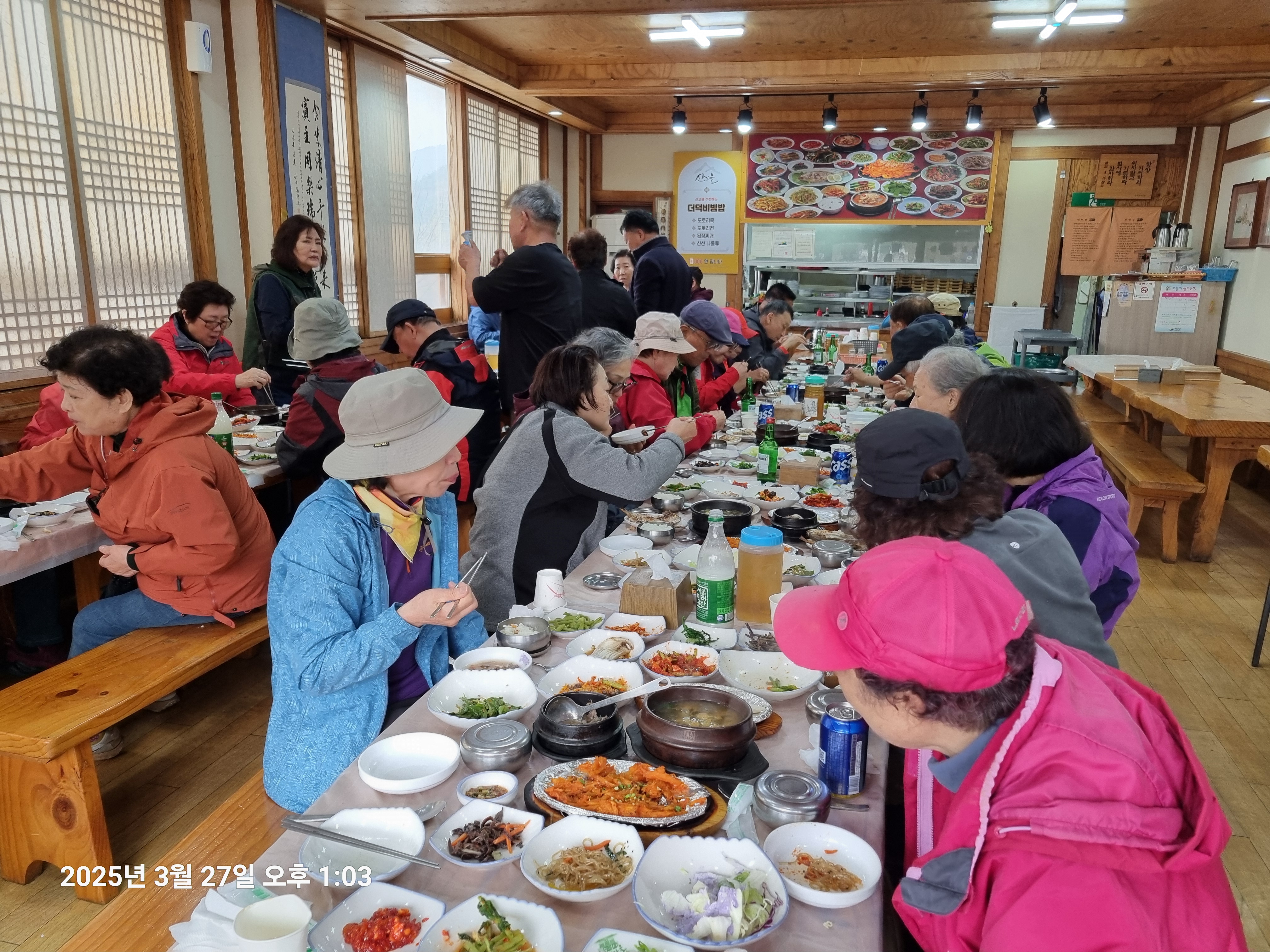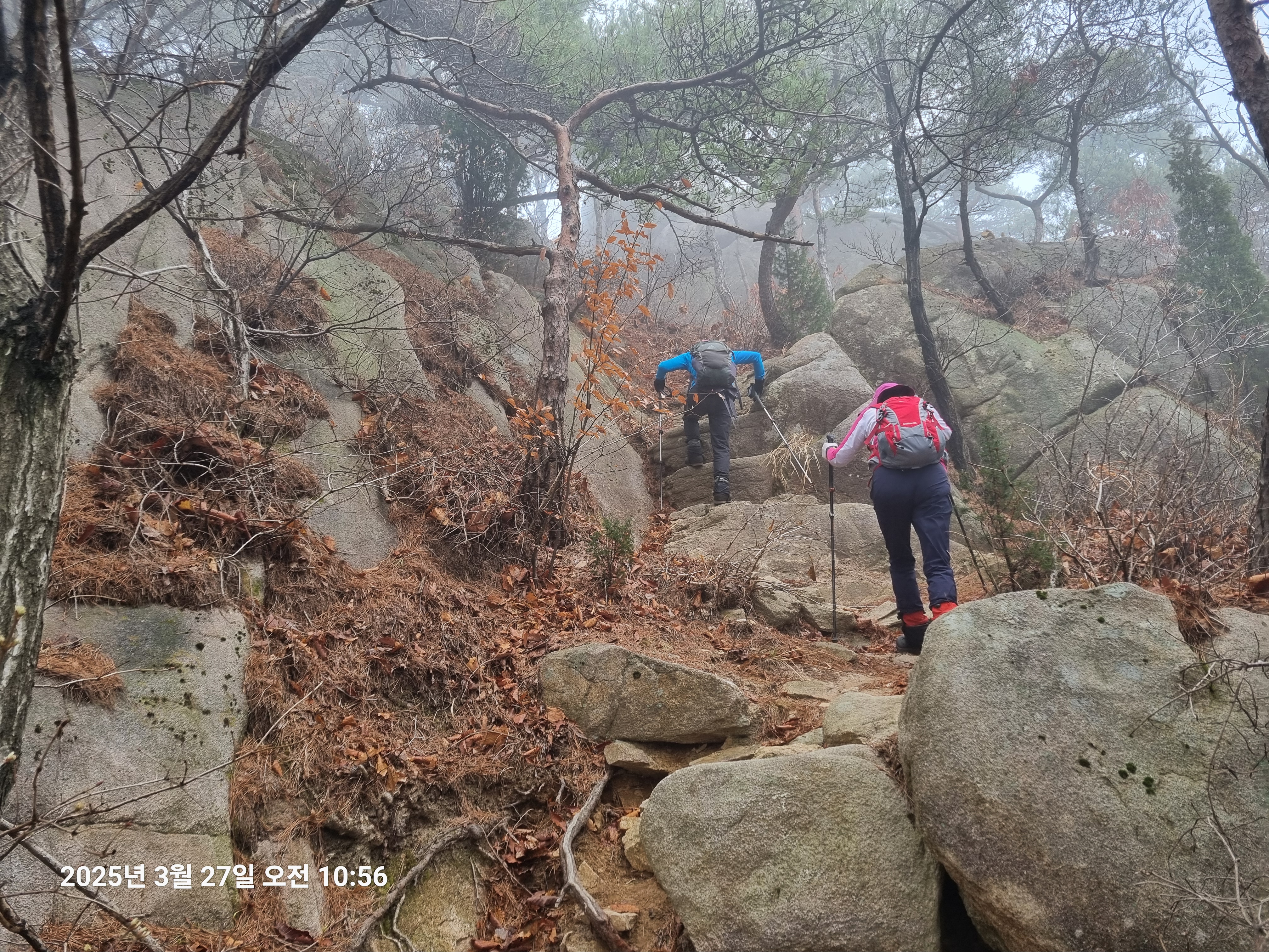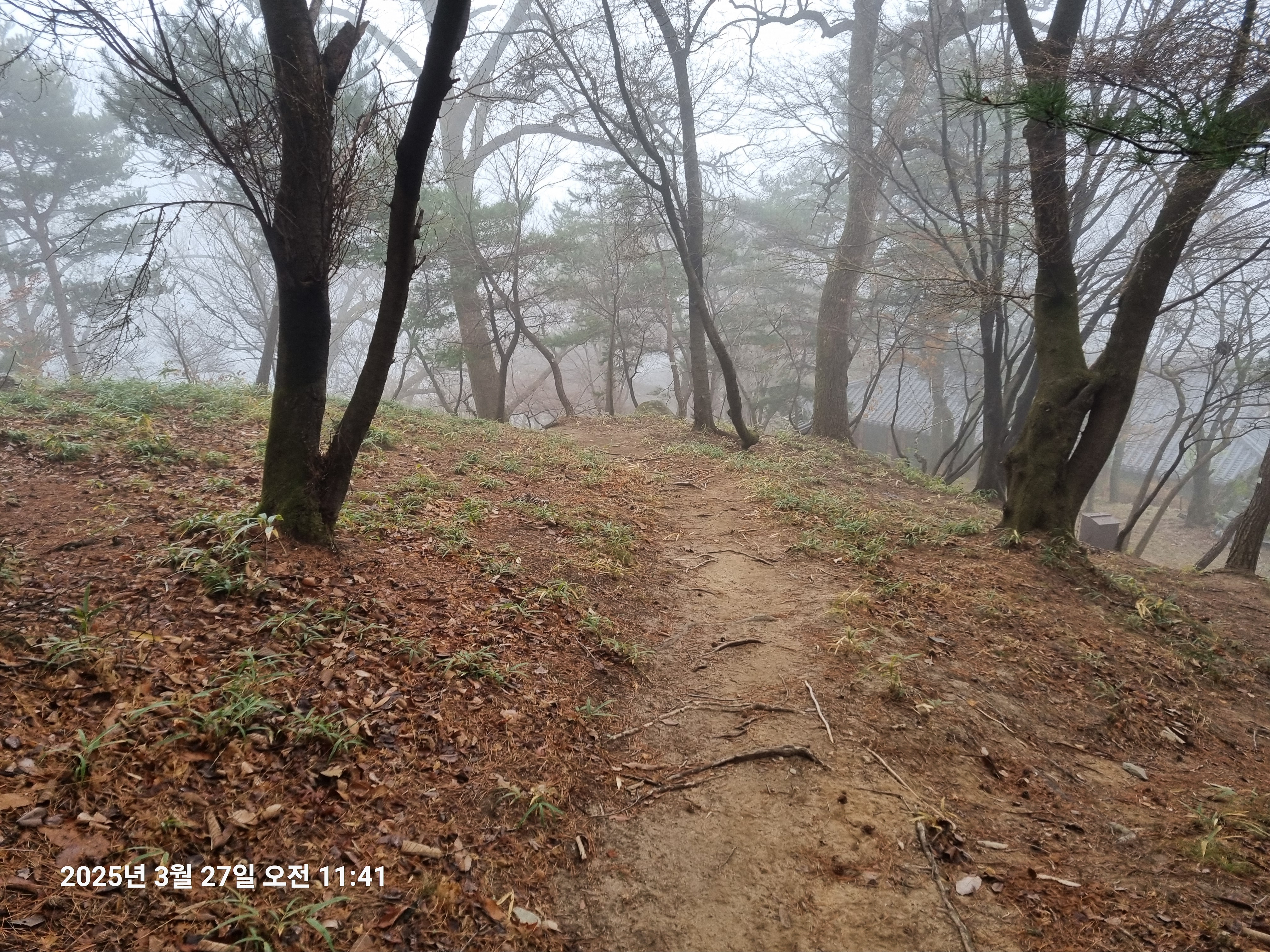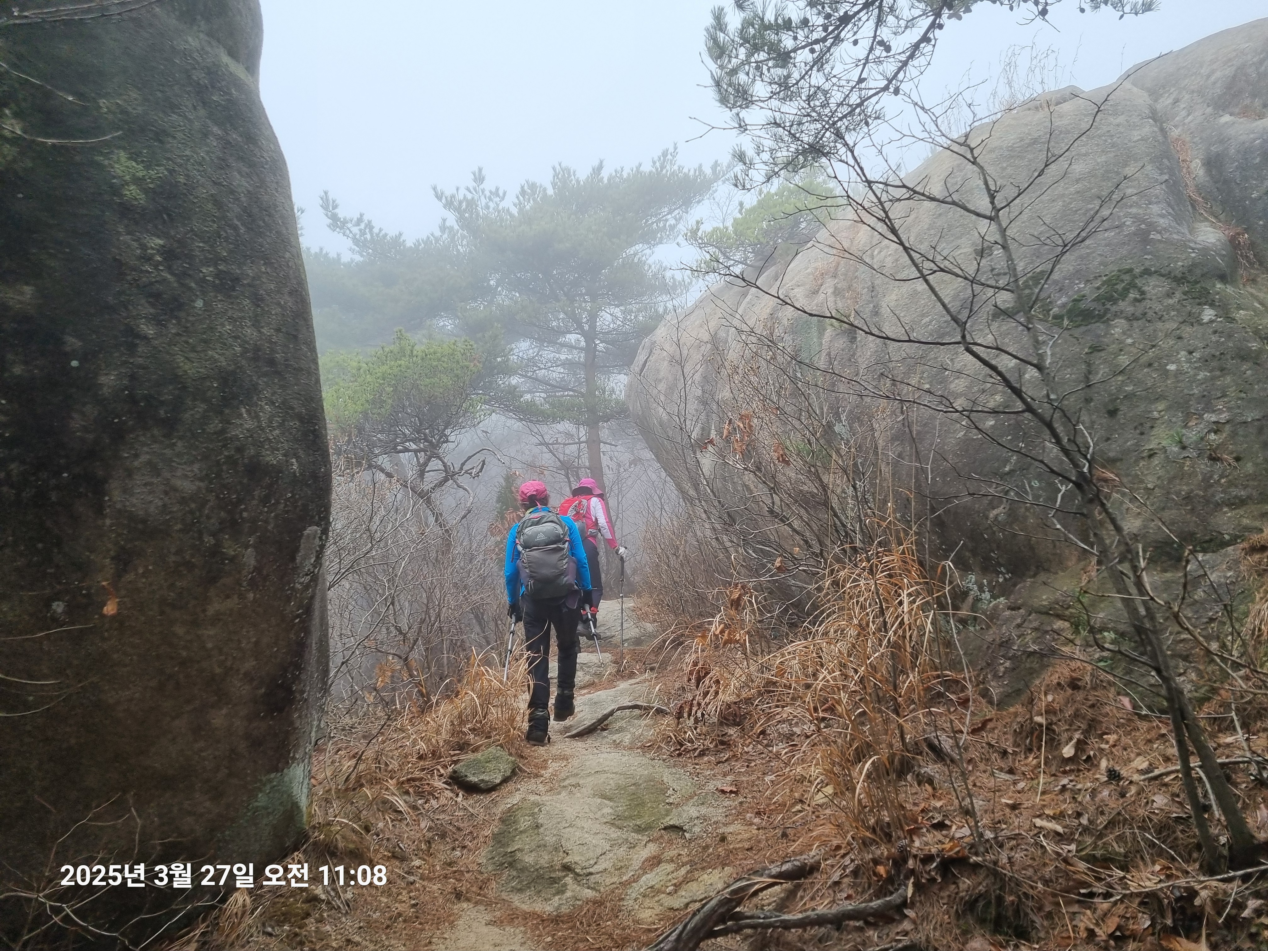 2025년 3월 27일 목요일. 친위 쿠데타에 대한 헌법재판소의 탄핵 결정이 하염없이 지체되고 있어, 행정부와 사법부 검찰 언론속에 있는 일류 엘리트 윤정권 부역자들에 의한 내란이 지속되고있다. 더불어 경상도 지방에 산불이 연일 강풍으로 계속되고 있어 우울하게 산행에 나선다. 또한 흐리고 운무가 끼어 조망이 전혀없는 날이다. 새마포산악회 시산제 날이다. 그래서 짧게 산행하고 뒷풀이를 하다.