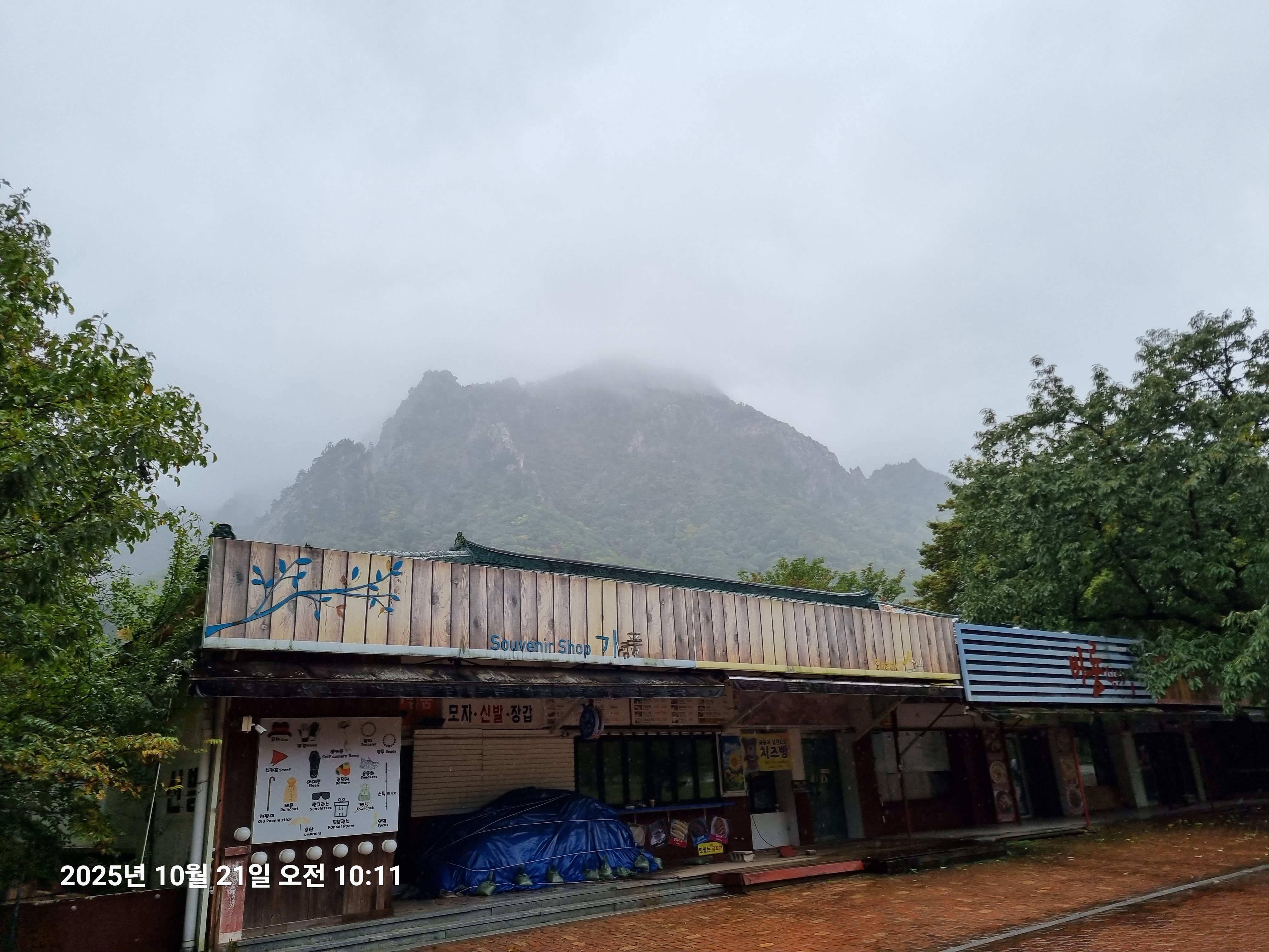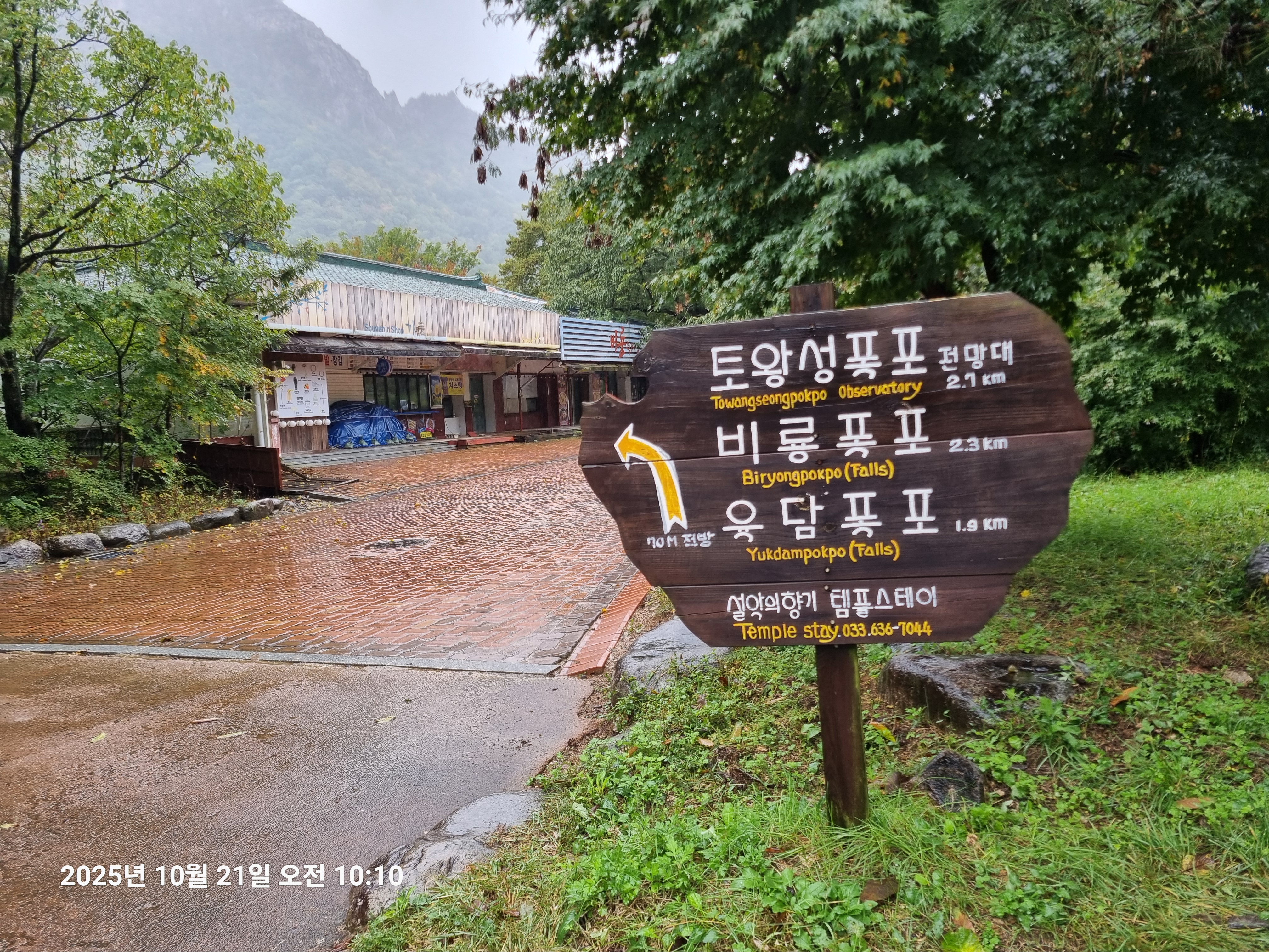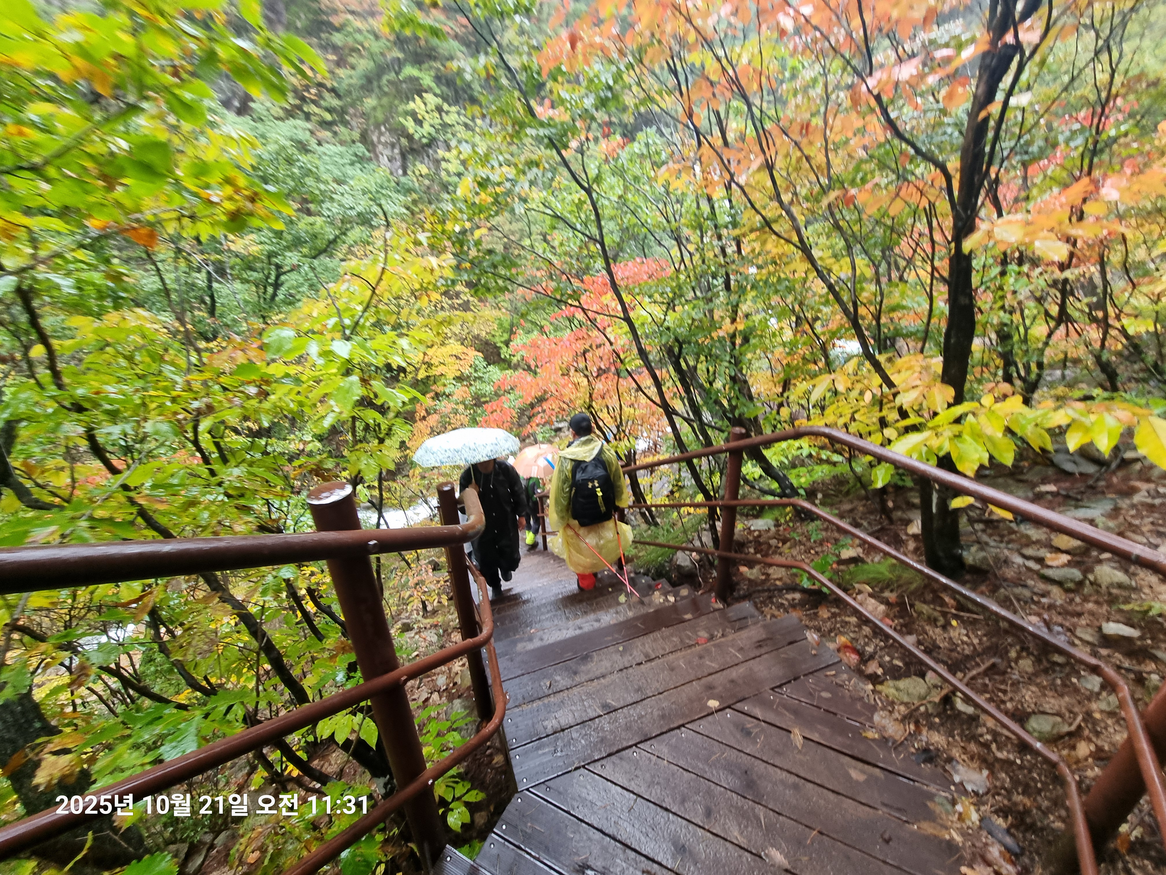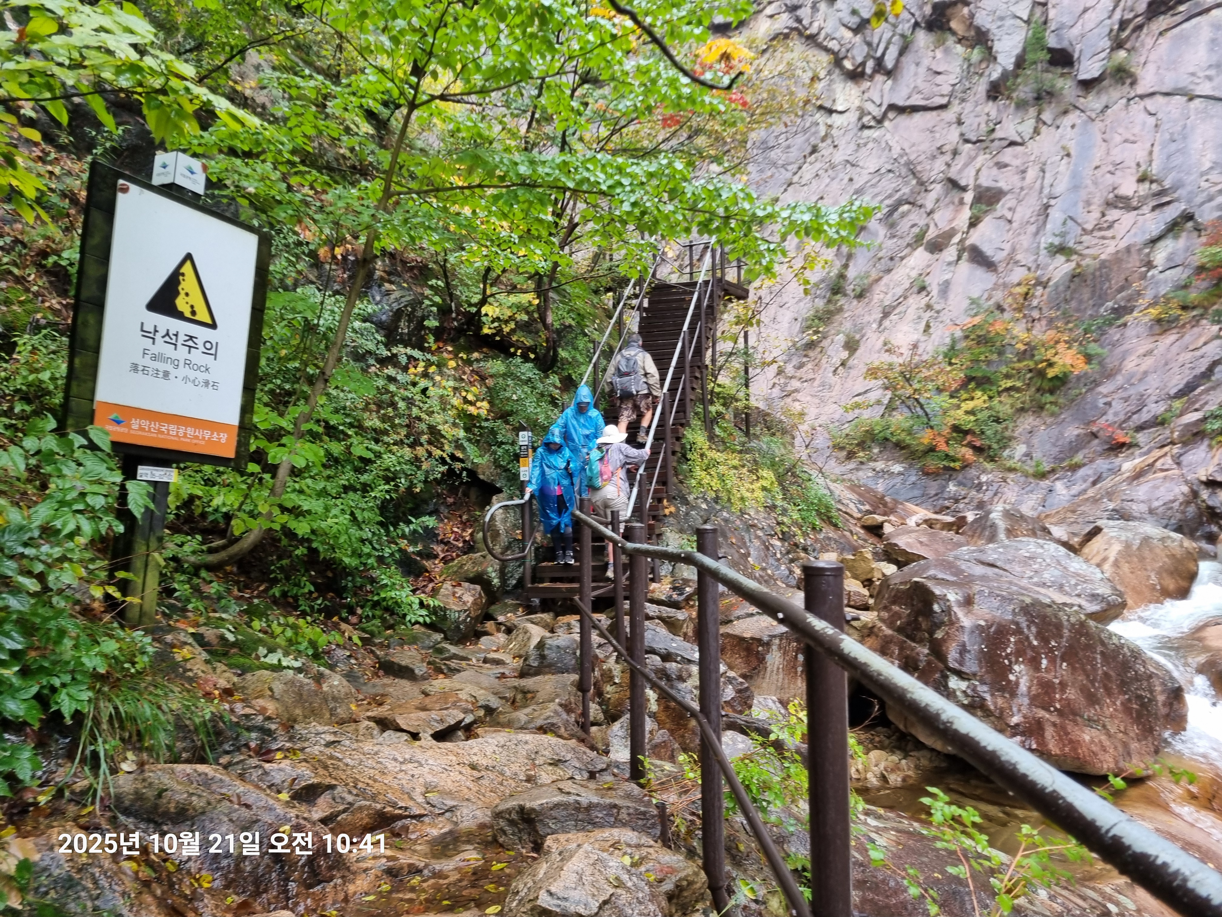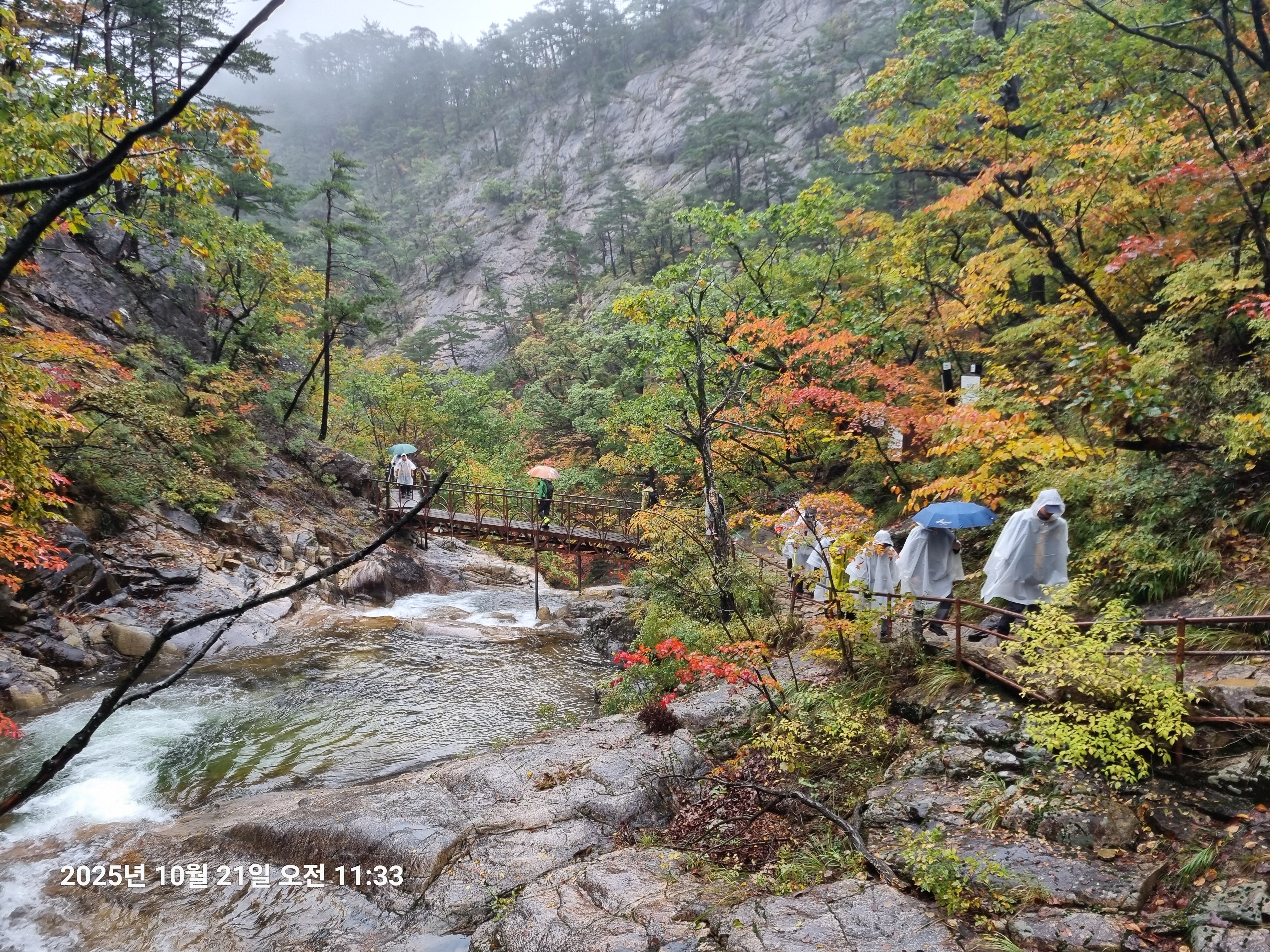 2025년 10월 28일 화요일. 마포산사랑산악회 회원들과 함께 ... 설악동은 비가 내린다. 계속 비가 내려 토왕성폭포 전망대와 울산바위 아래 흔들바위 계조암까지 산책하고 돌아왔다.