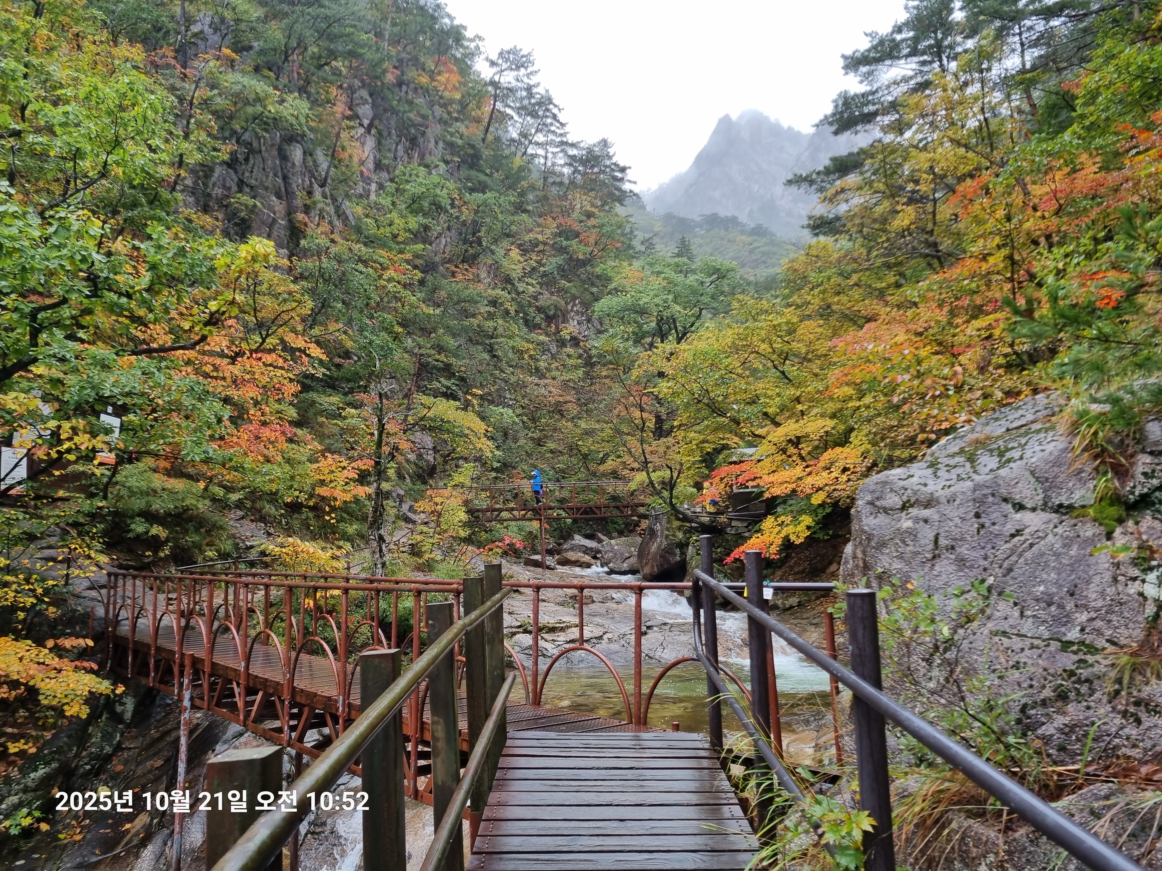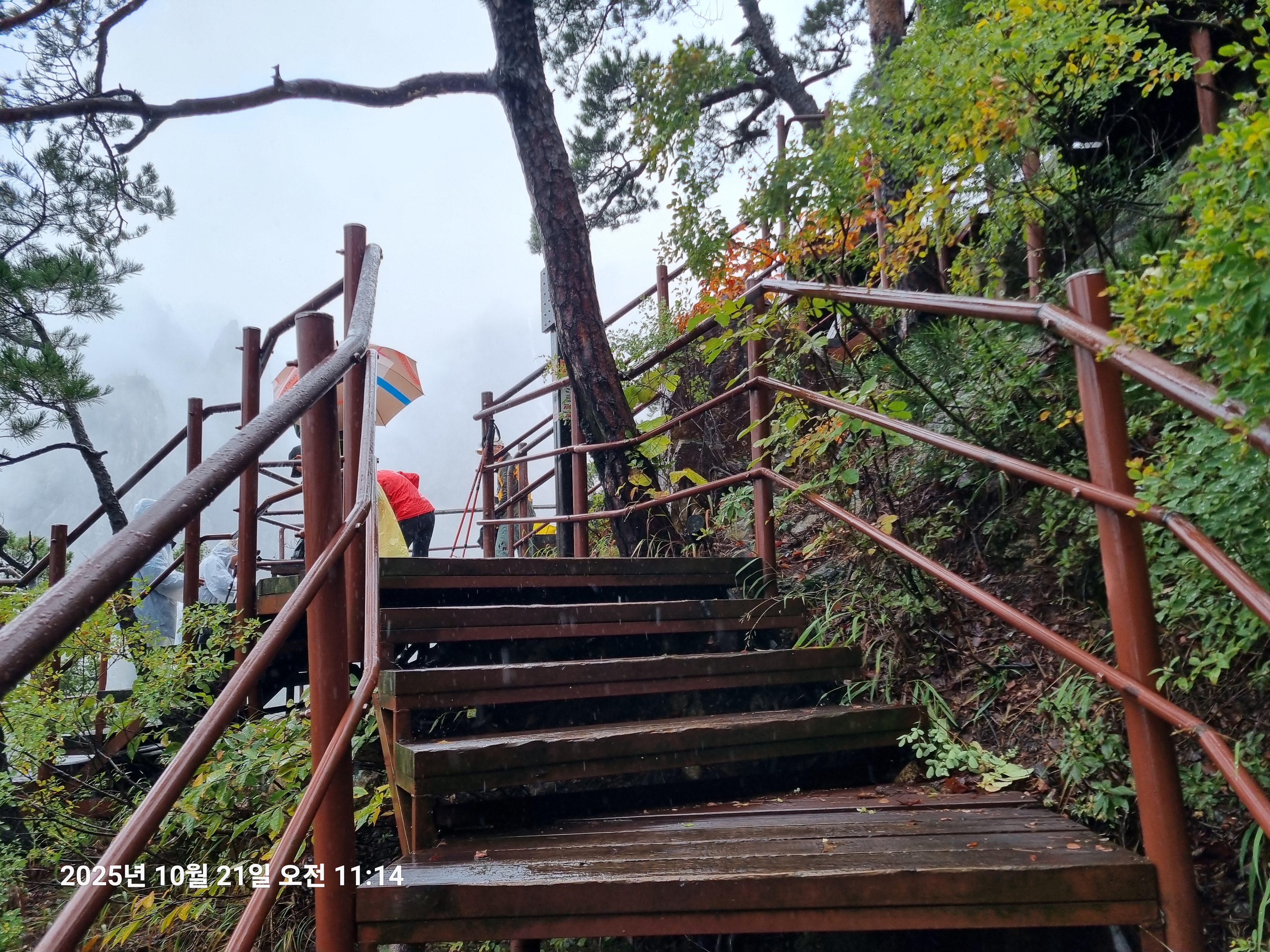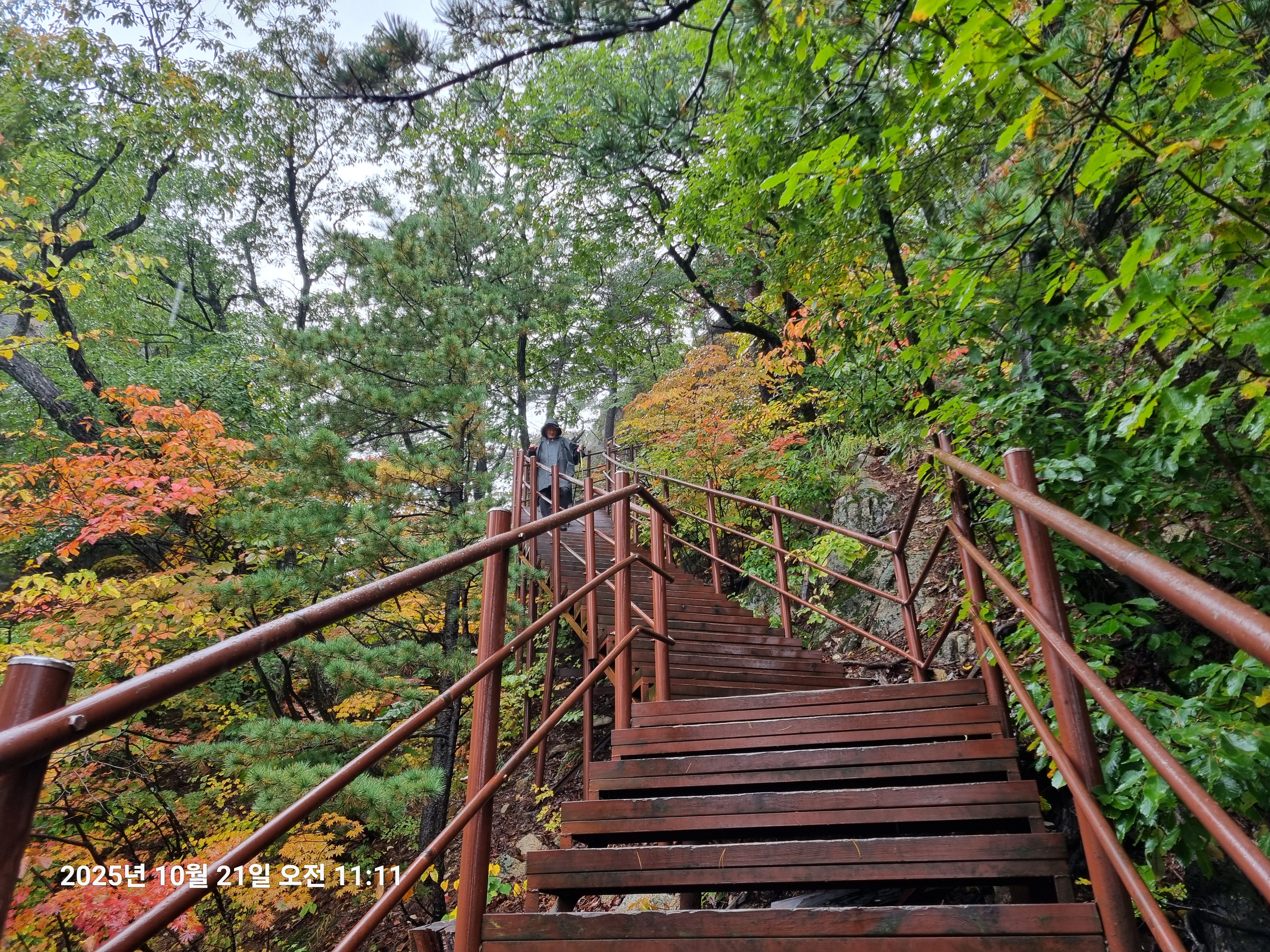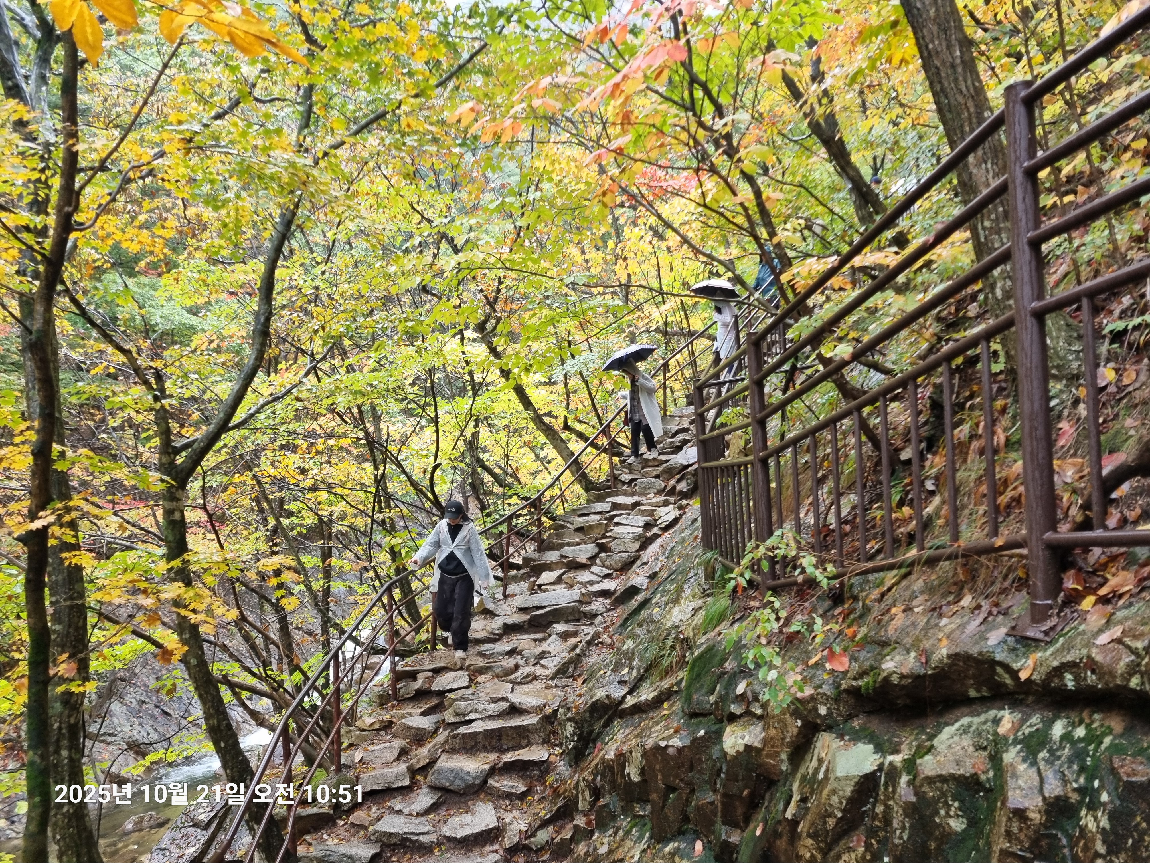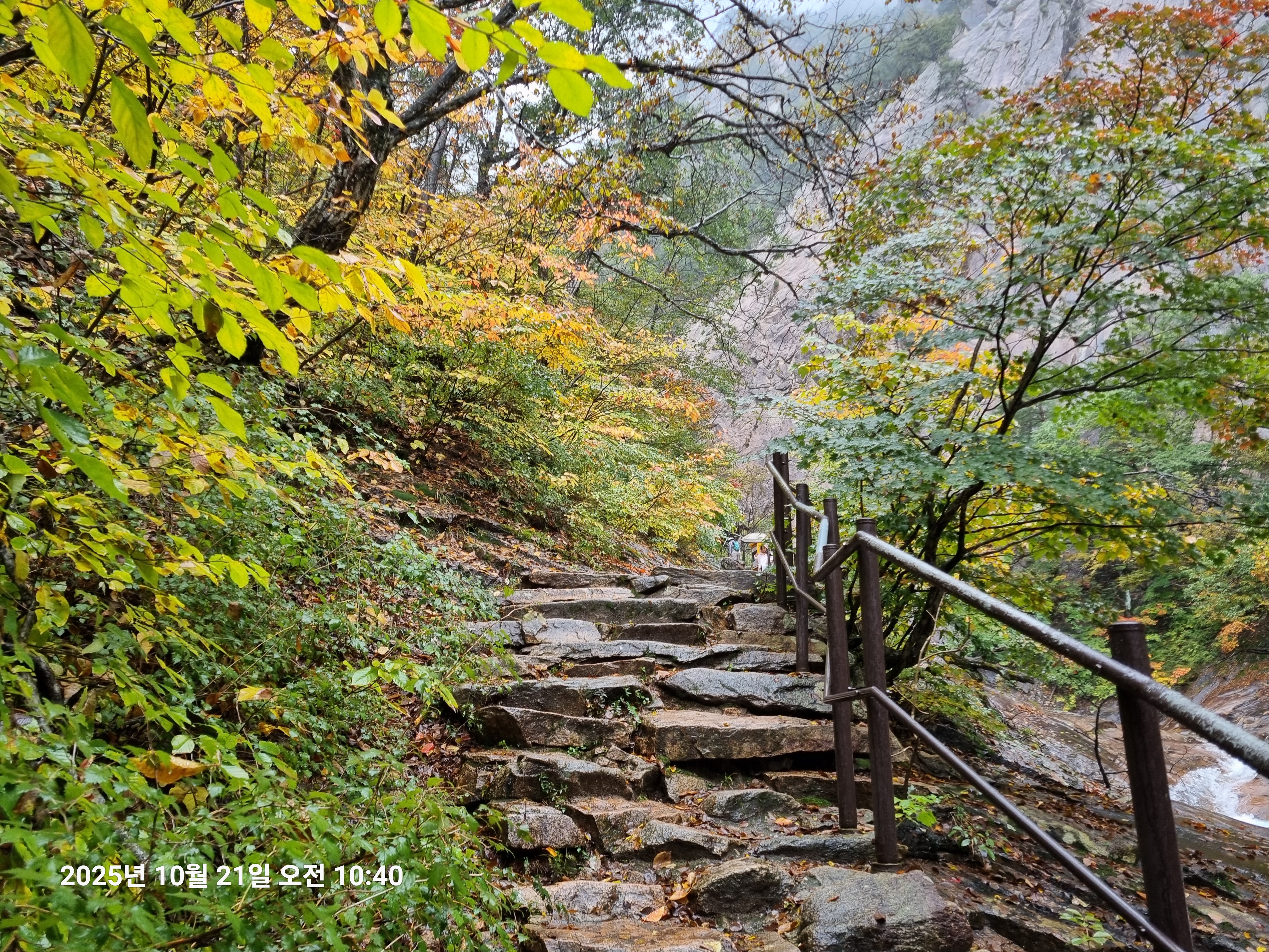 2025년 10월 28일 화요일. 마포산사랑산악회 회원들과 함께 ... 설악동은 비가 내린다. 계속 비가 내려 토왕성폭포 전망대와 울산바위 아래 흔들바위 계조암까지 산책하고 돌아왔다.