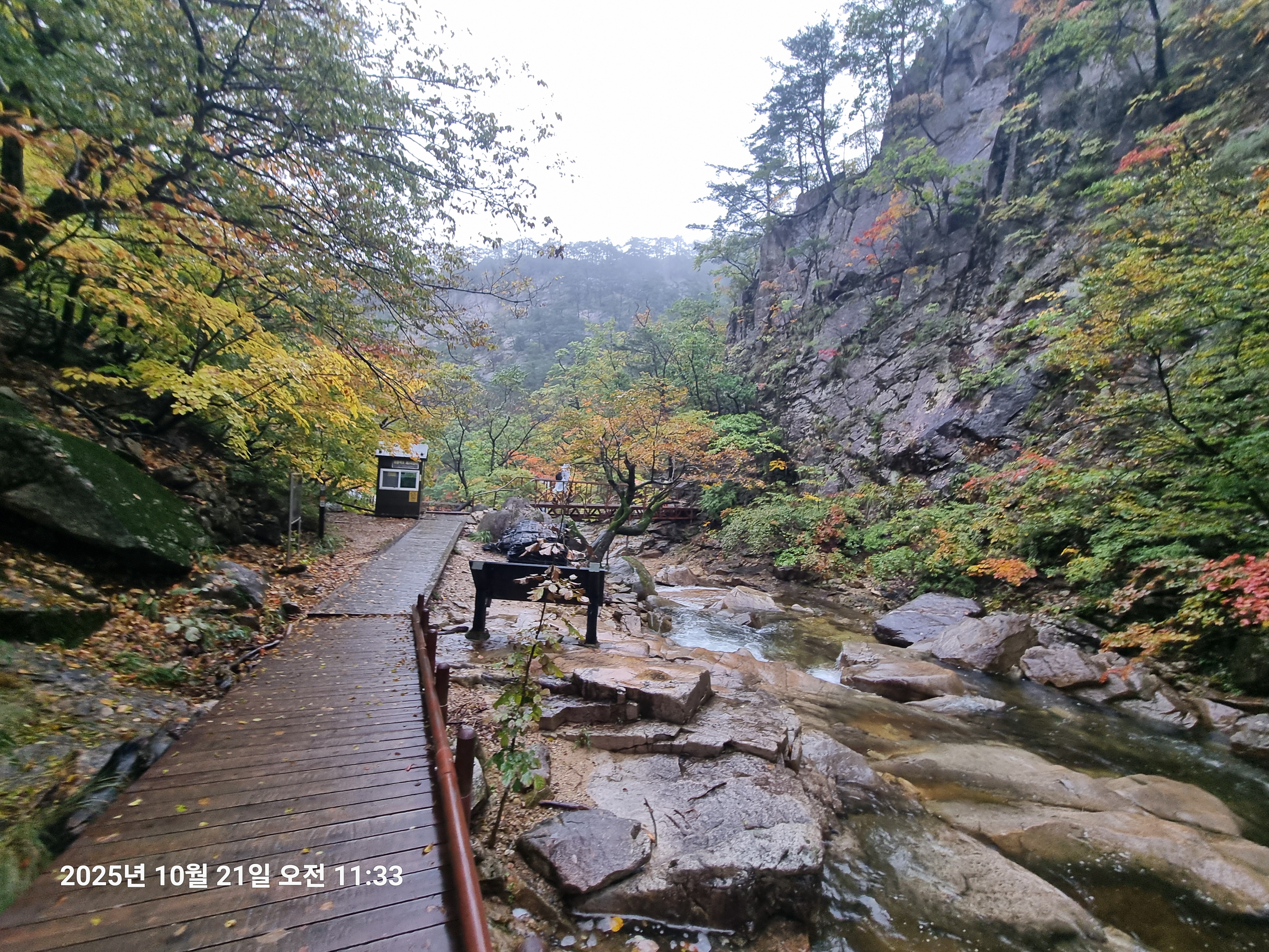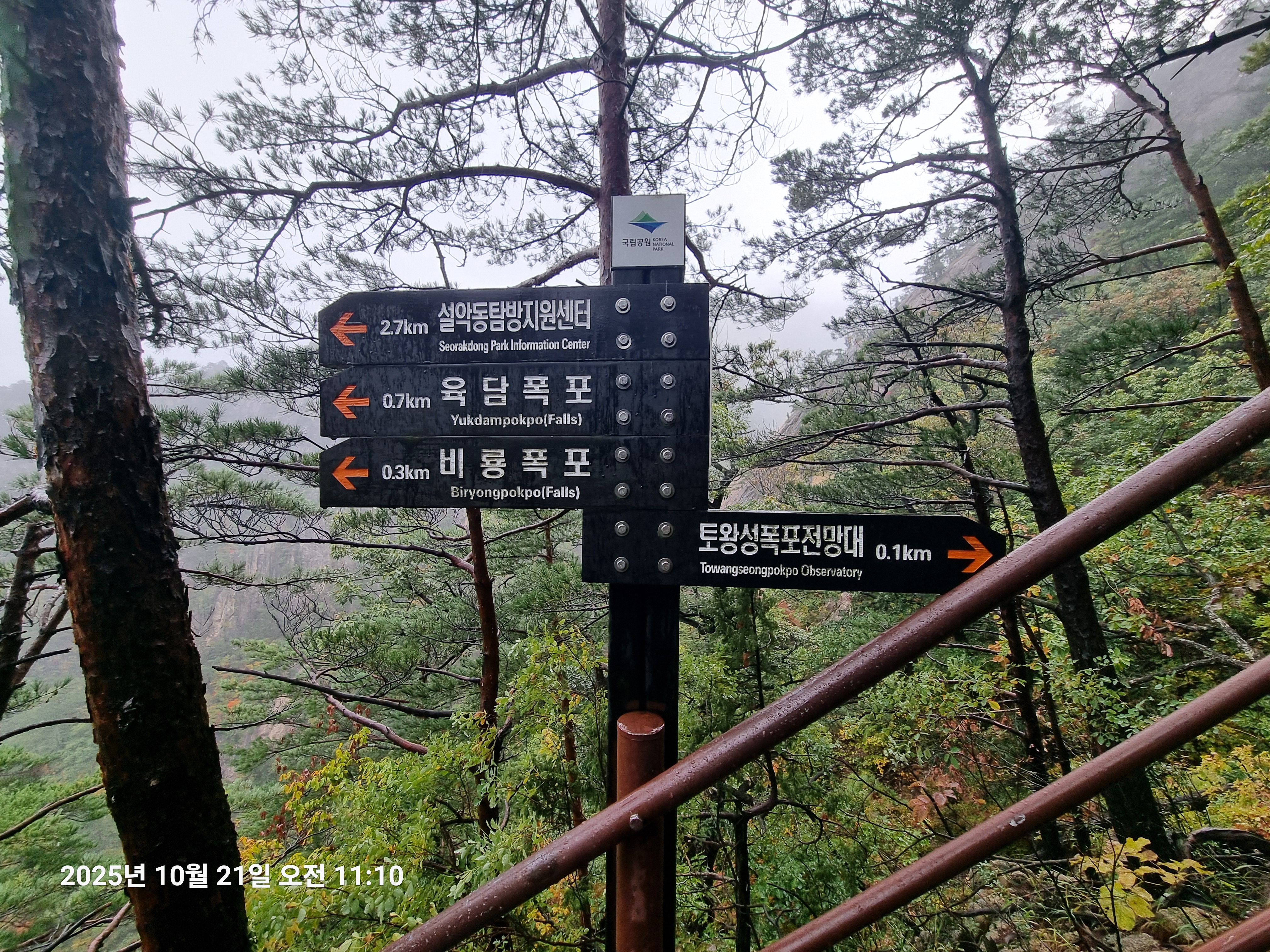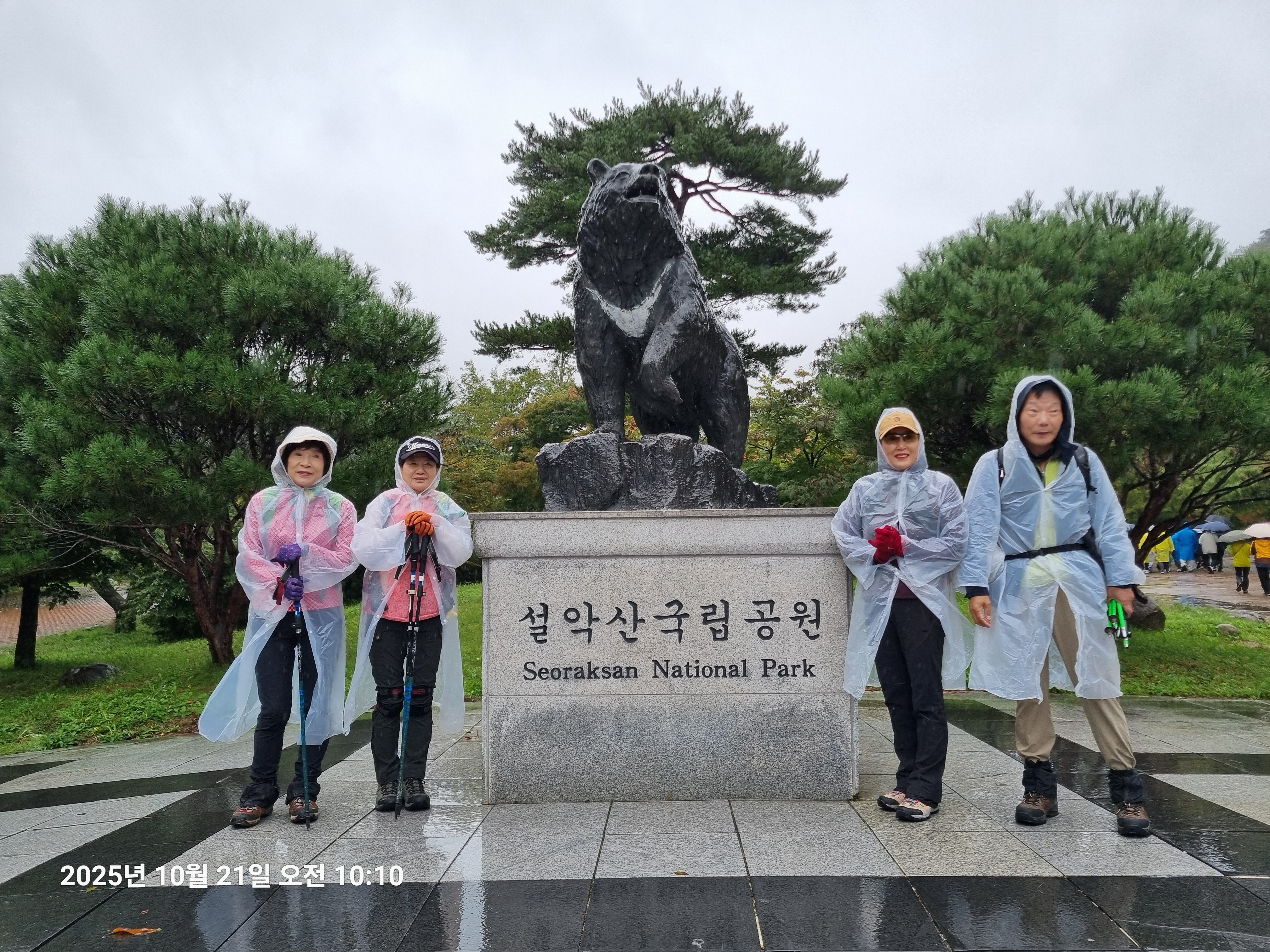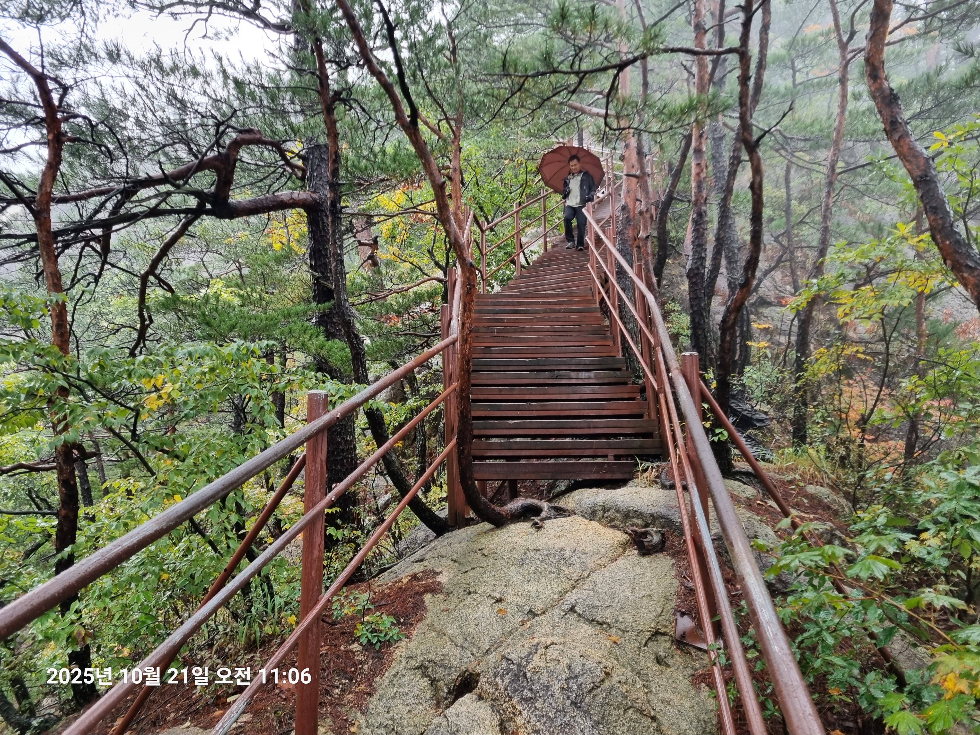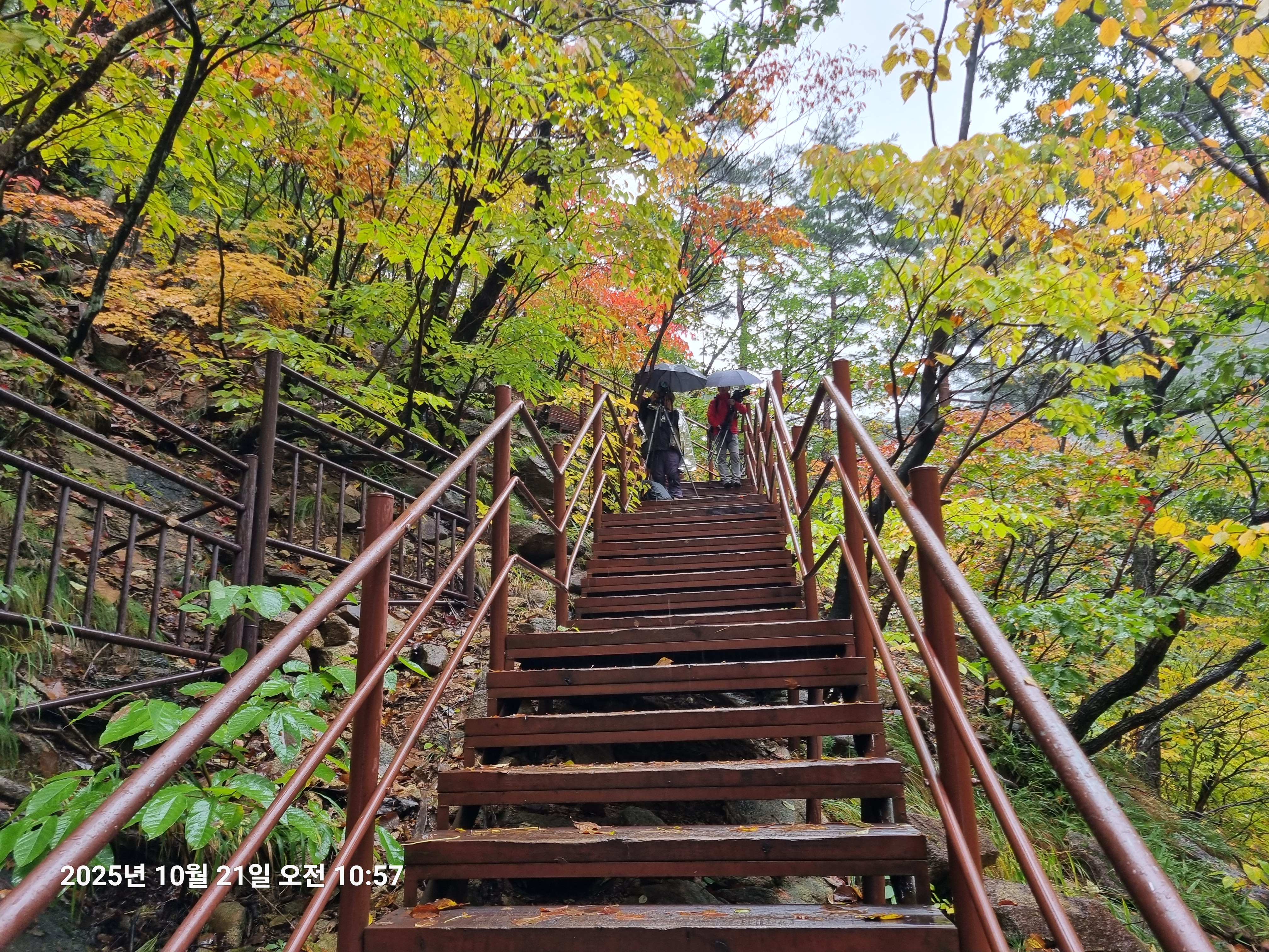 2025년 10월 28일 화요일. 마포산사랑산악회 회원들과 함께 ... 설악동은 비가 내린다. 계속 비가 내려 토왕성폭포 전망대와 울산바위 아래 흔들바위 계조암까지 산책하고 돌아왔다.