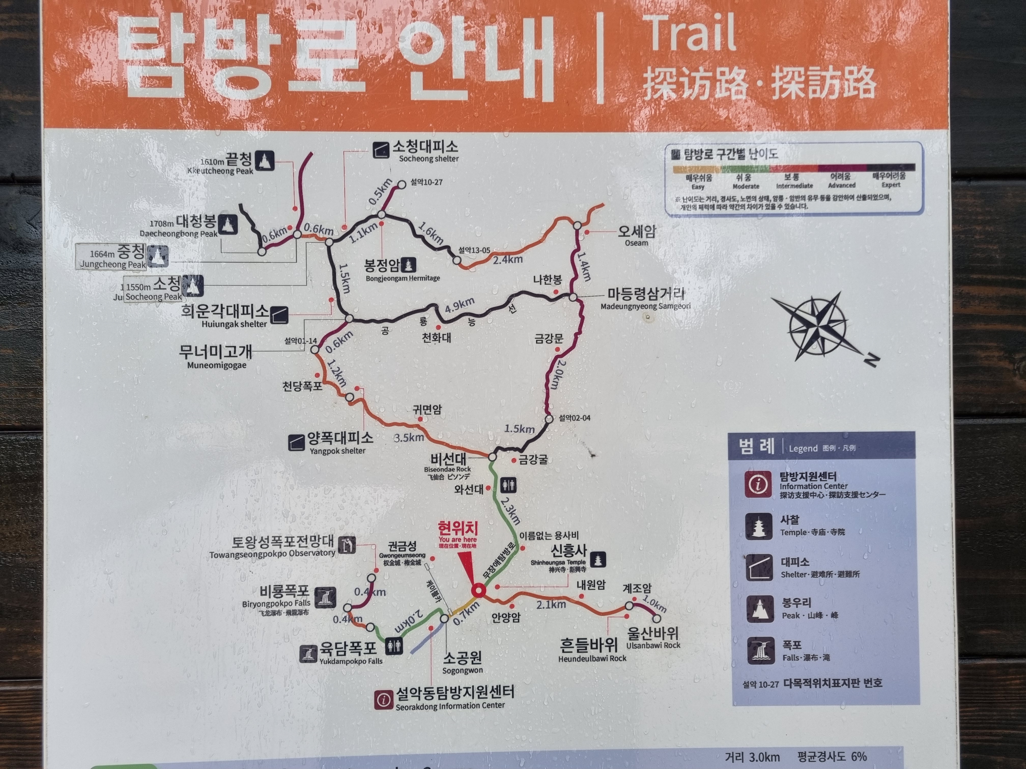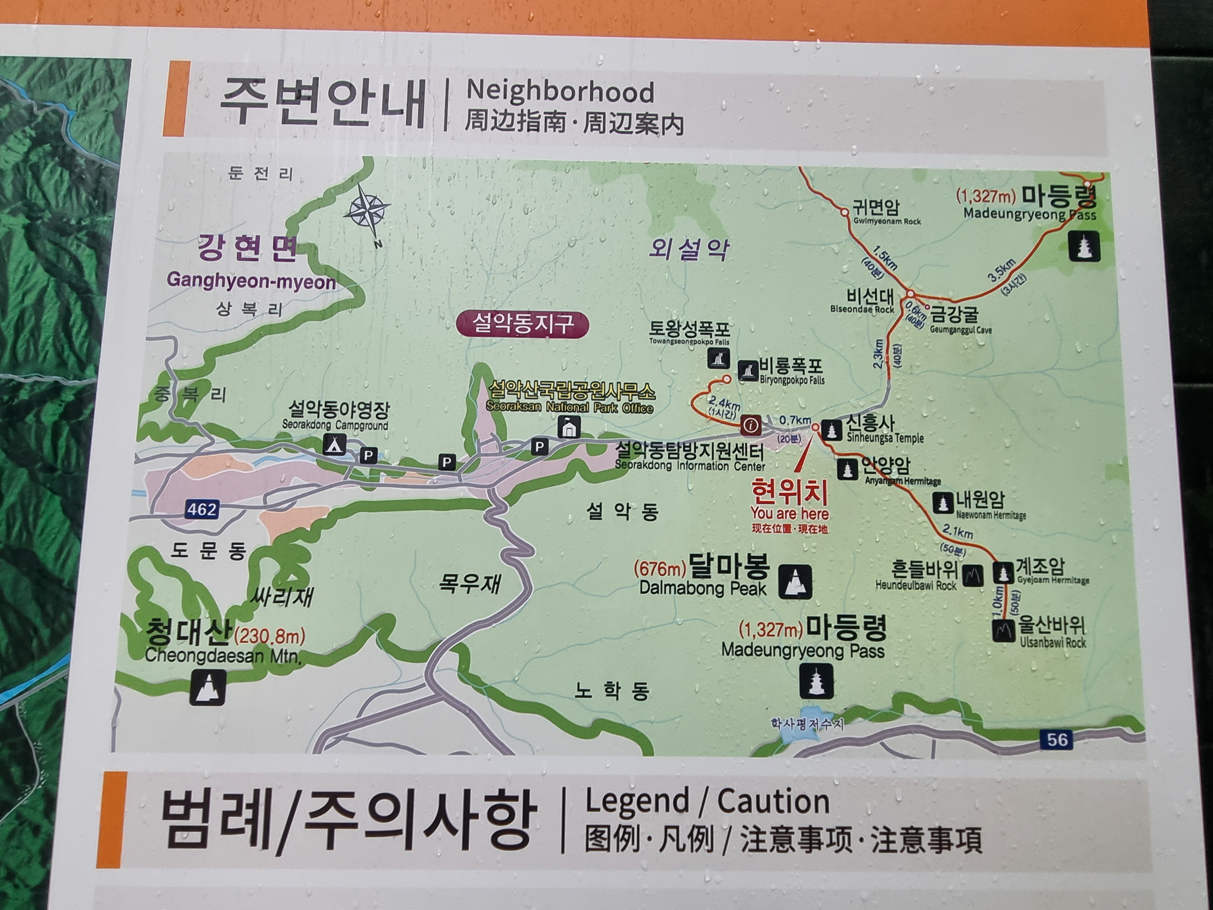 설악휴게소 주차장-설악산소공원-육담폭포-비룡폭포-토왕성폭포 전망대-명상의 길-신흥사-안양암-흔들바위-설악산 소공원-주차장.