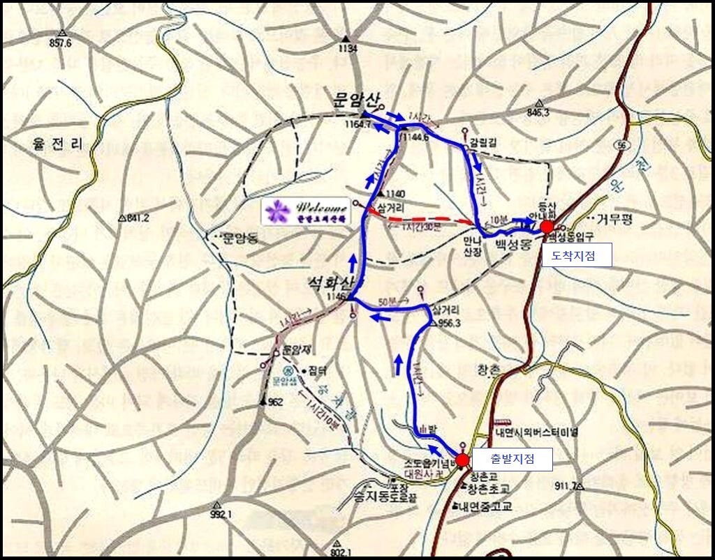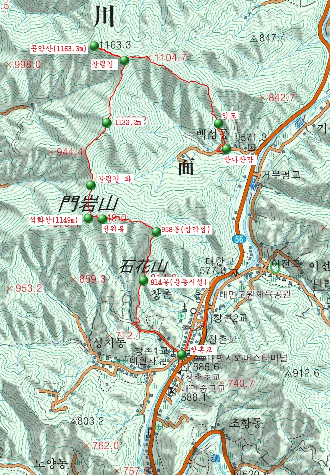 창촌1교-내면성당-814m봉 운동가구-암봉전망대-석화산-1133.2m봉-문암산 갈림길-문암산 왕복-1104.7m봉 능선-만나산장가든(송어아저씨)-백성동 입구. 오룩스맵상 8.25km. 3시간 45분 소요.