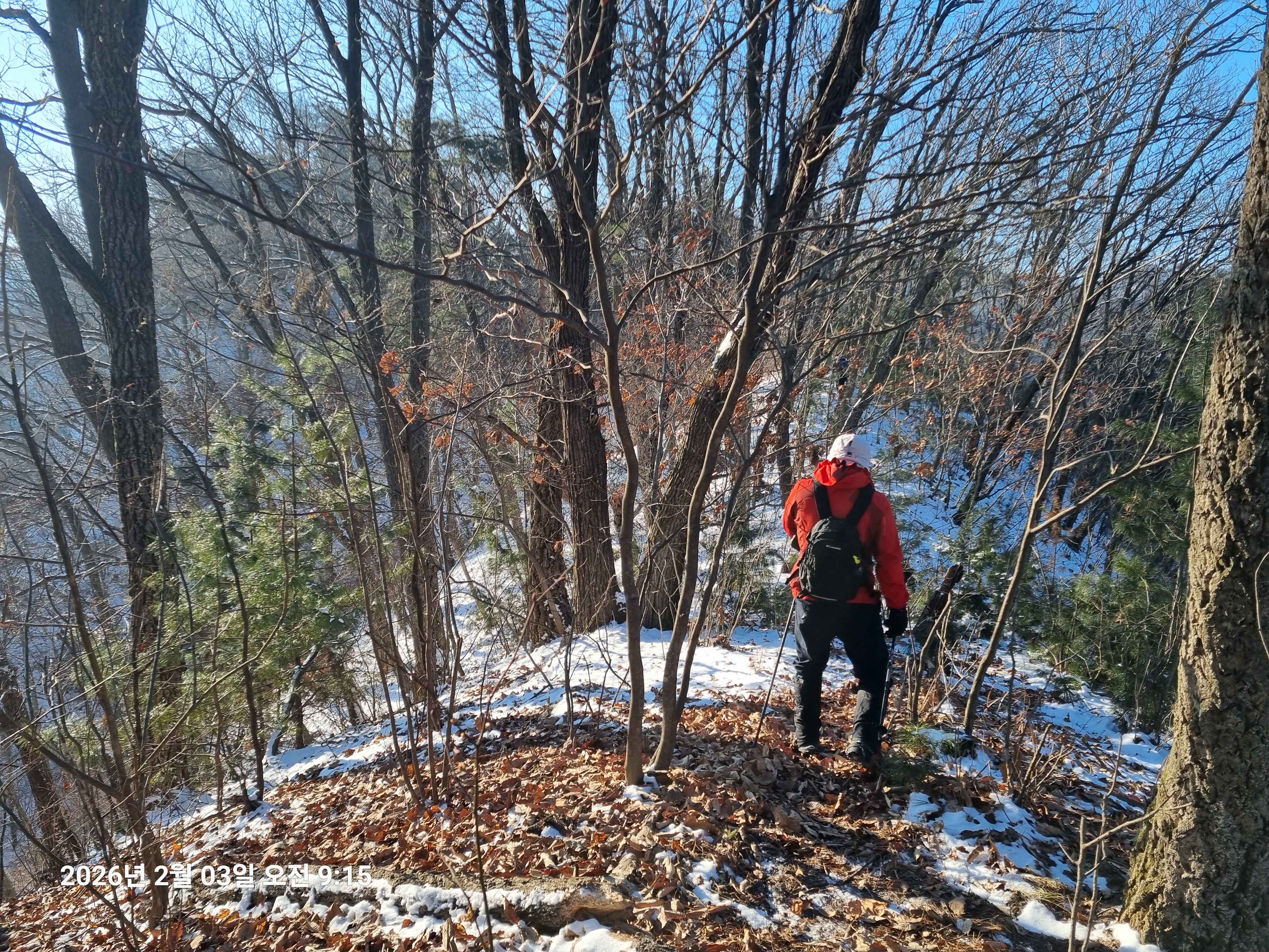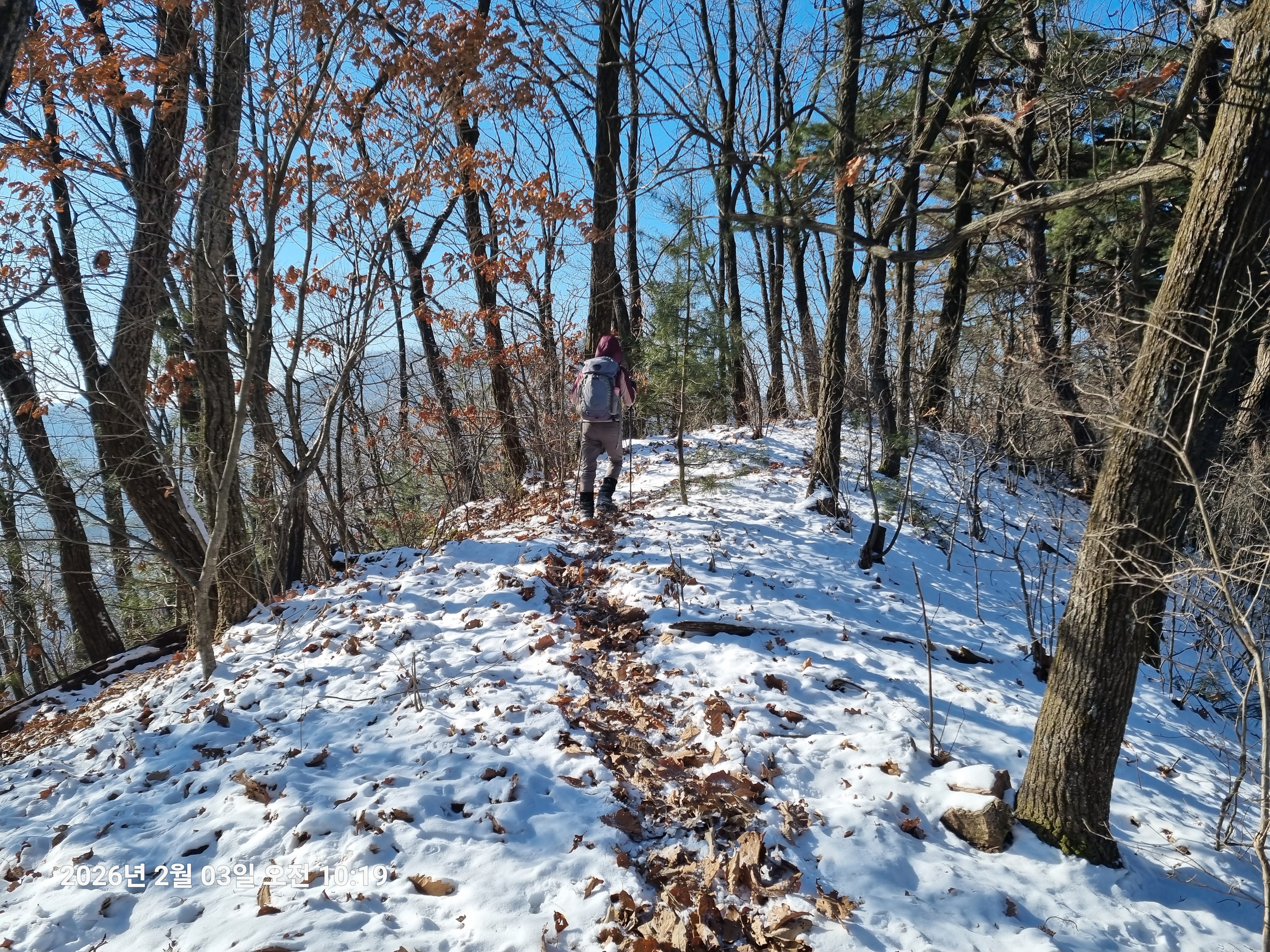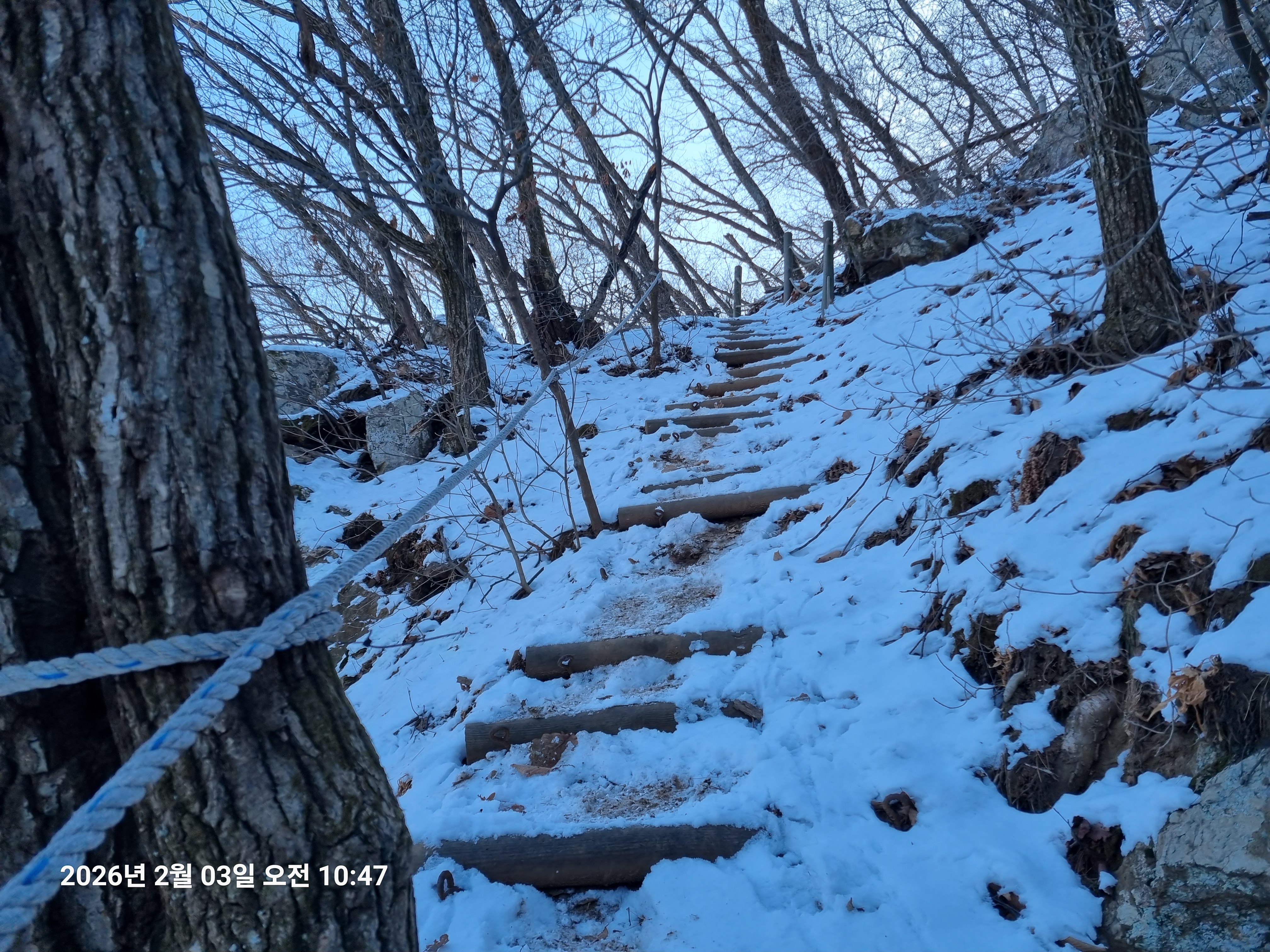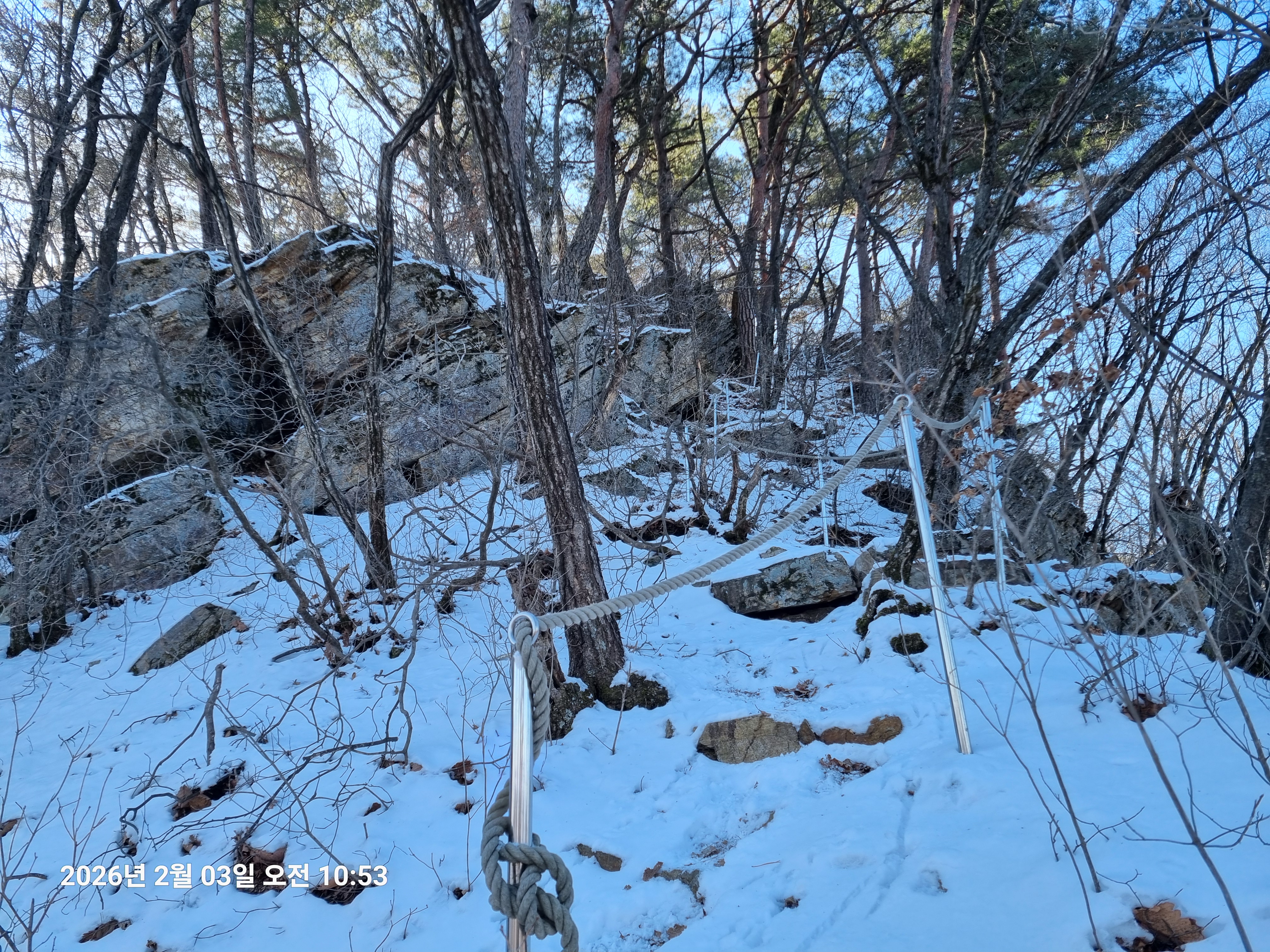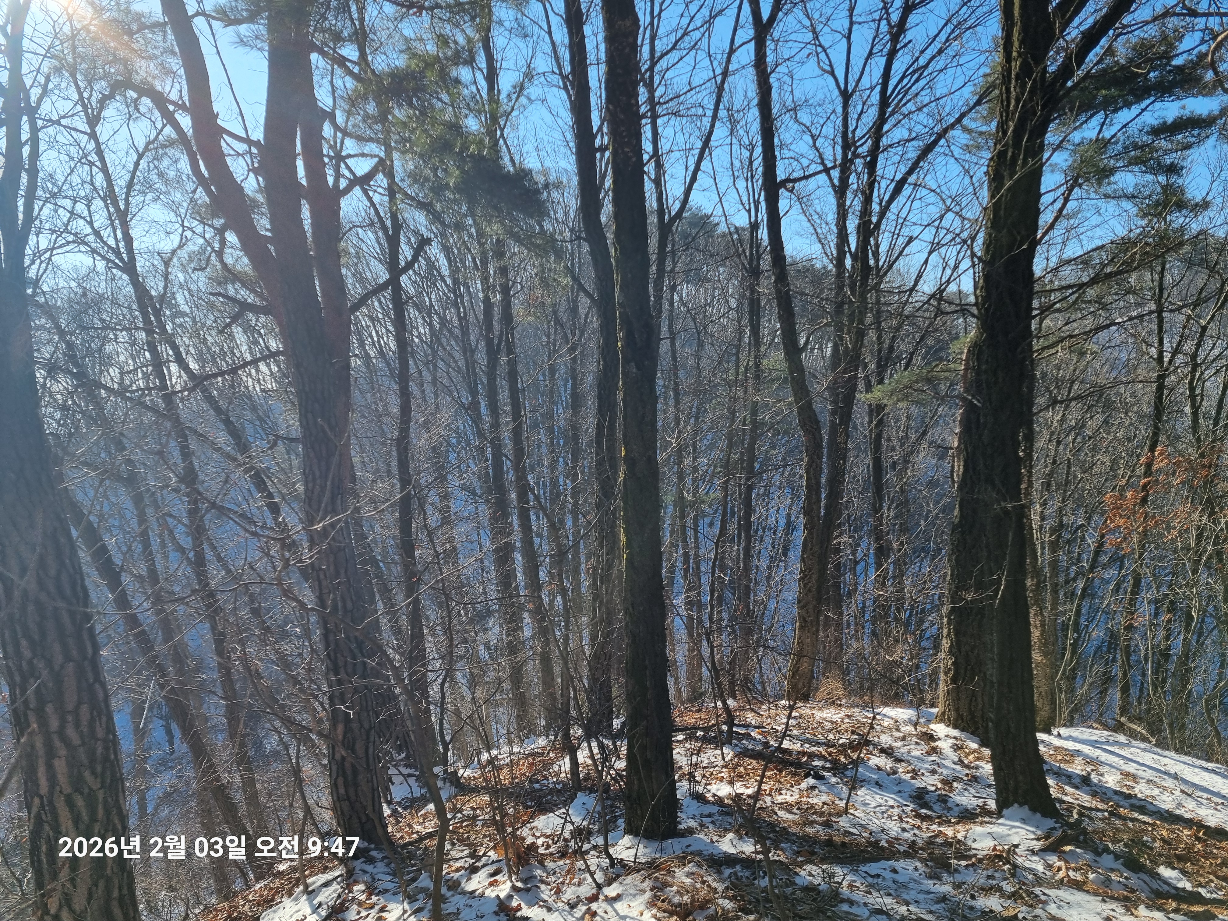 2026년 2월 3일. 화요일. 아침에는 영하 10도로 내려가 추우나 한낮에는 영상기온으로 올라가서 따뜻하다. 눈이 내려 미끄러웠고 전반적인 등산로가 거칠었다.