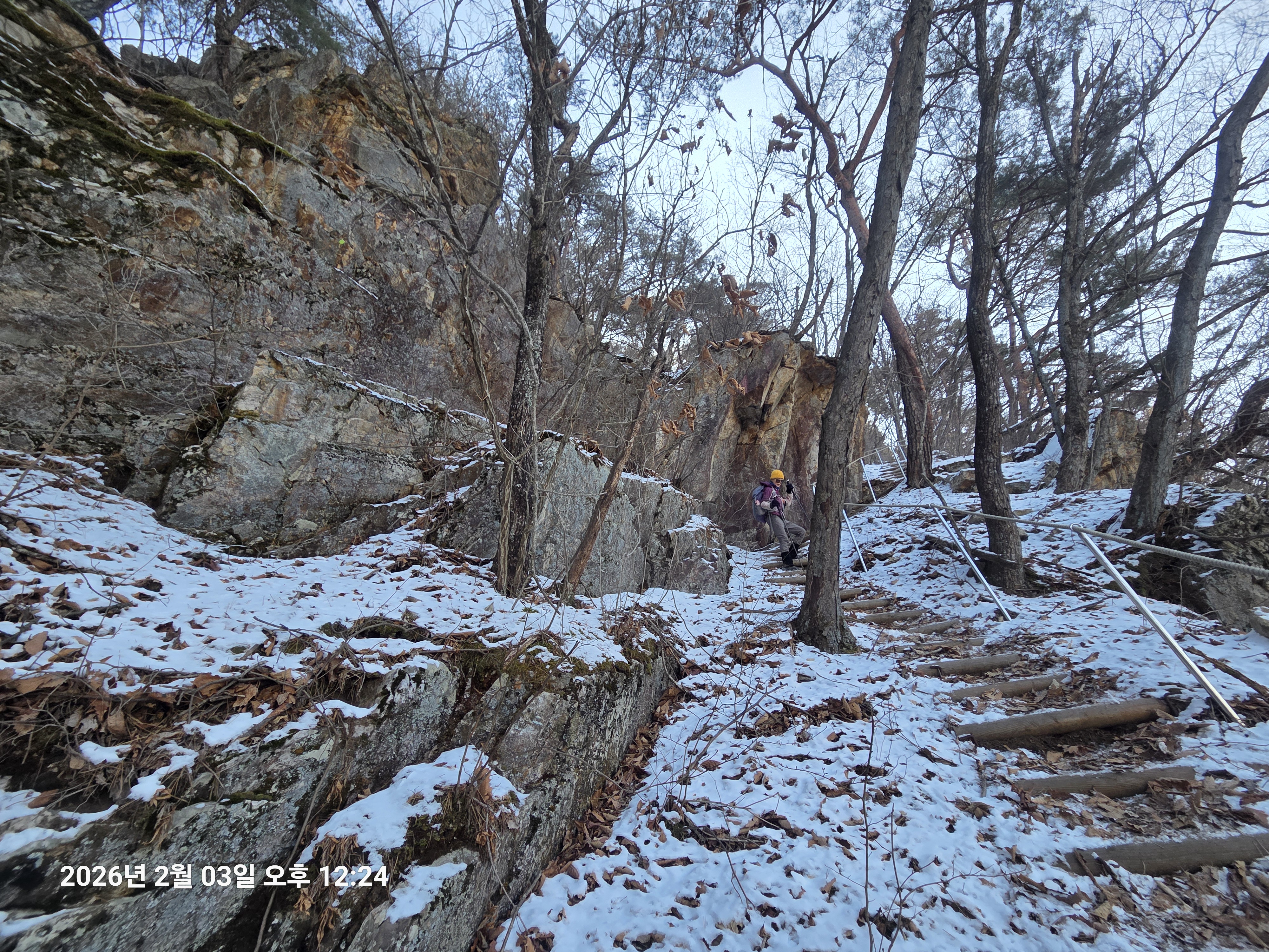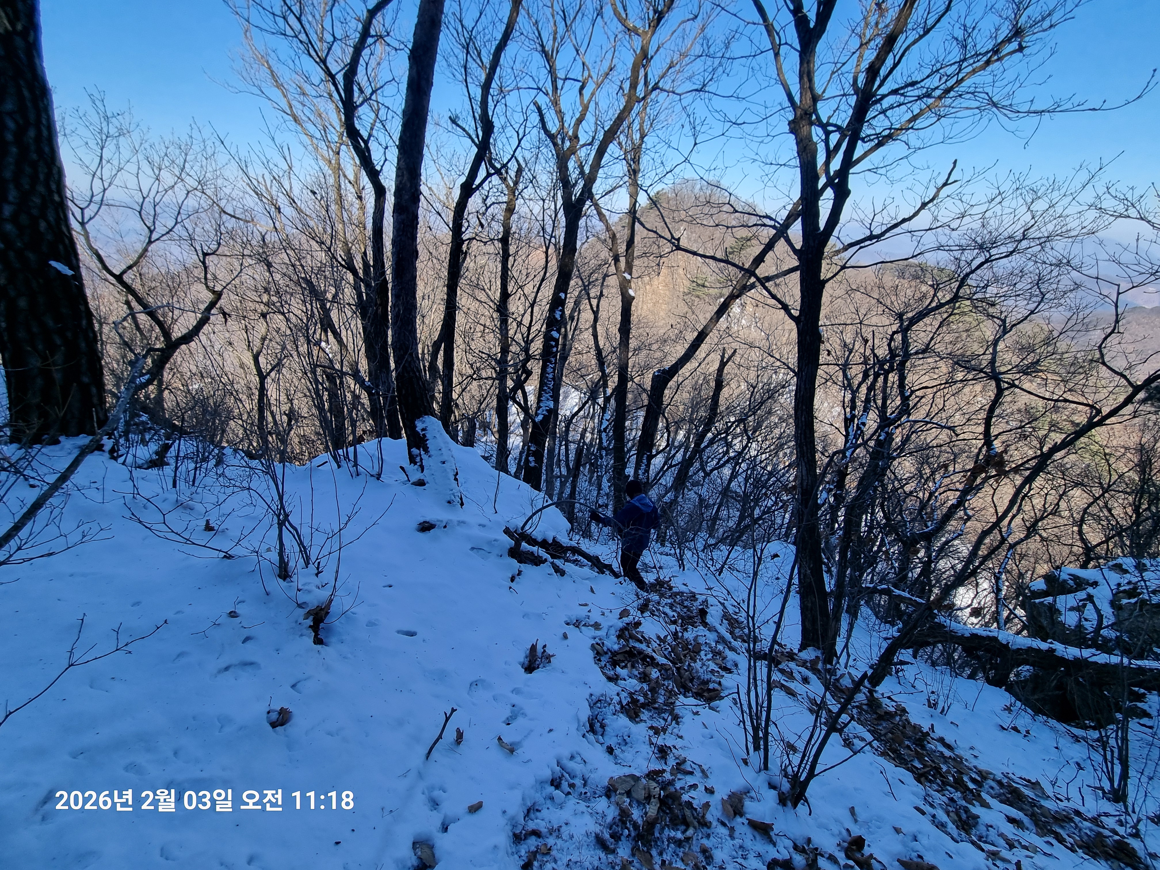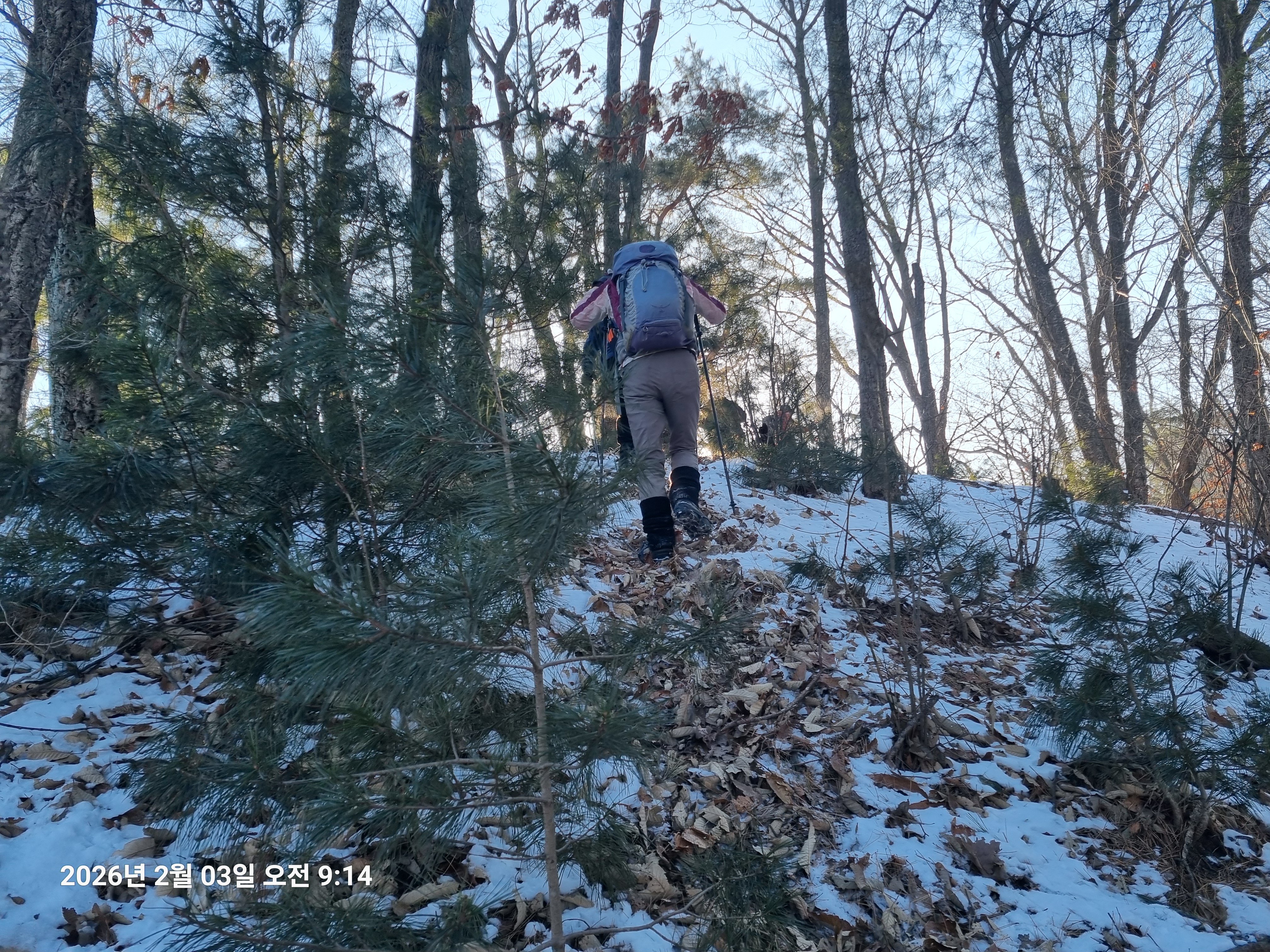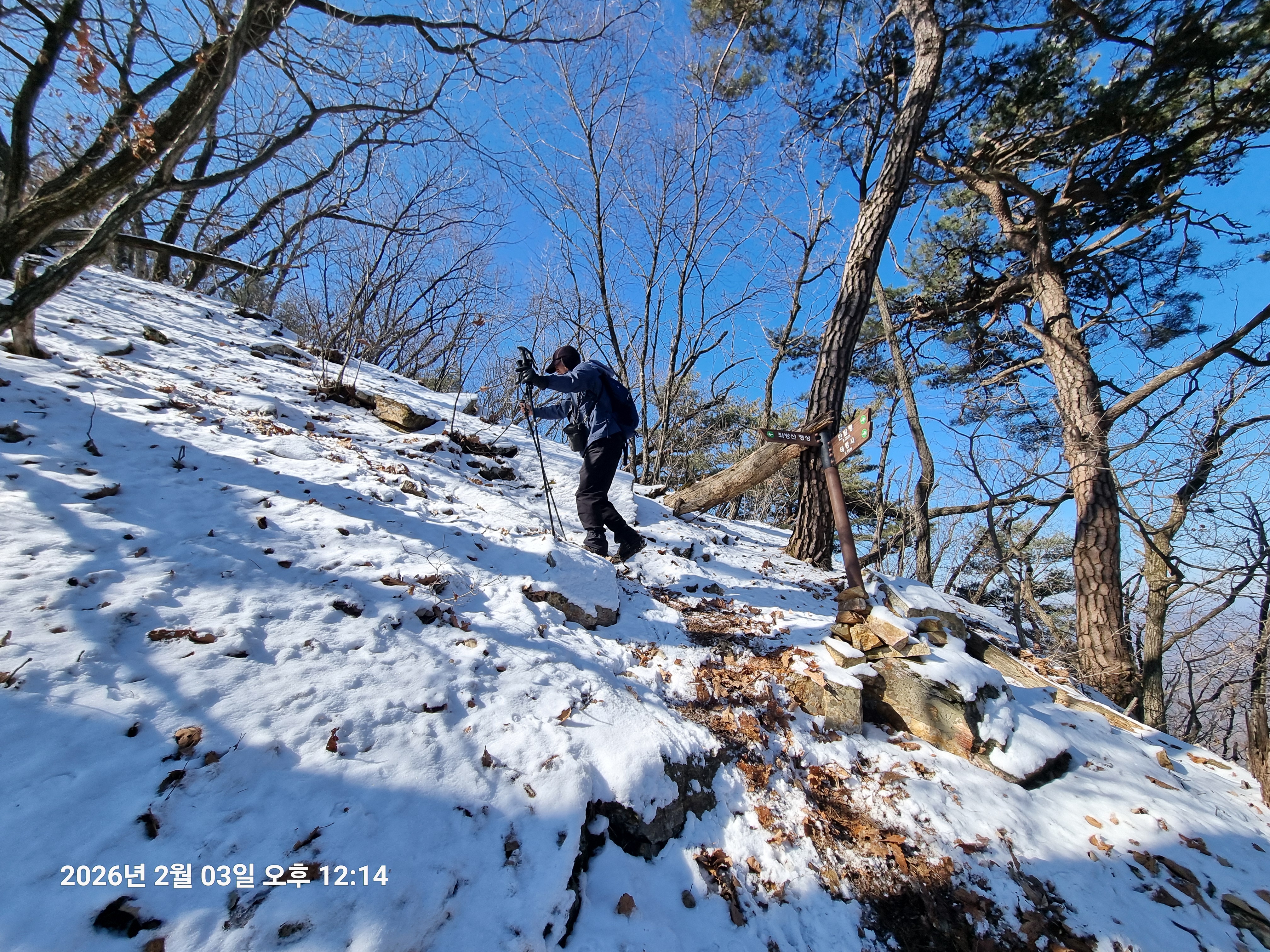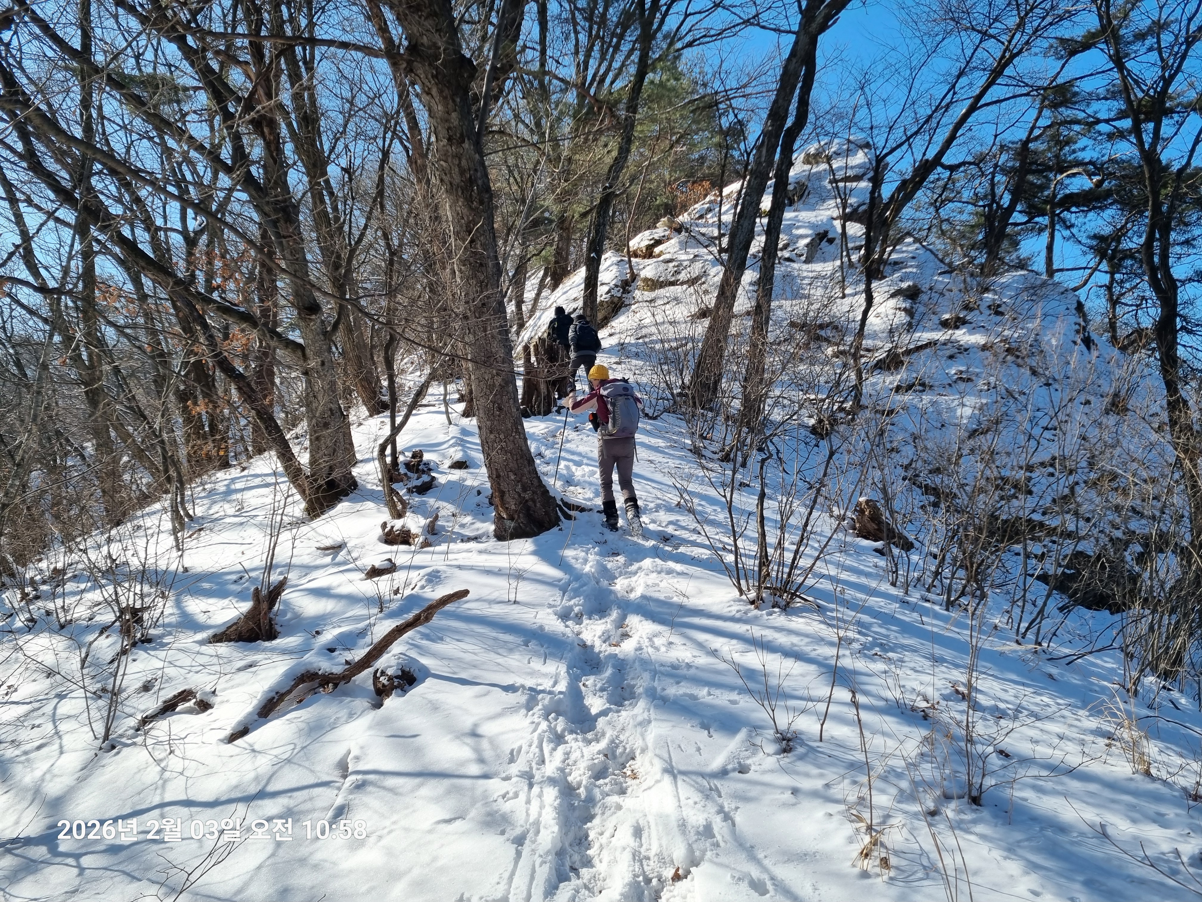 2026년 2월 3일. 화요일. 아침에는 영하 10도로 내려가 추우나 한낮에는 영상기온으로 올라가서 따뜻하다. 눈이 내려 미끄러웠고 전반적인 등산로가 거칠었다.