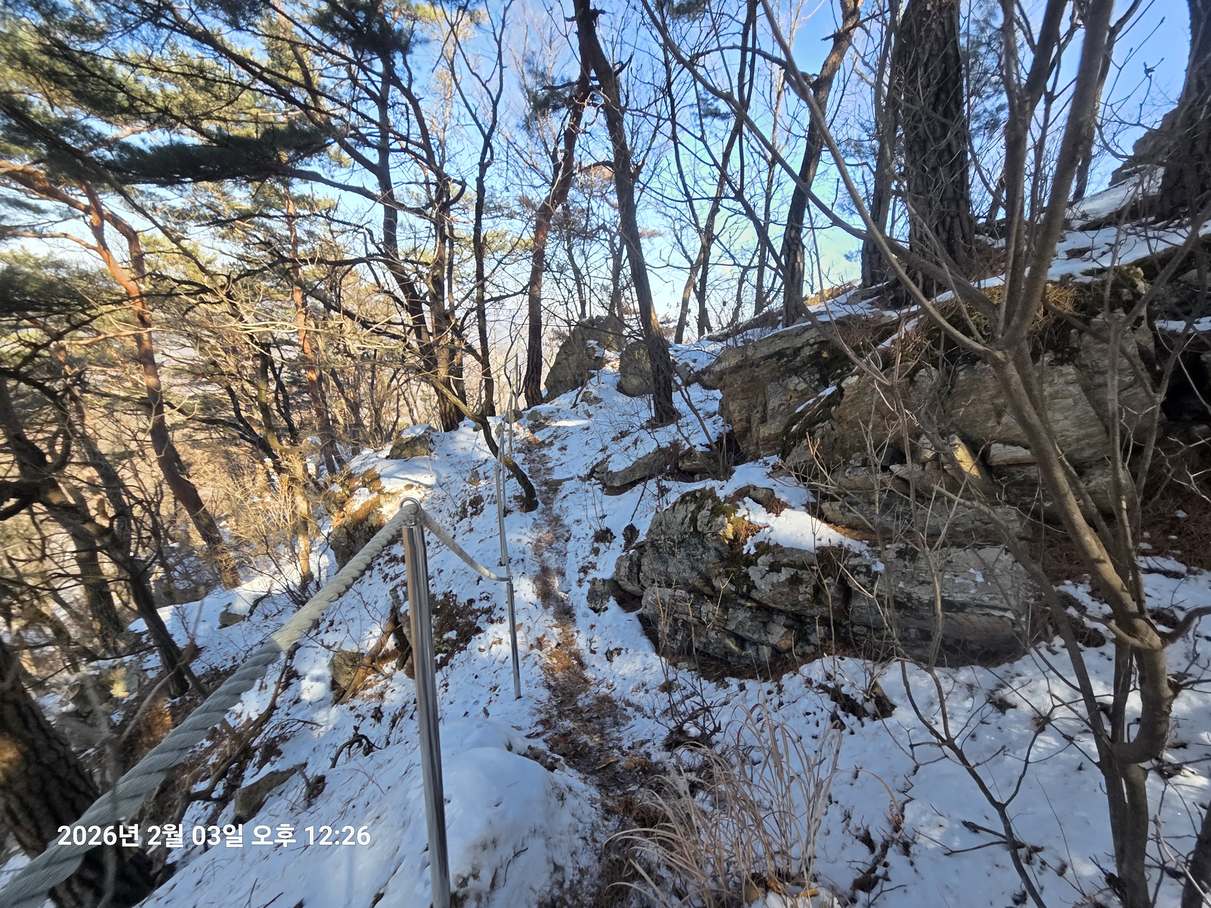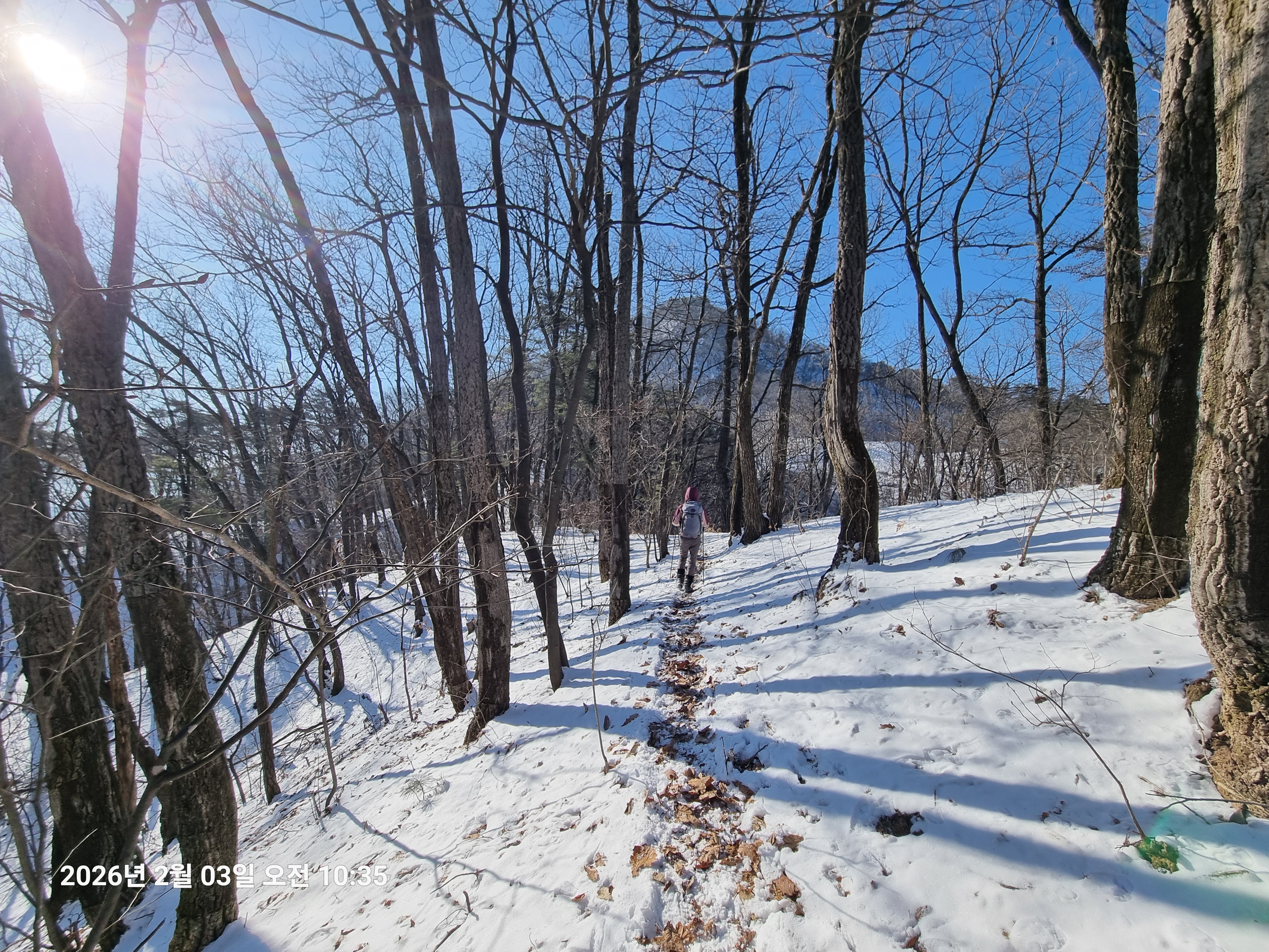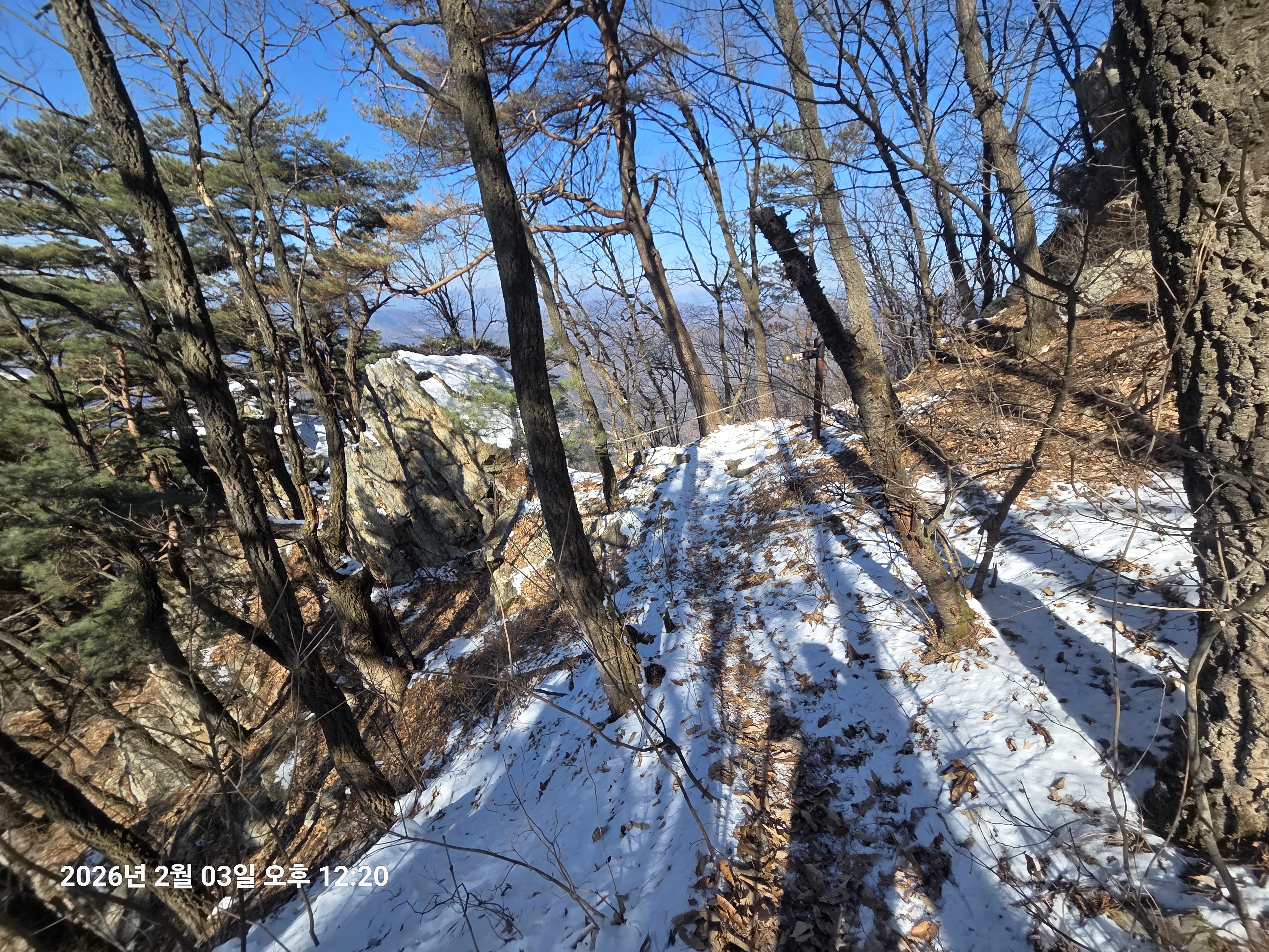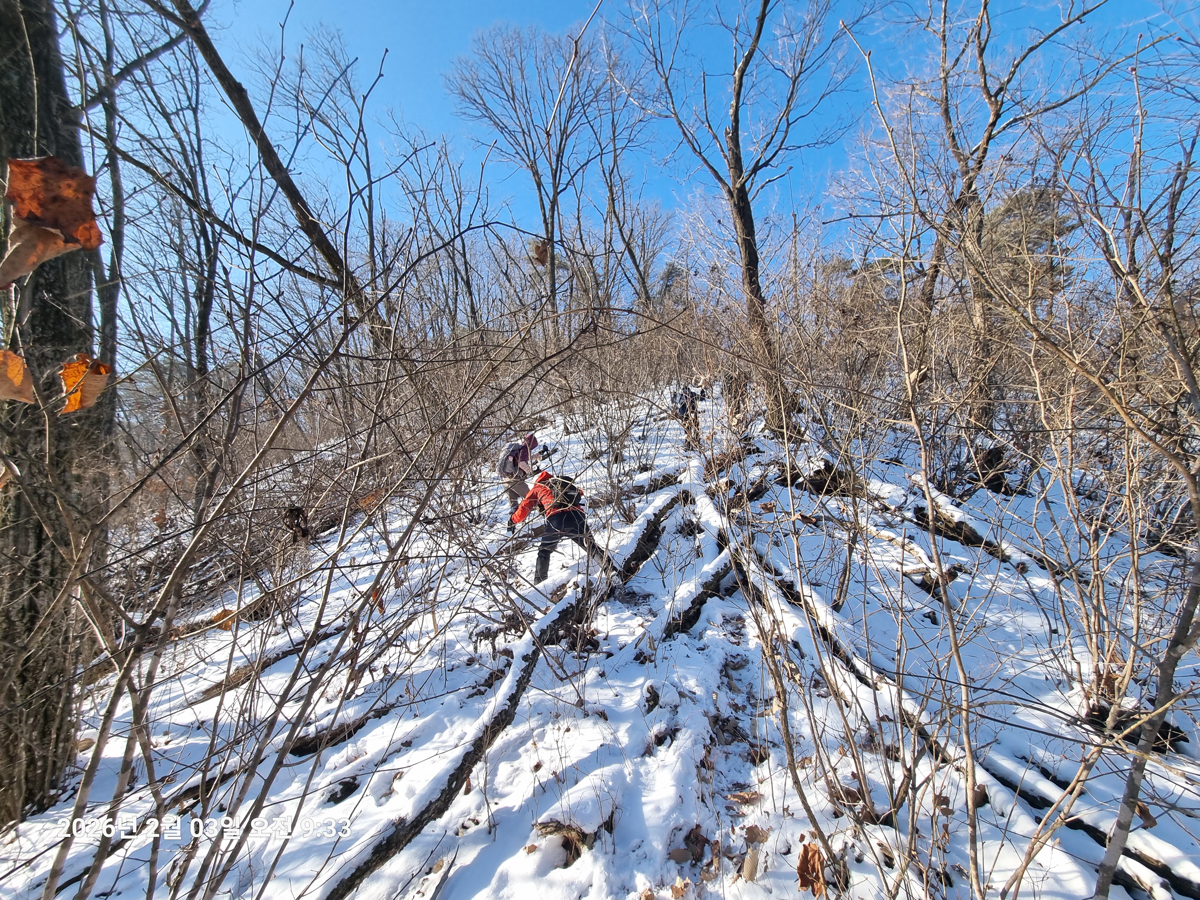 2026년 2월 3일. 화요일. 아침에는 영하 10도로 내려가 추우나 한낮에는 영상기온으로 올라가서 따뜻하다. 눈이 내려 미끄러웠고 전반적인 등산로가 거칠었다.