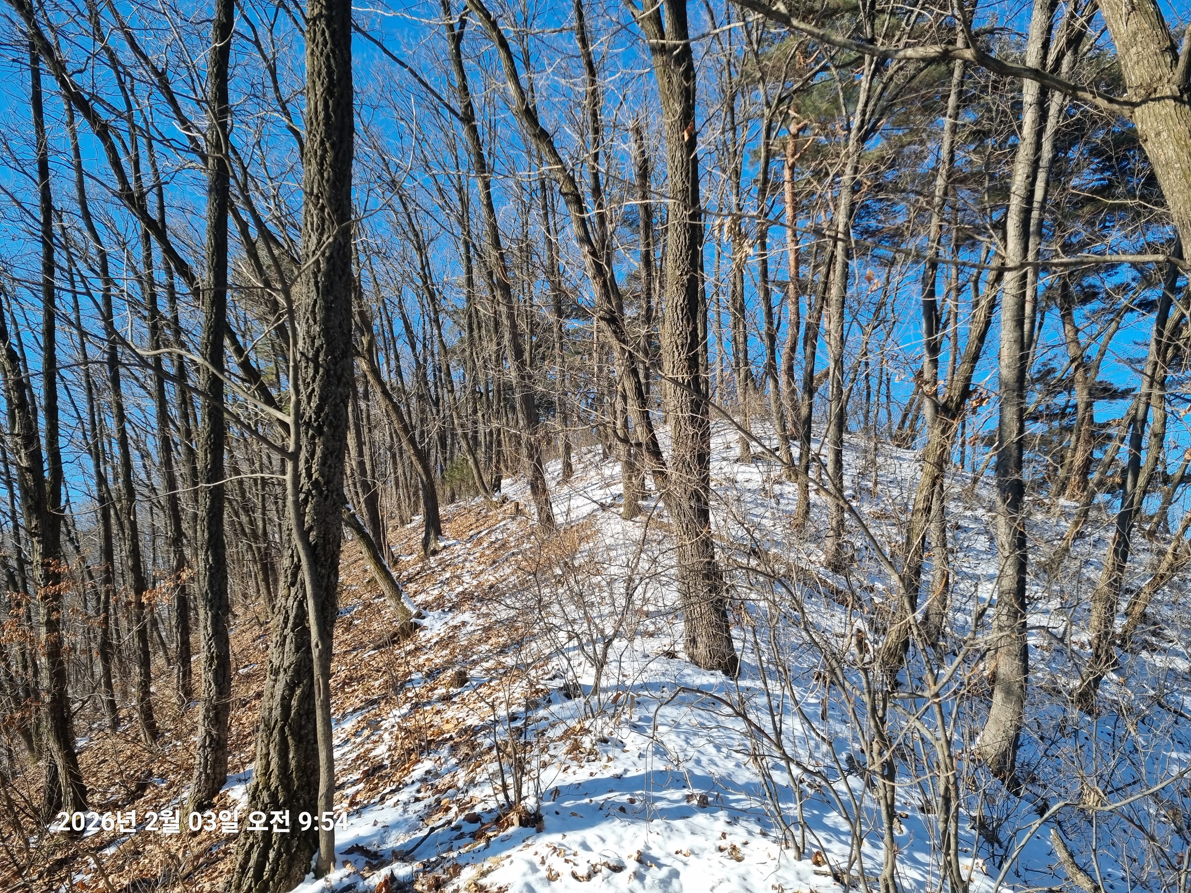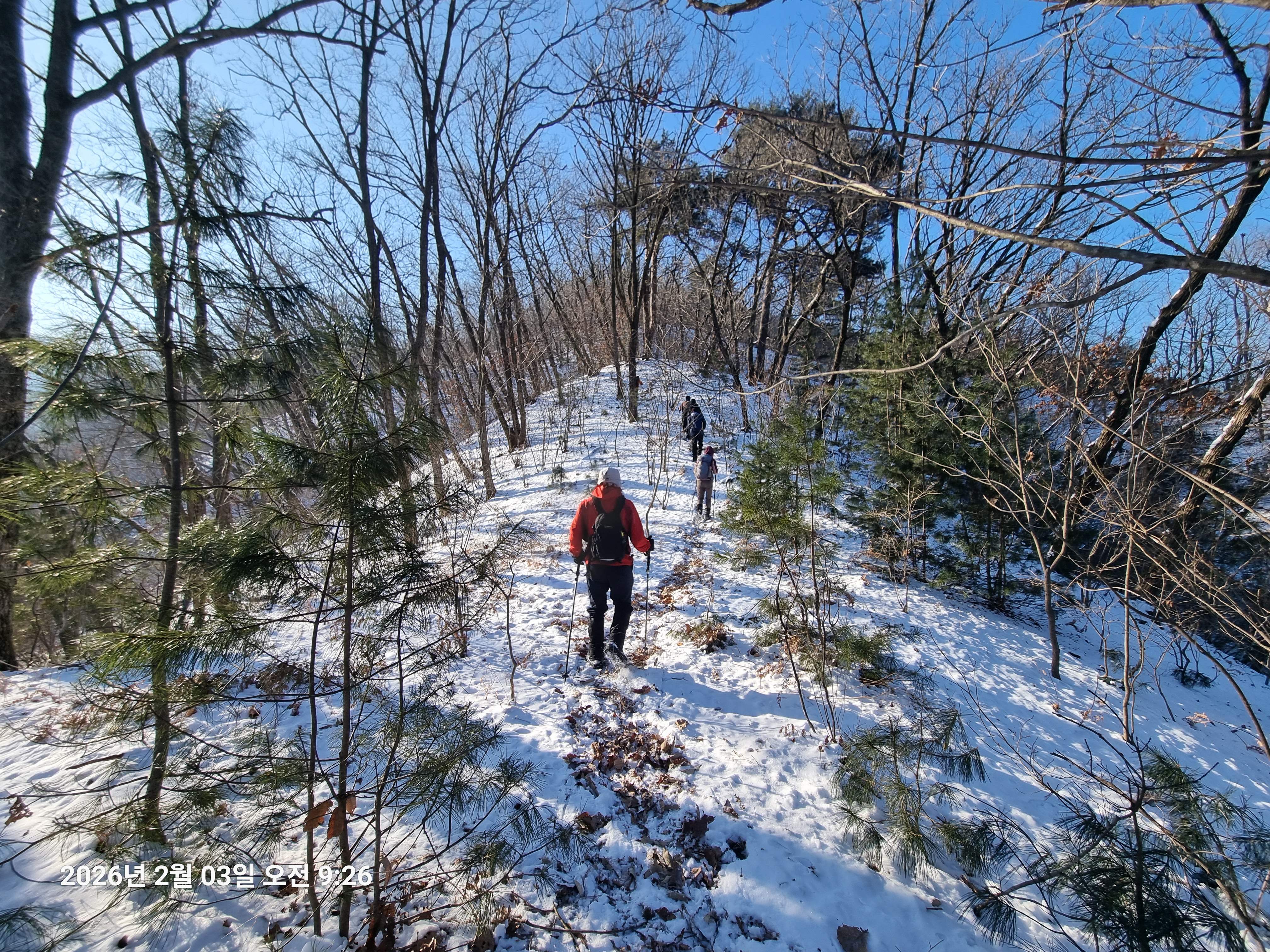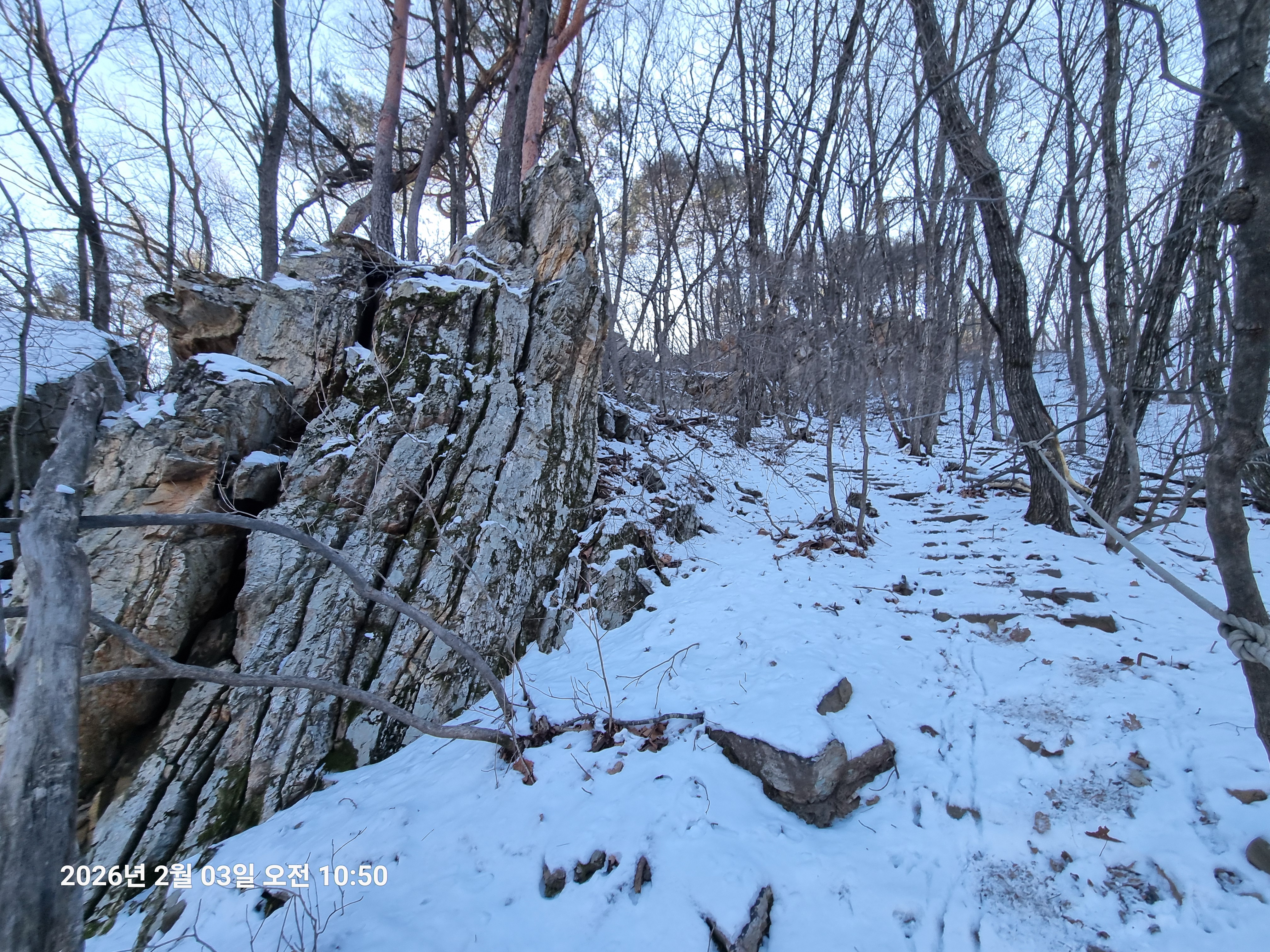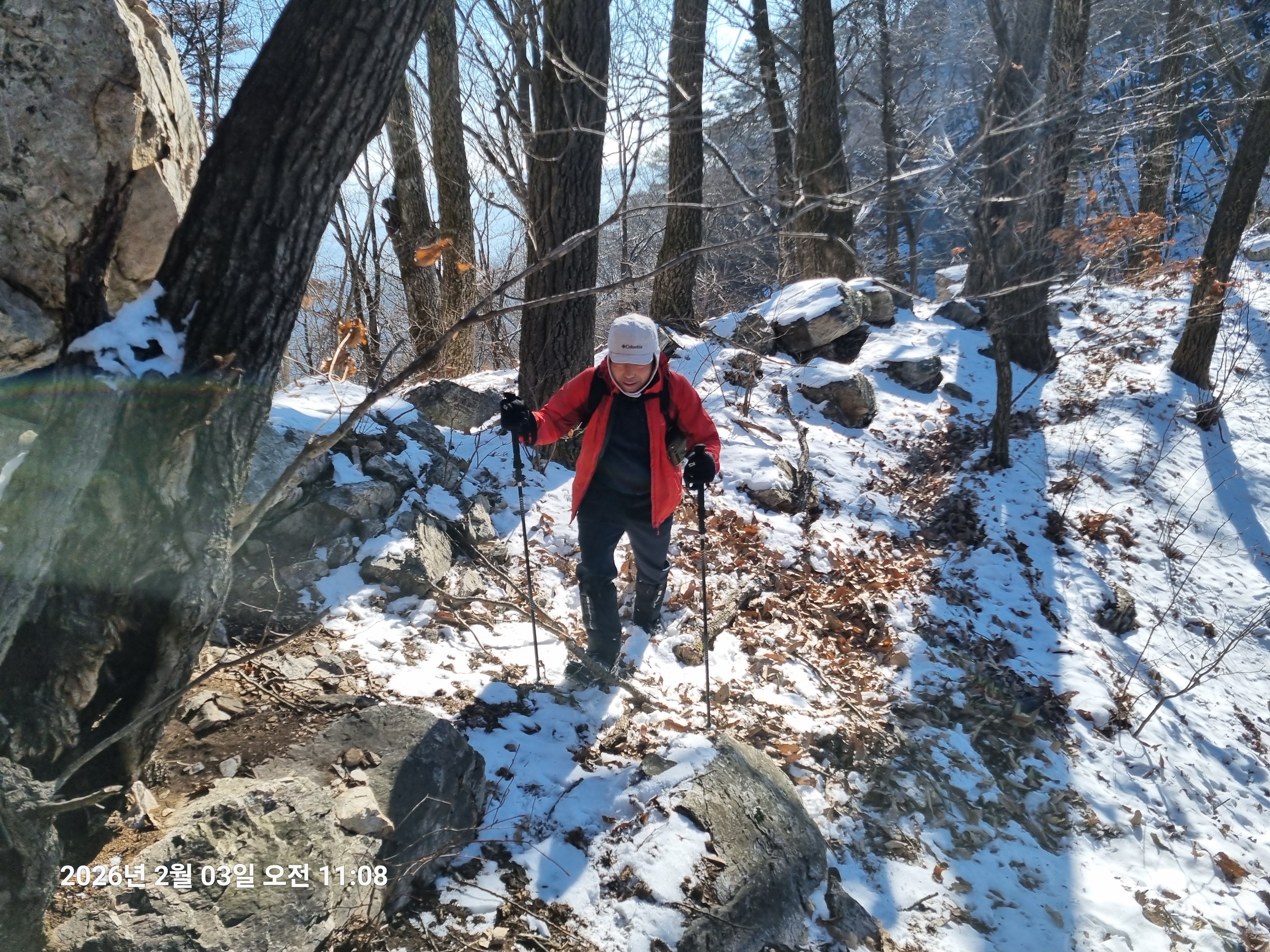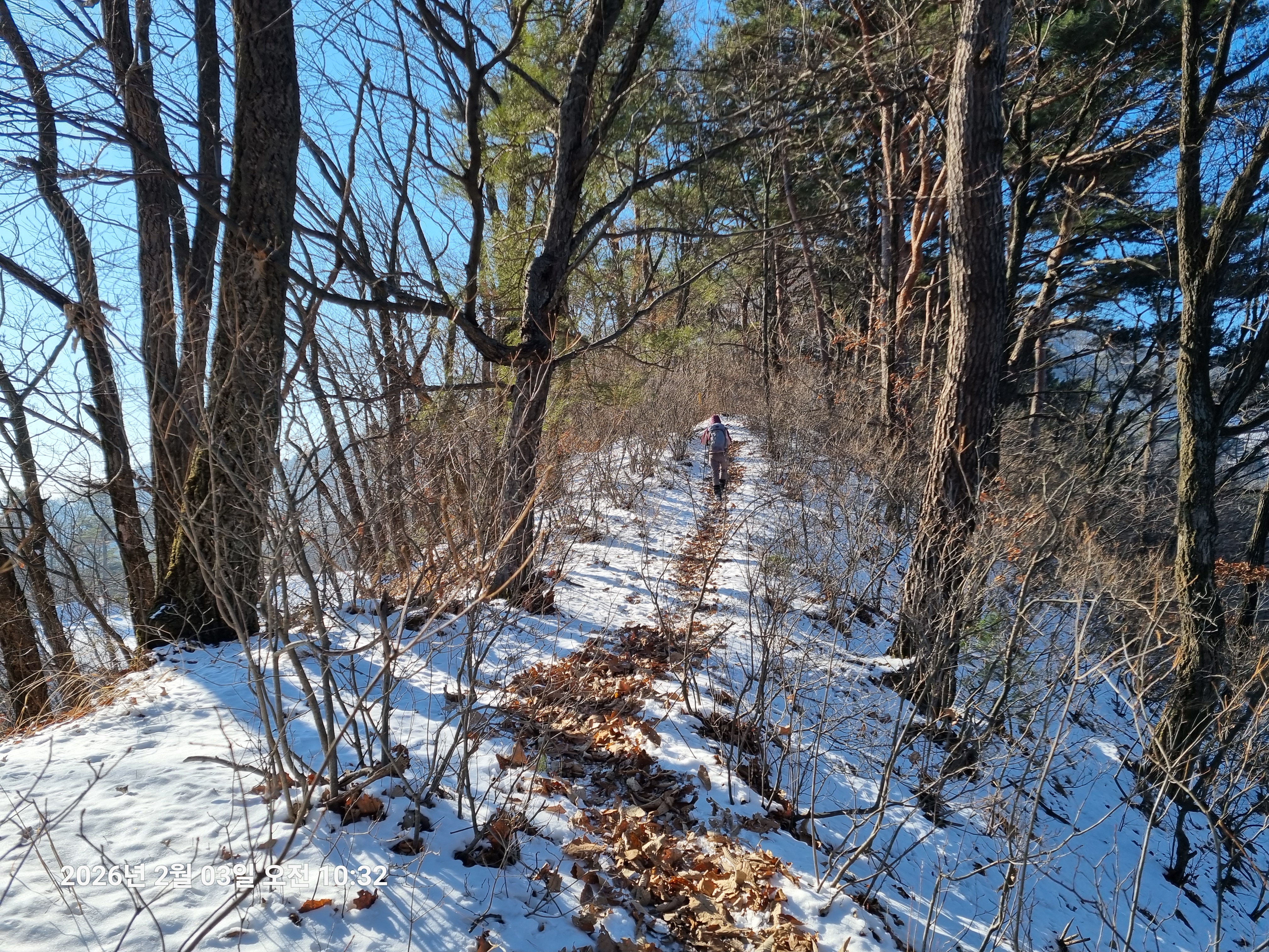 2026년 2월 3일. 화요일. 아침에는 영하 10도로 내려가 추우나 한낮에는 영상기온으로 올라가서 따뜻하다. 눈이 내려 미끄러웠고 전반적인 등산로가 거칠었다.
