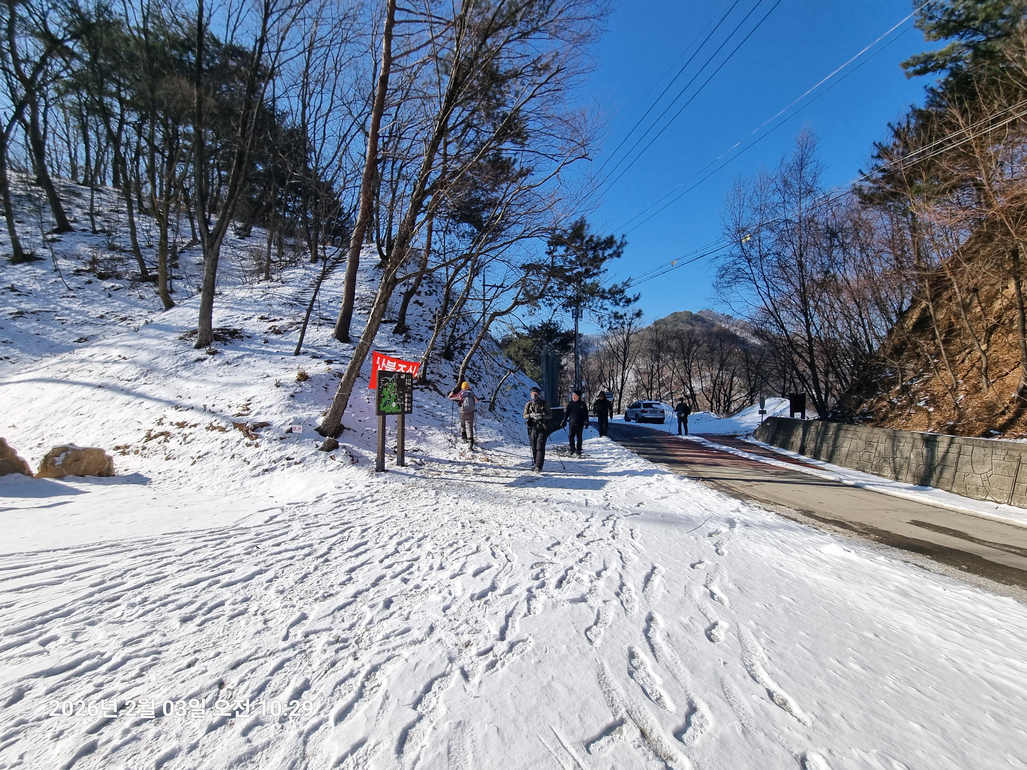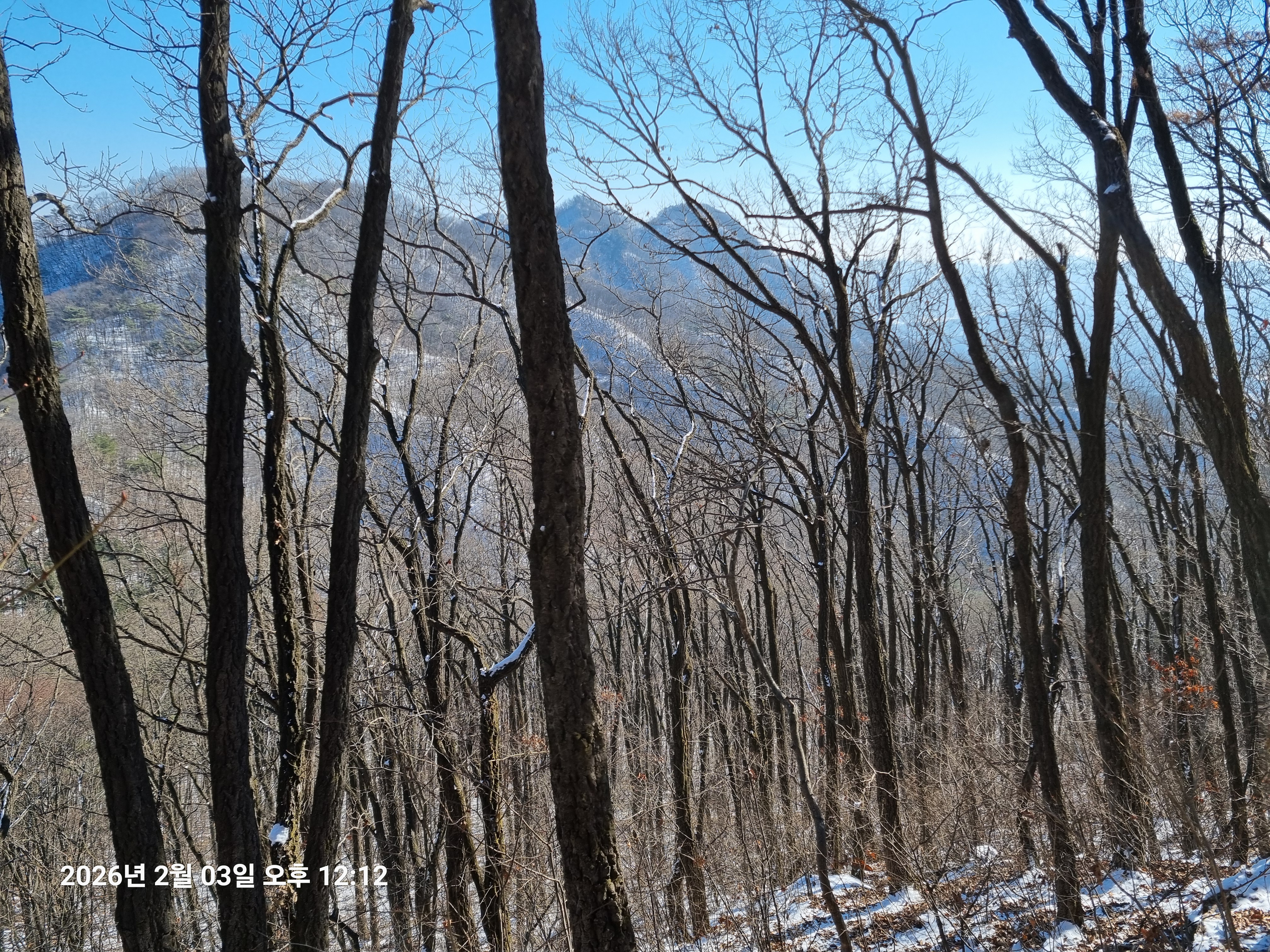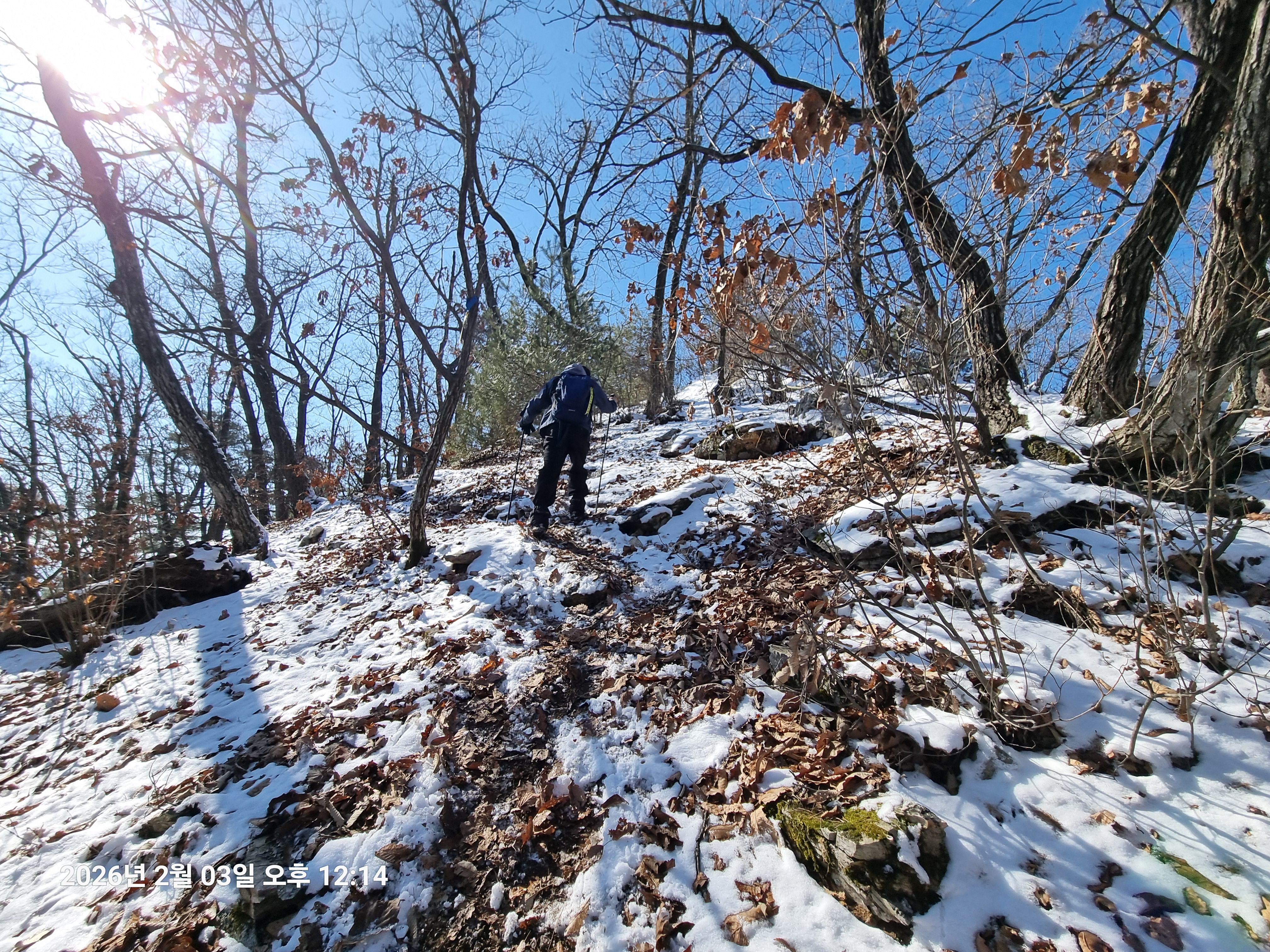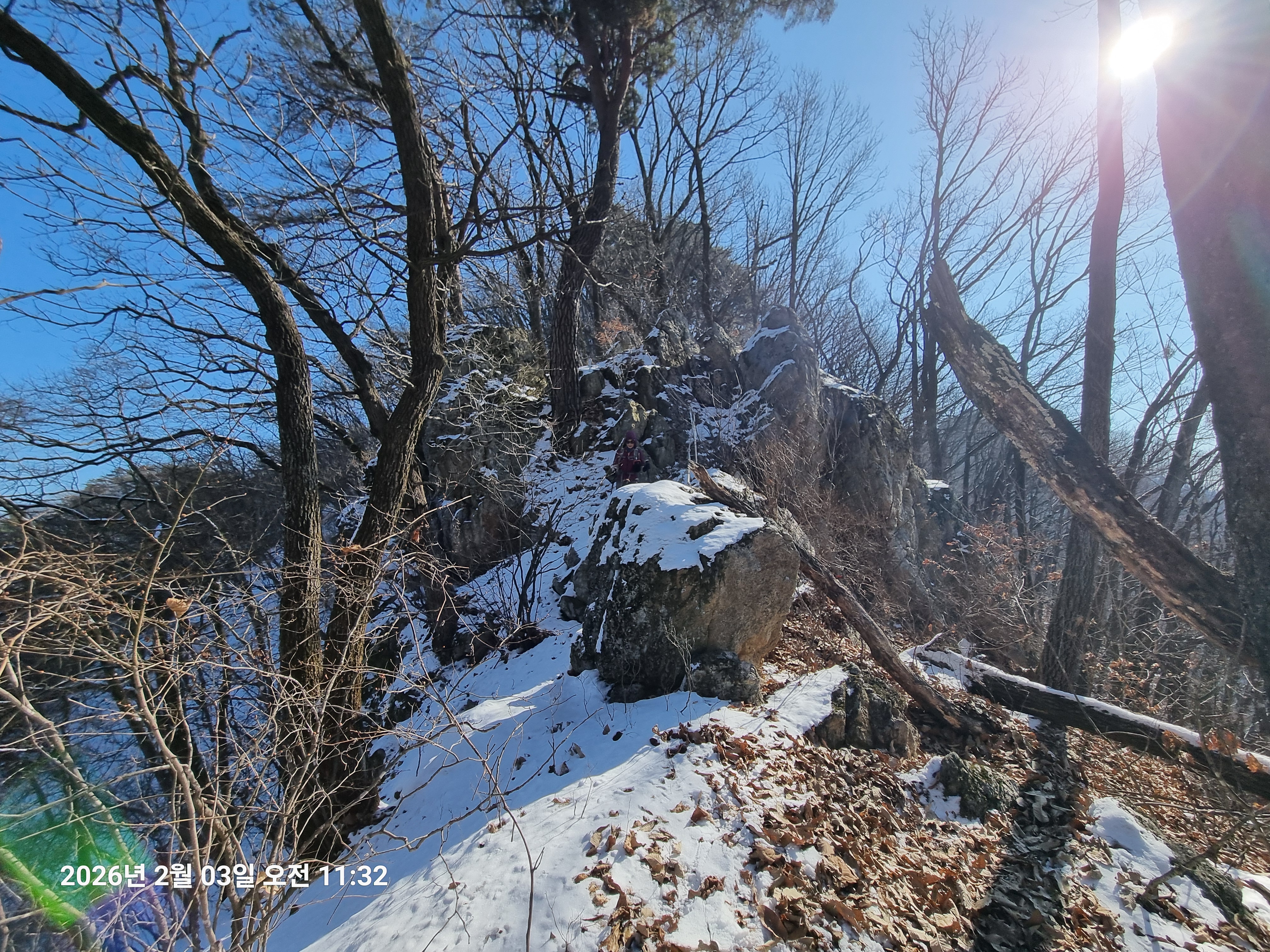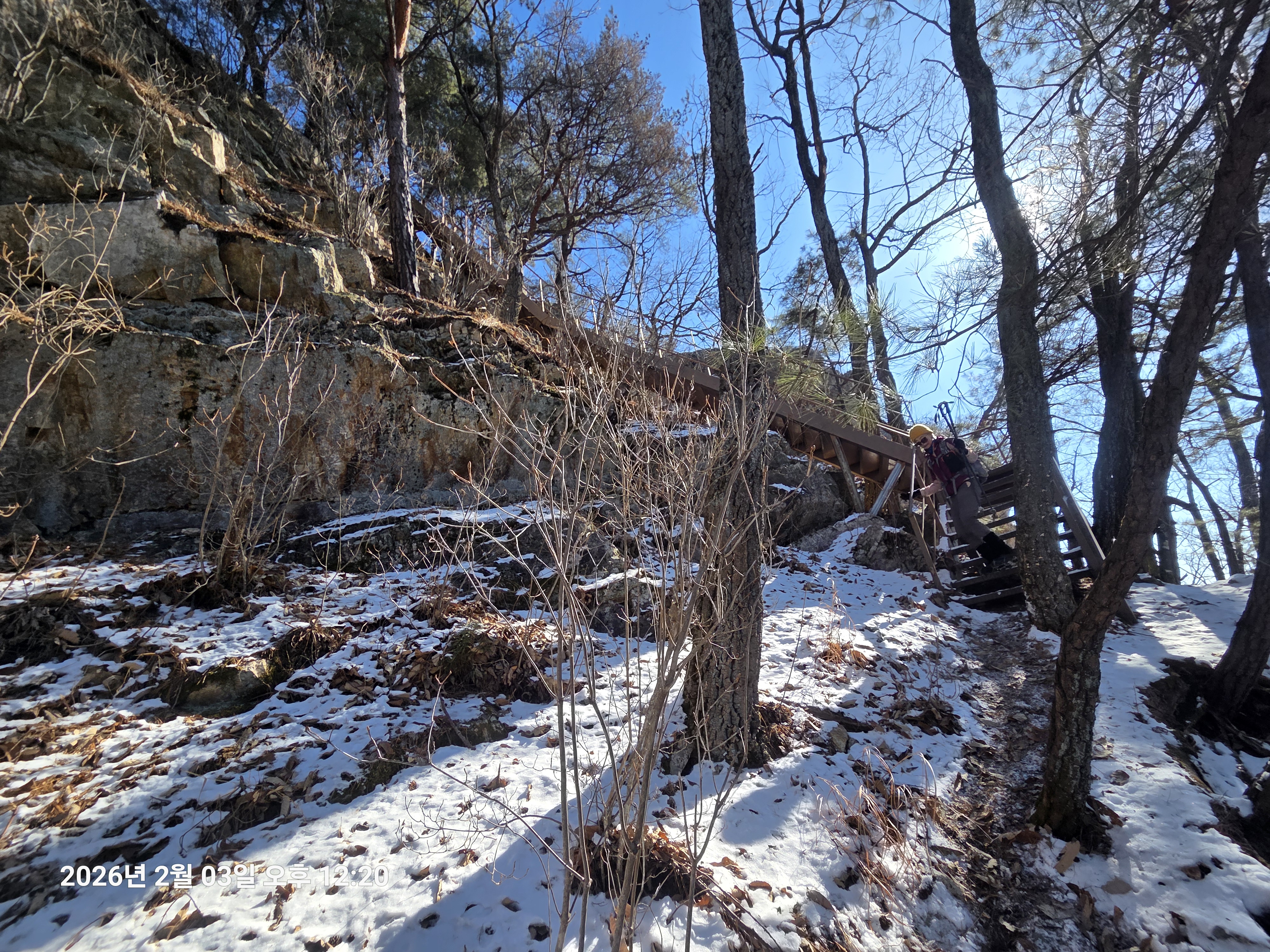 2026년 2월 3일. 화요일. 아침에는 영하 10도로 내려가 추우나 한낮에는 영상기온으로 올라가서 따뜻하다. 눈이 내려 미끄러웠고 전반적인 등산로가 거칠었다.