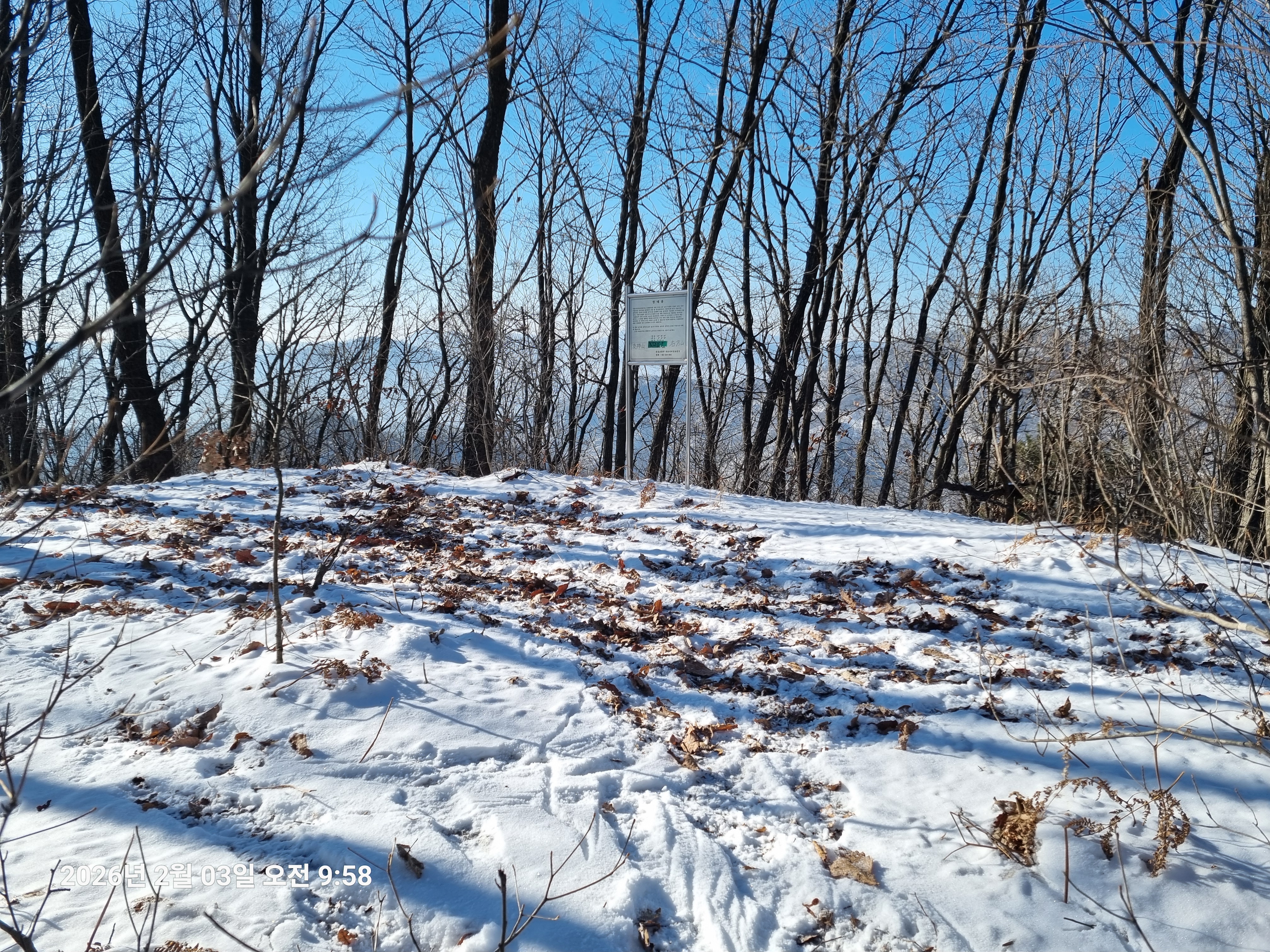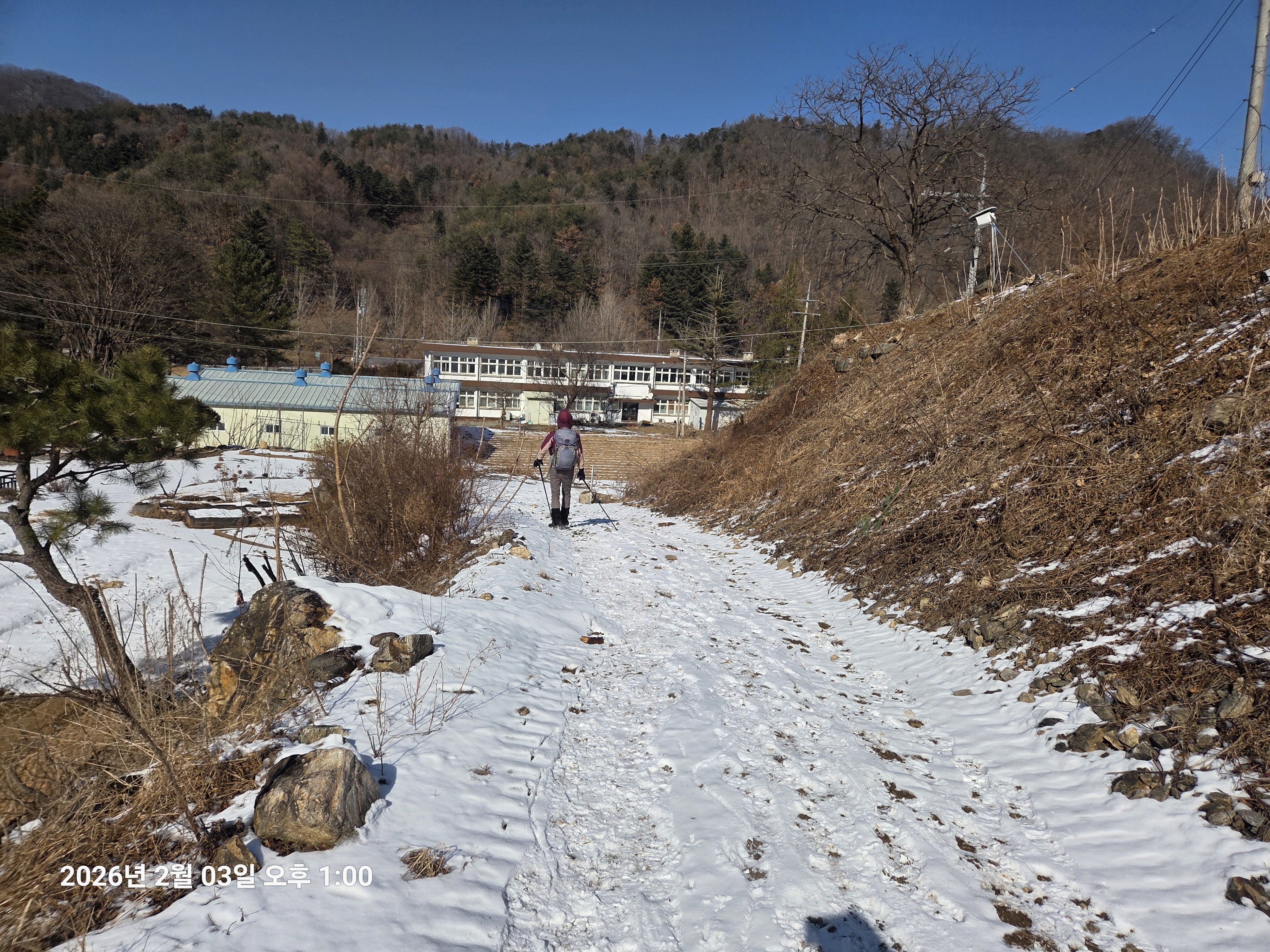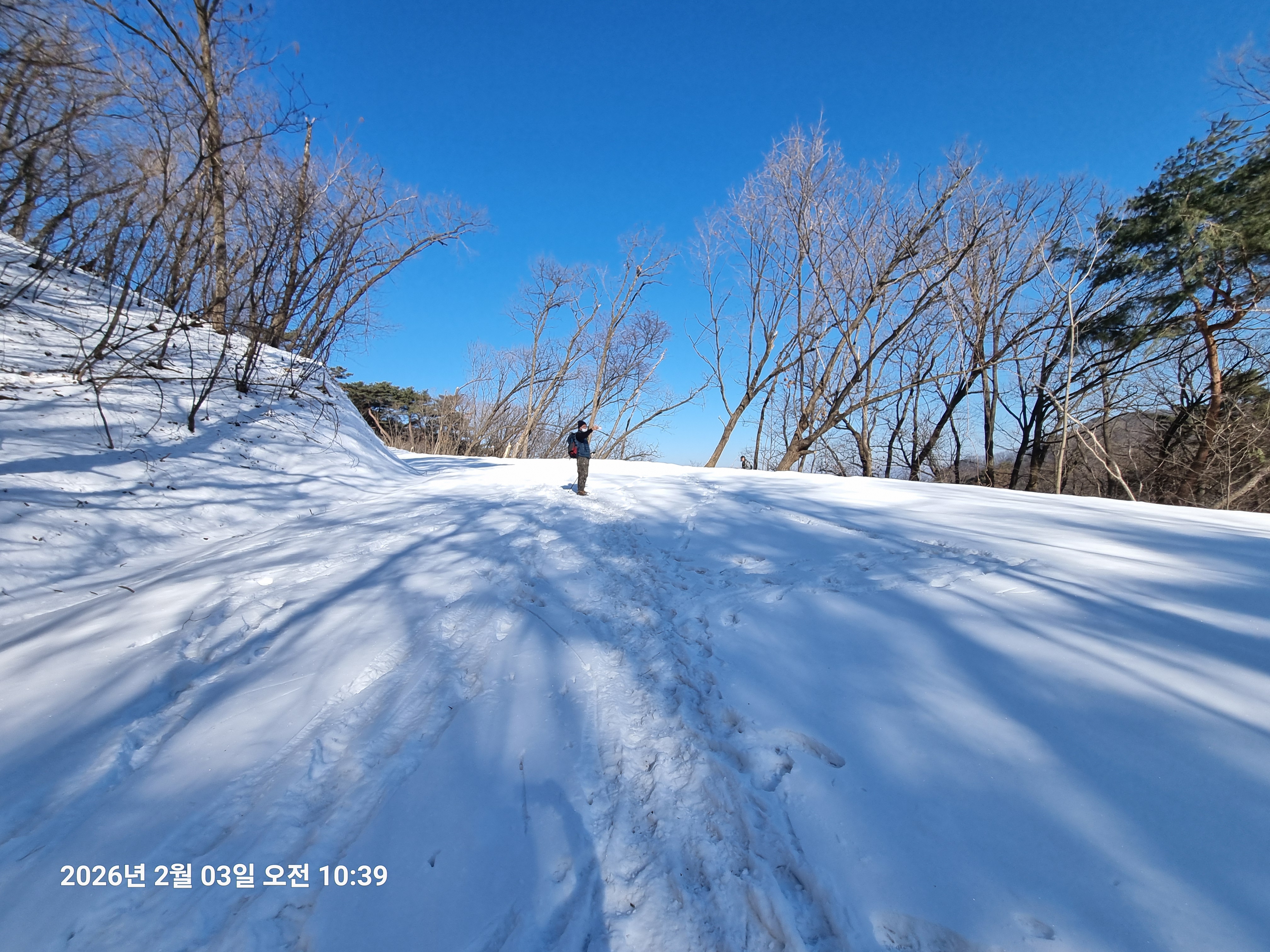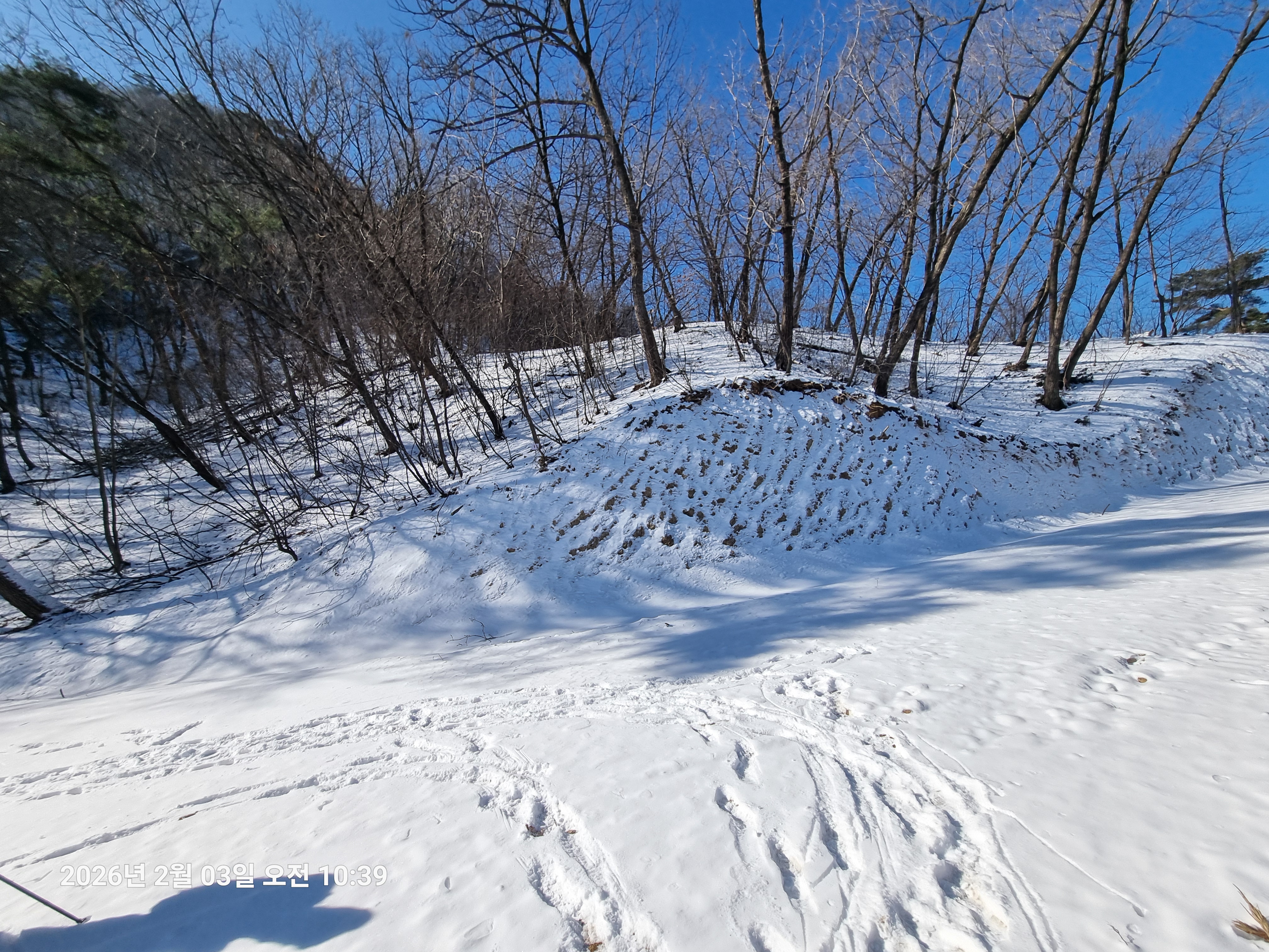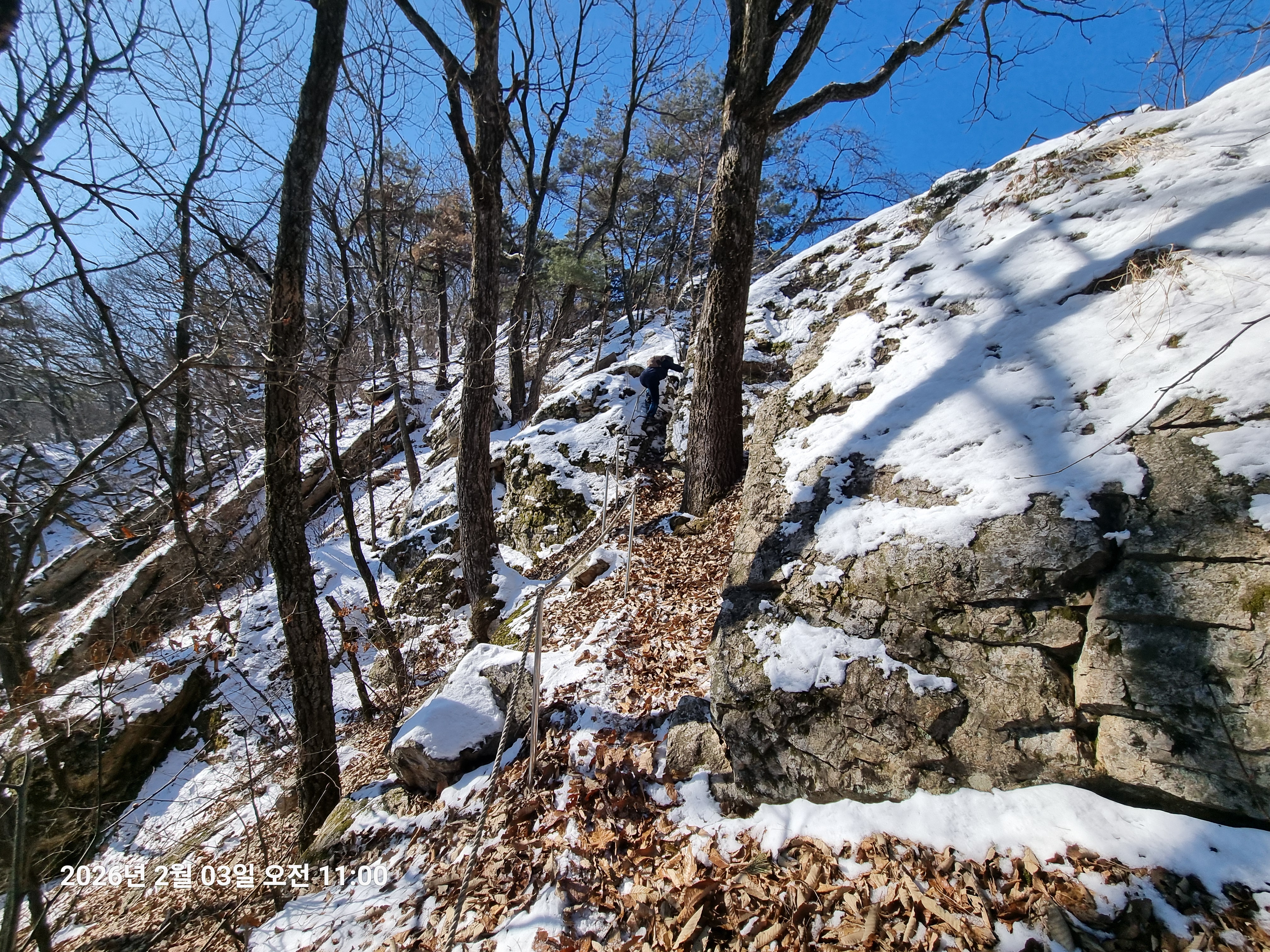 2026년 2월 3일. 화요일. 아침에는 영하 10도로 내려가 추우나 한낮에는 영상기온으로 올라가서 따뜻하다. 눈이 내려 미끄러웠고 전반적인 등산로가 거칠었다.