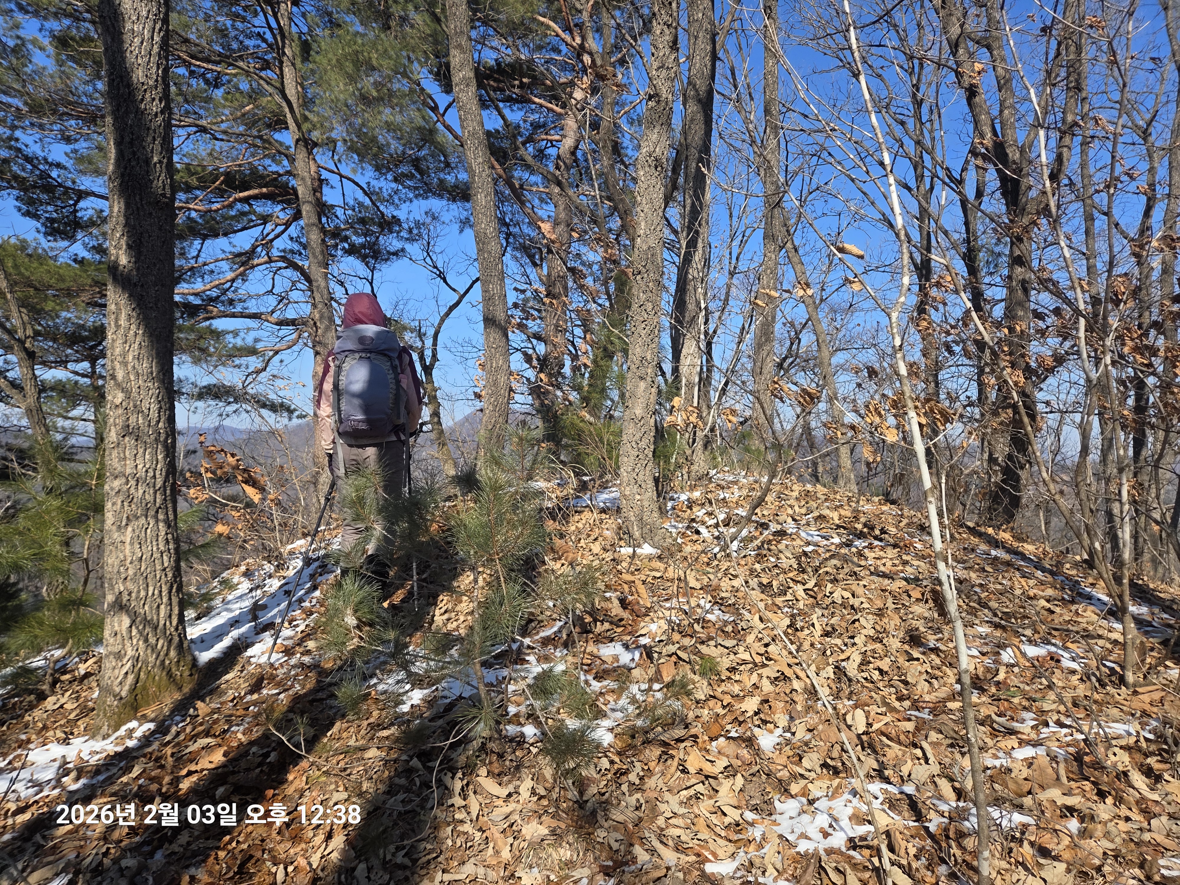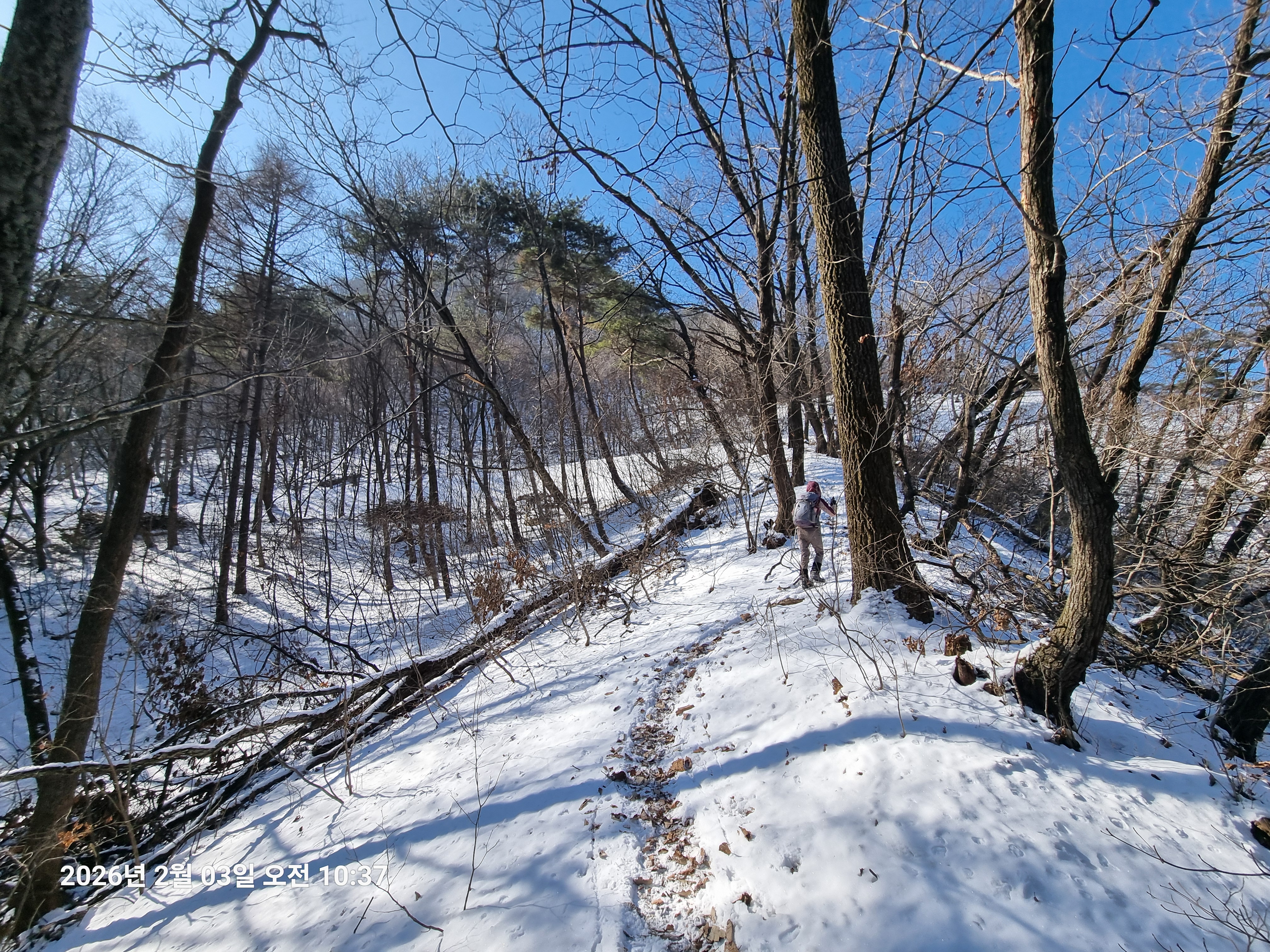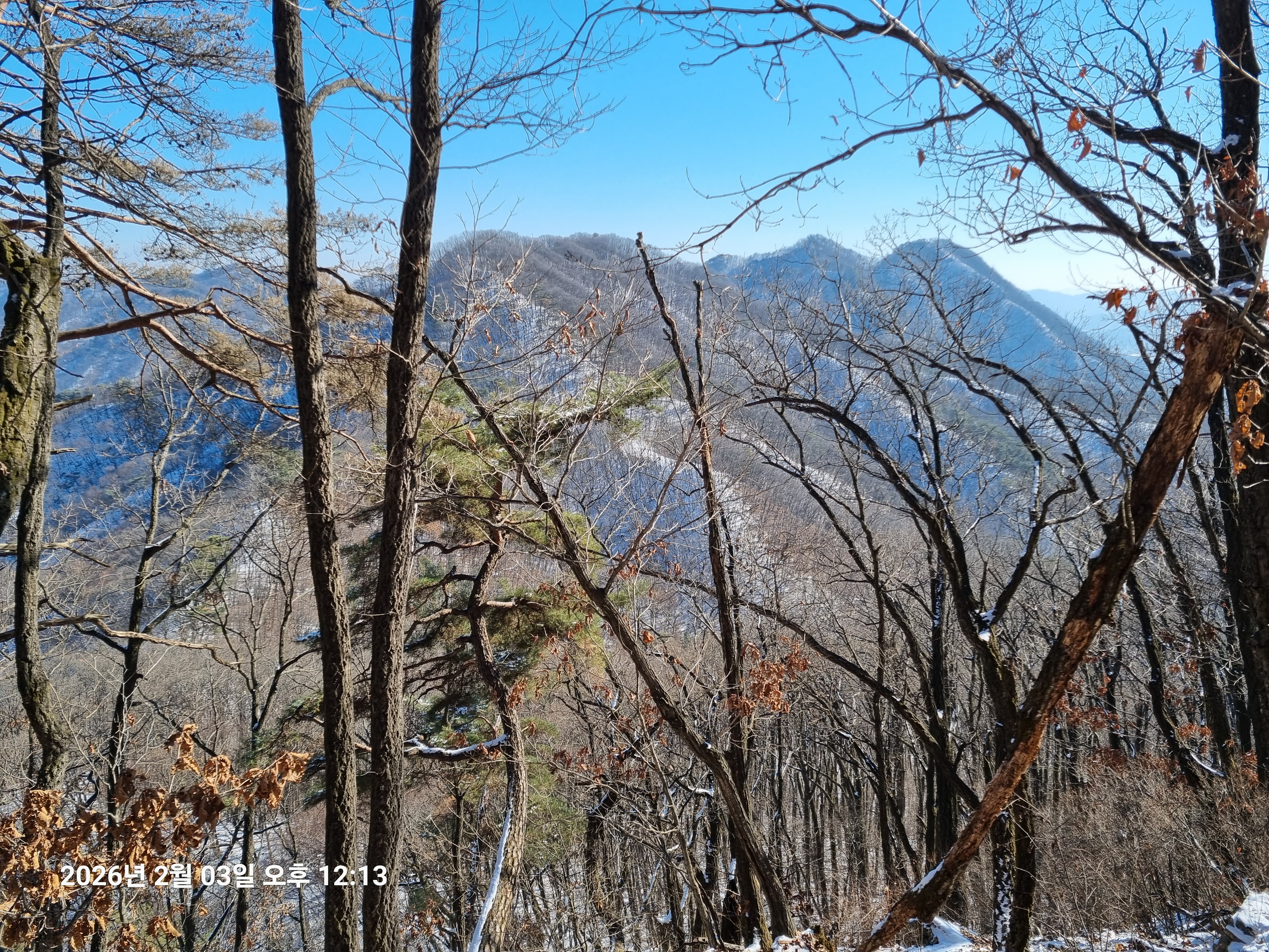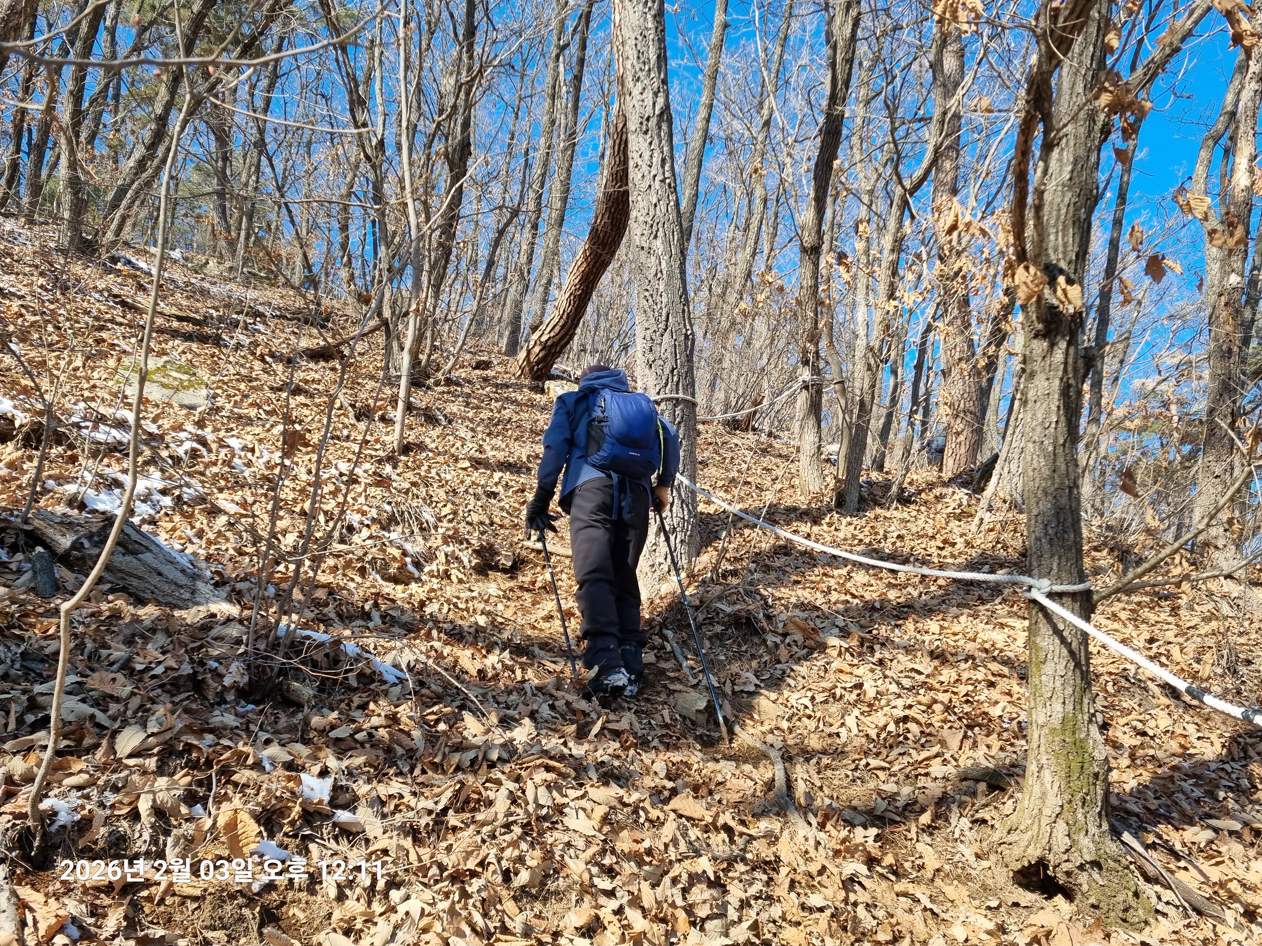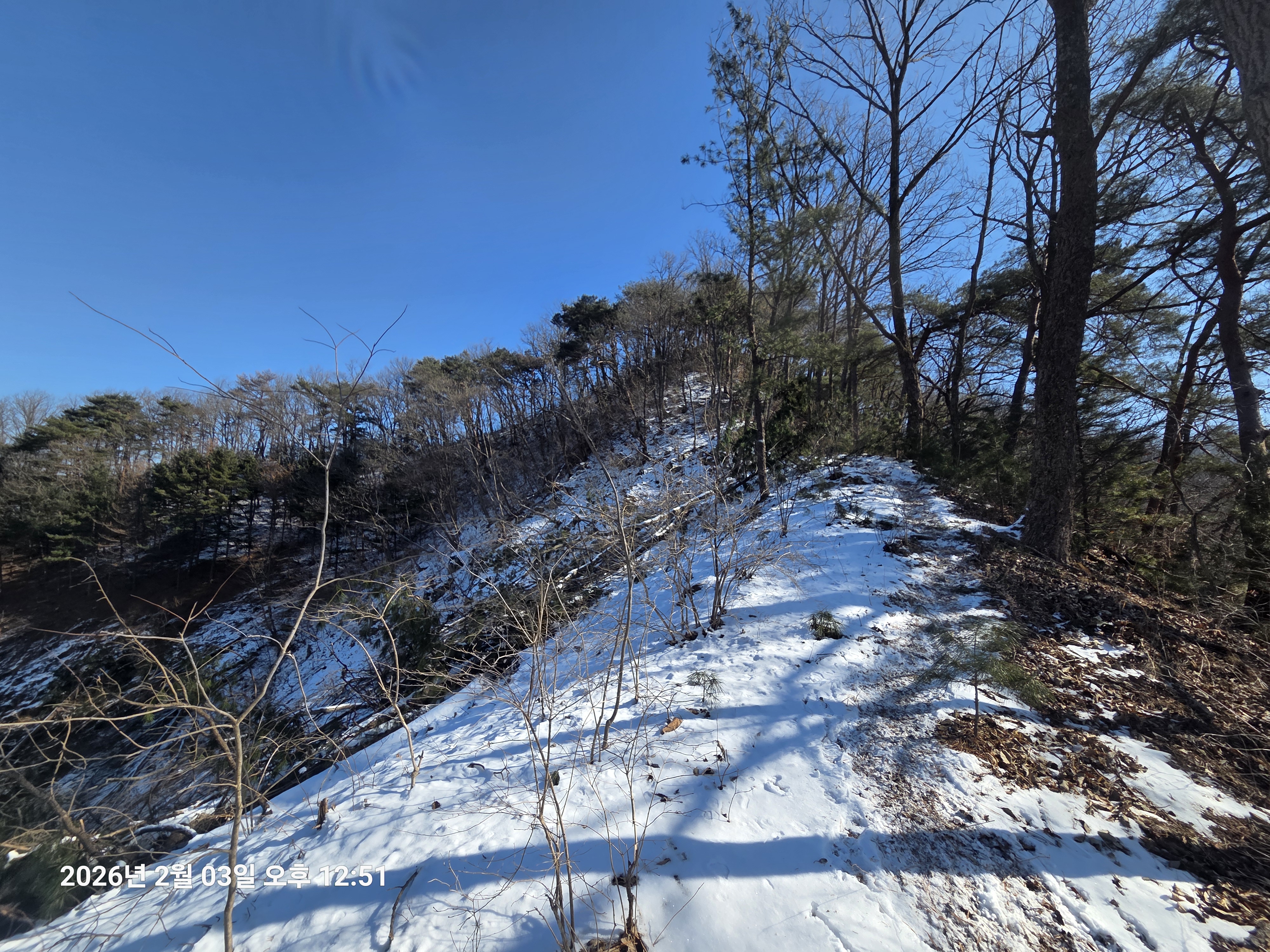 2026년 2월 3일. 화요일. 아침에는 영하 10도로 내려가 추우나 한낮에는 영상기온으로 올라가서 따뜻하다. 눈이 내려 미끄러웠고 전반적인 등산로가 거칠었다.