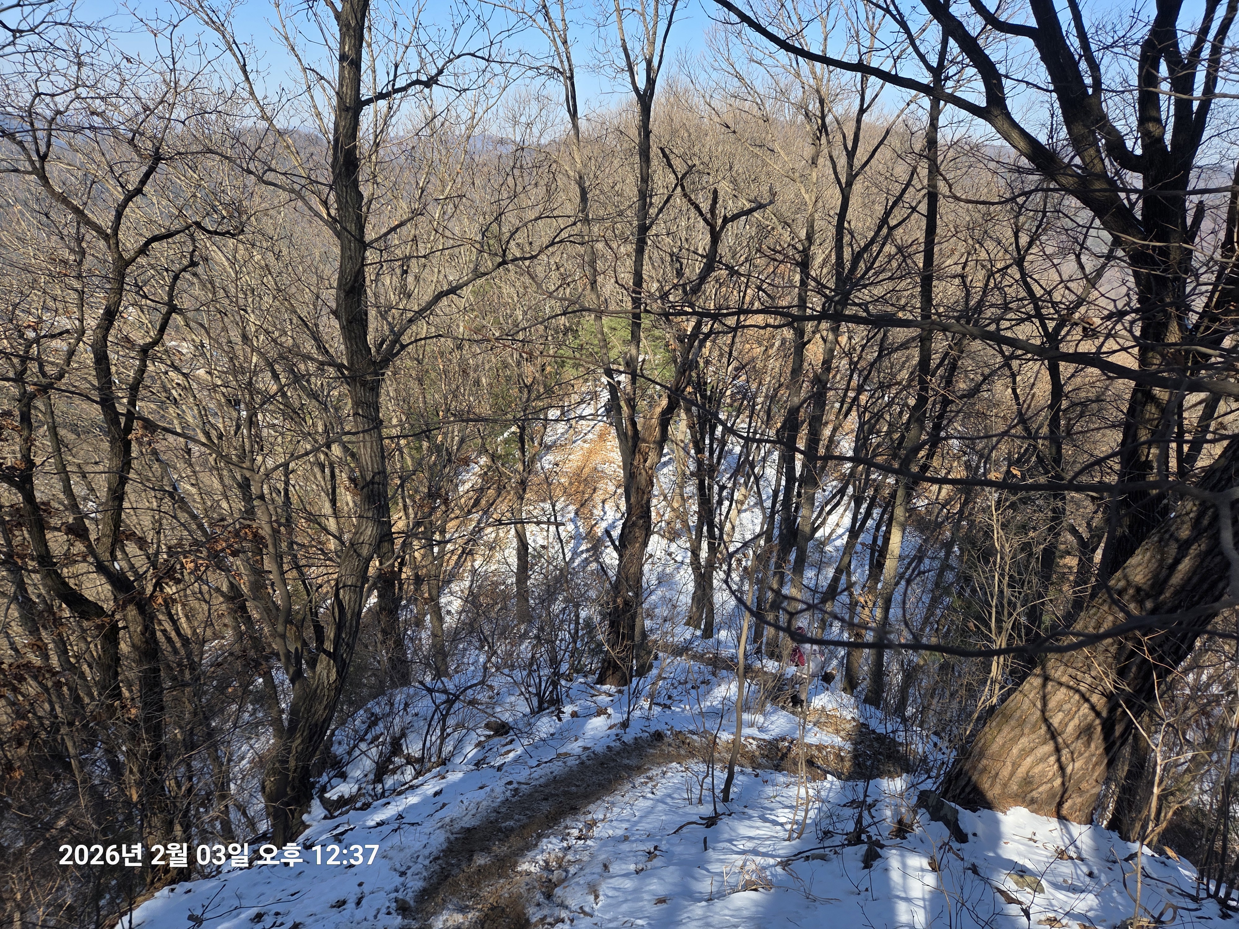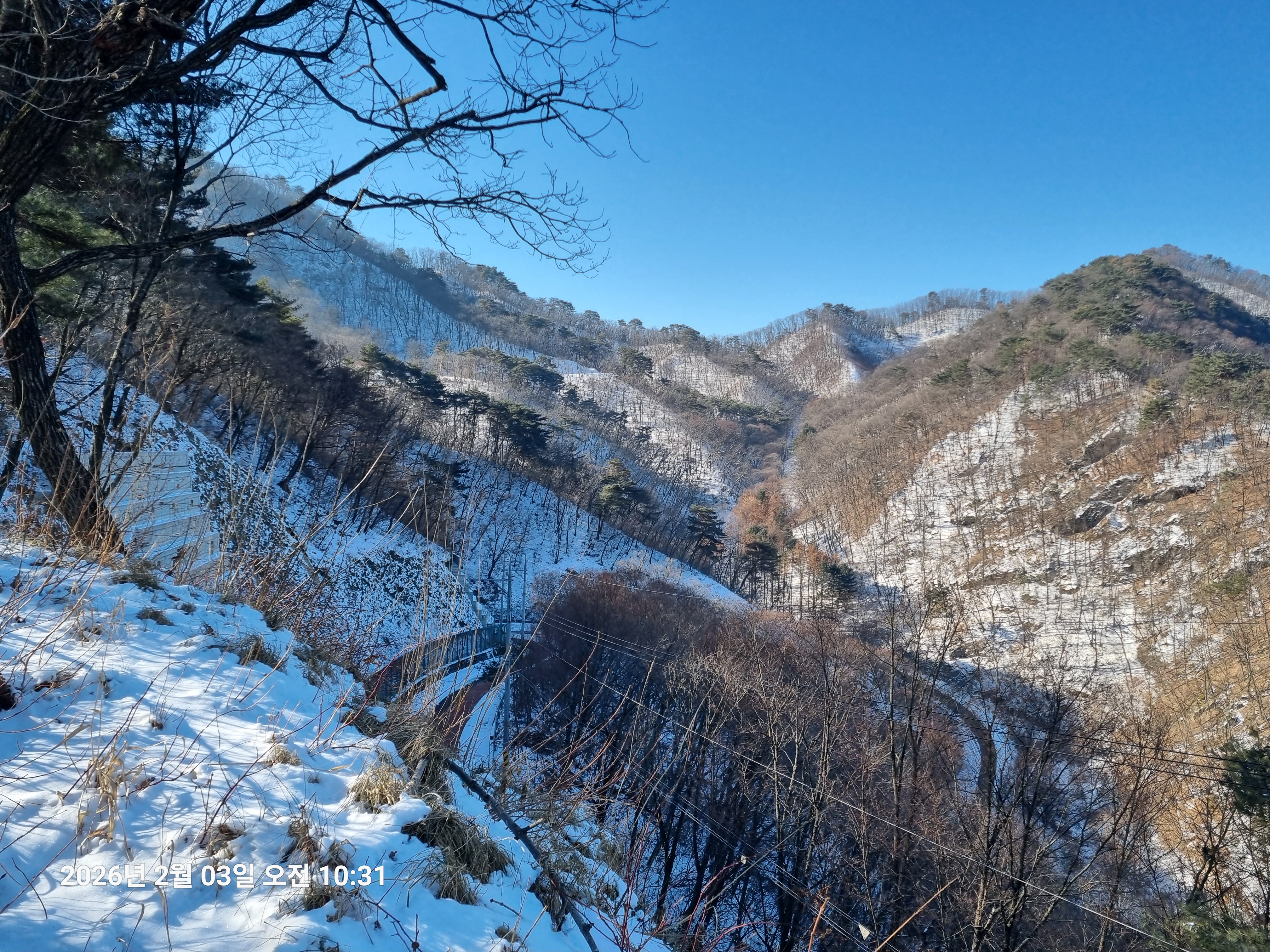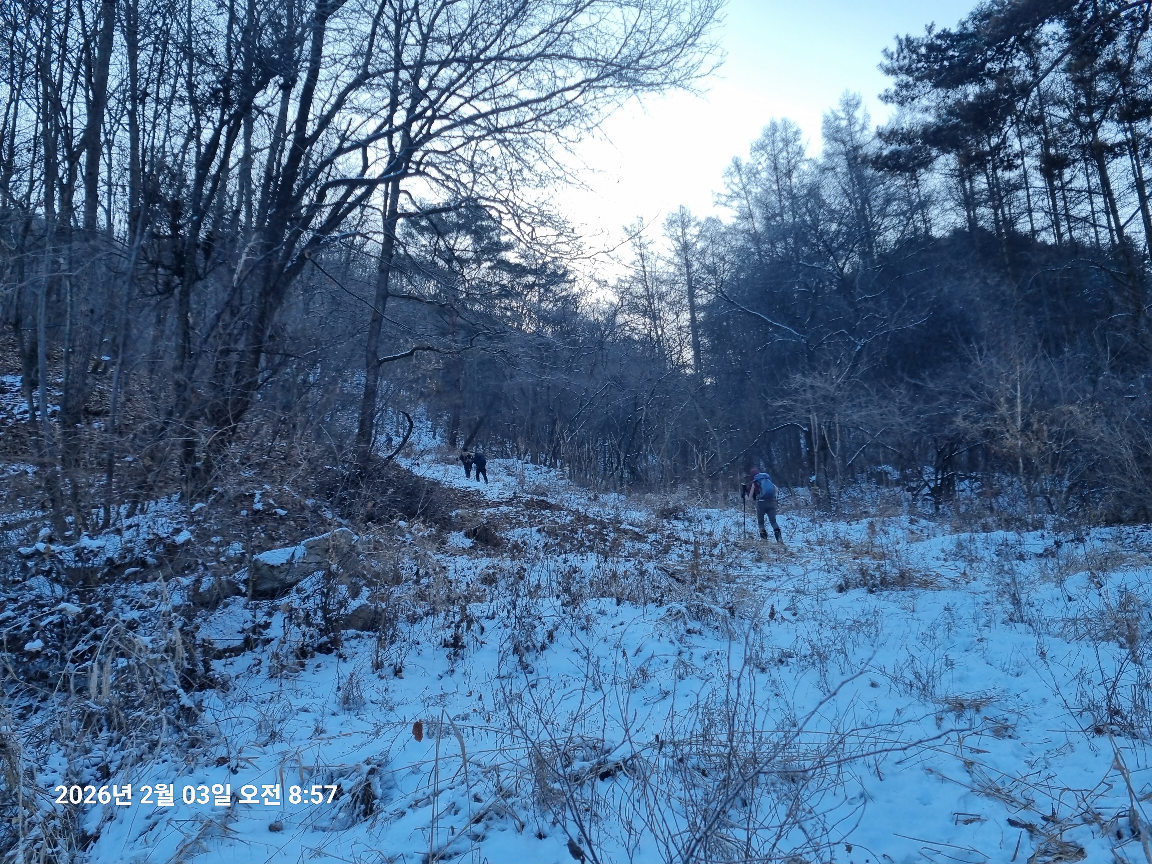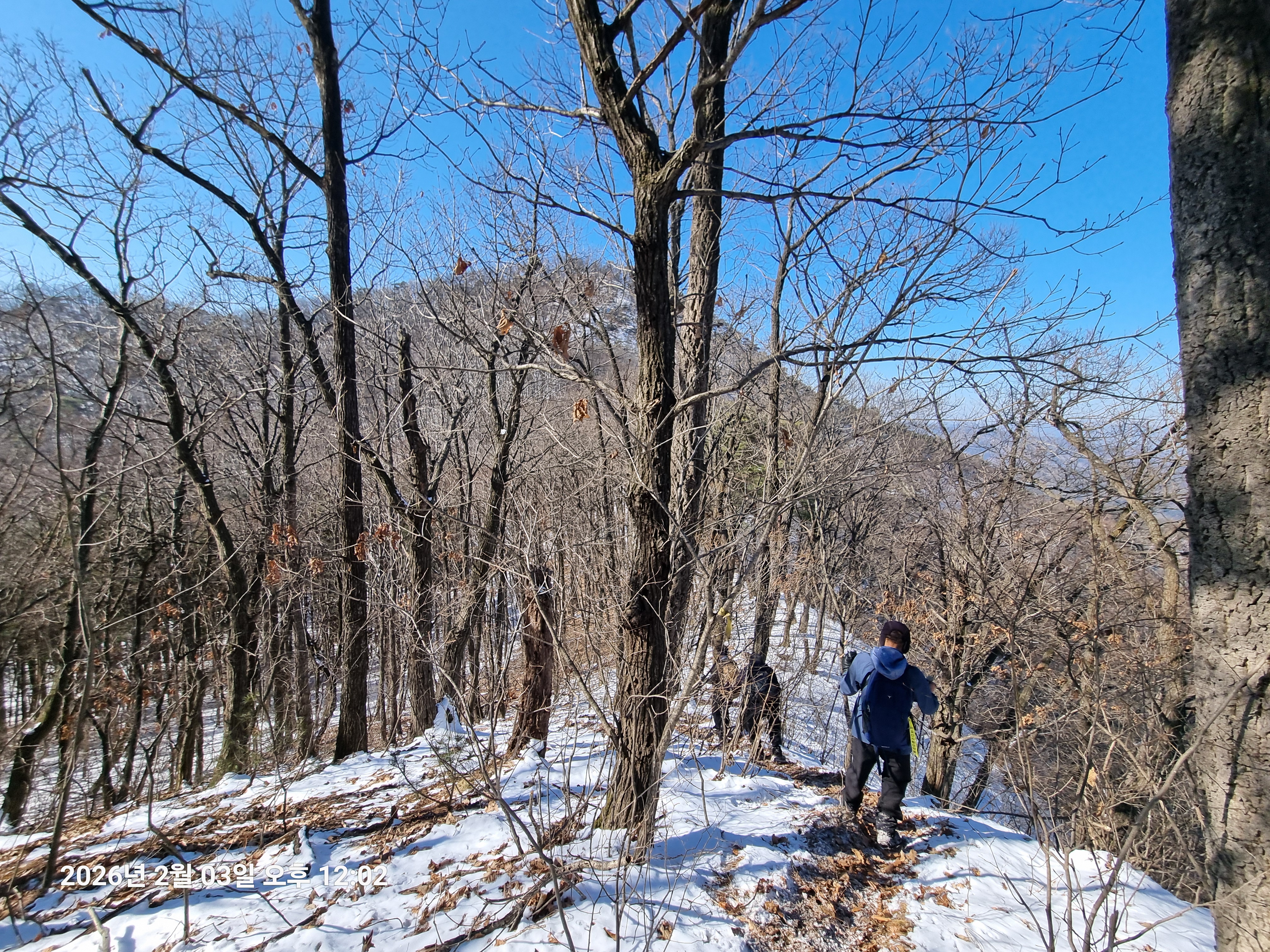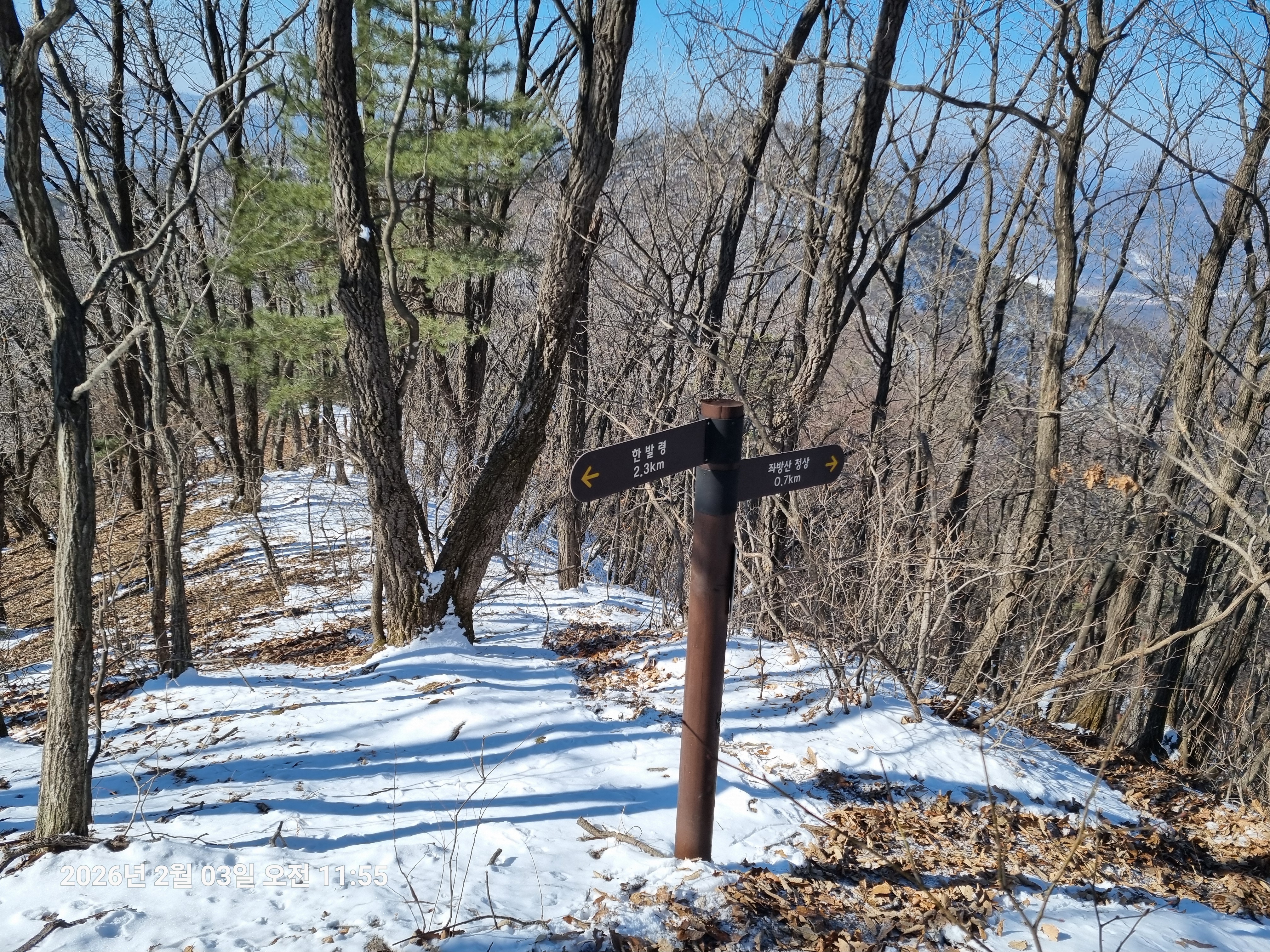 2026년 2월 3일. 화요일. 아침에는 영하 10도로 내려가 추우나 한낮에는 영상기온으로 올라가서 따뜻하다. 눈이 내려 미끄러웠고 전반적인 등산로가 거칠었다.