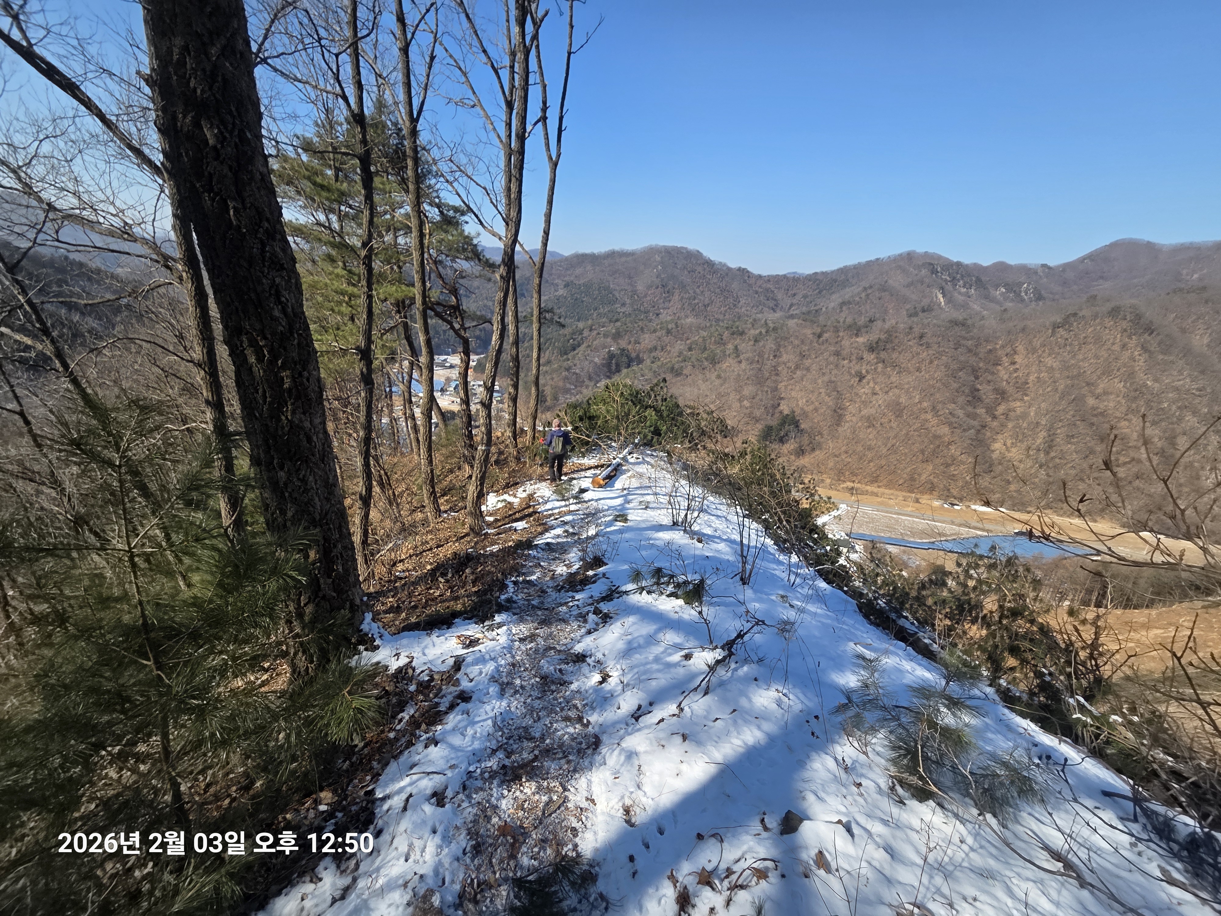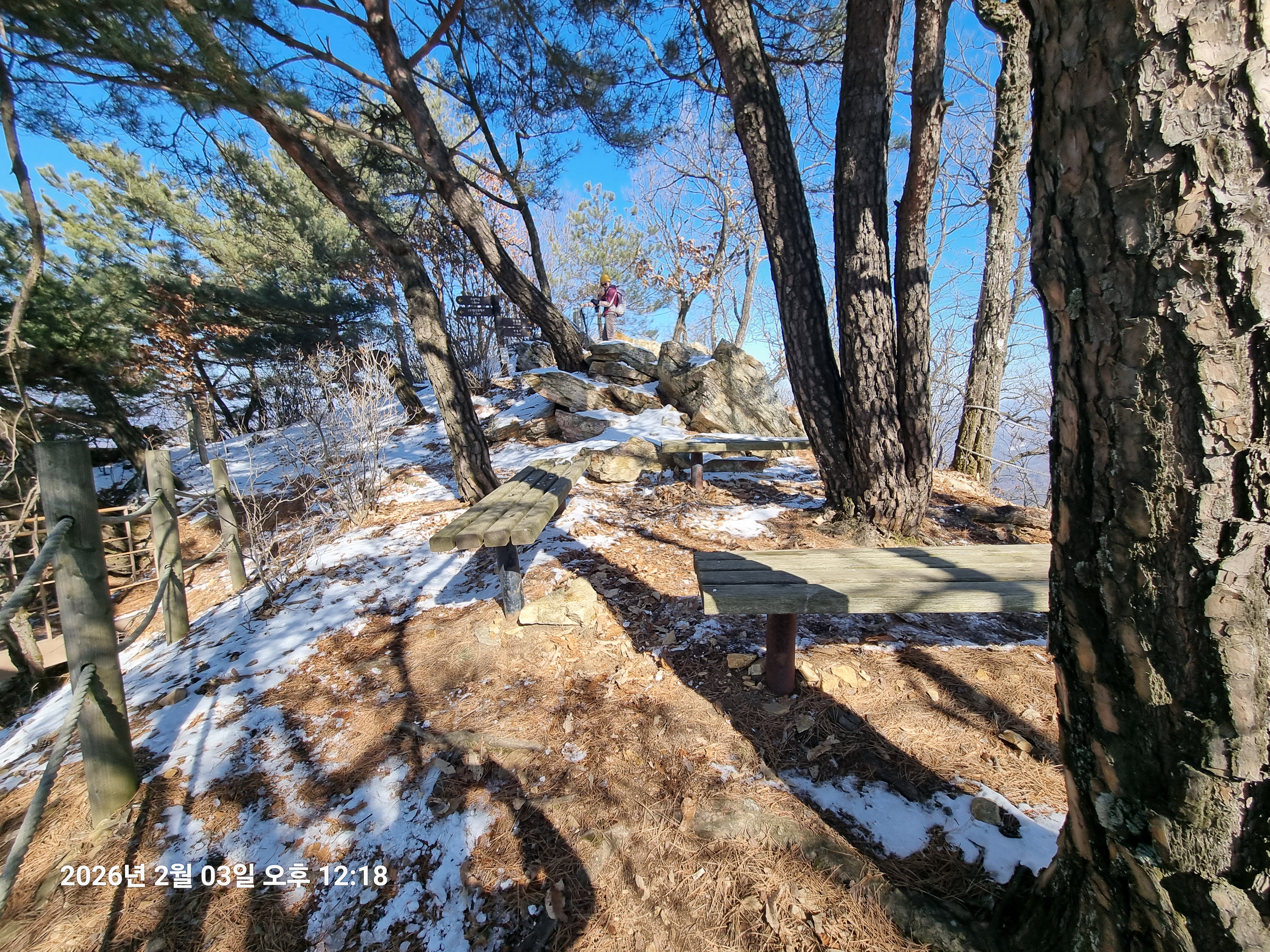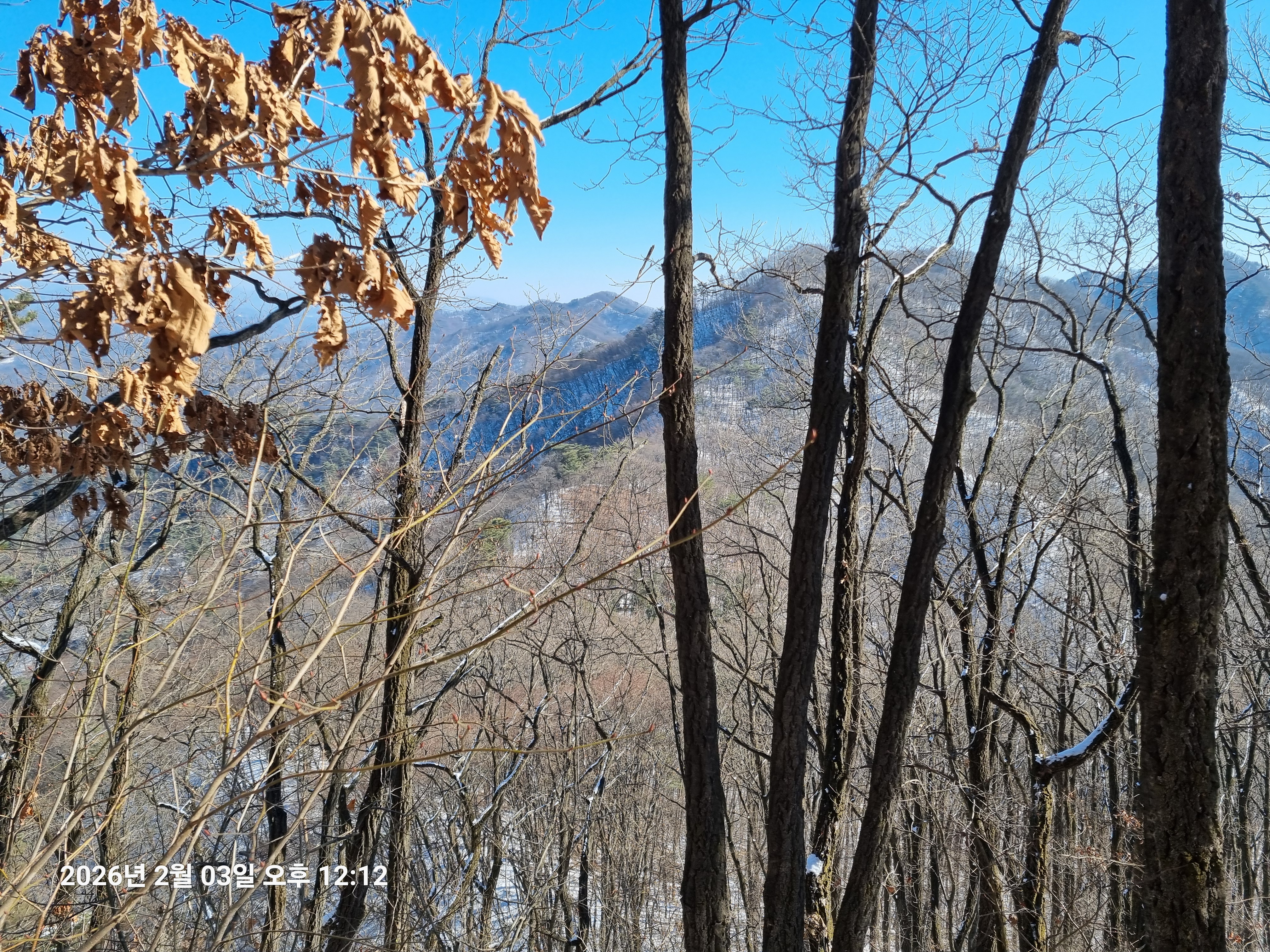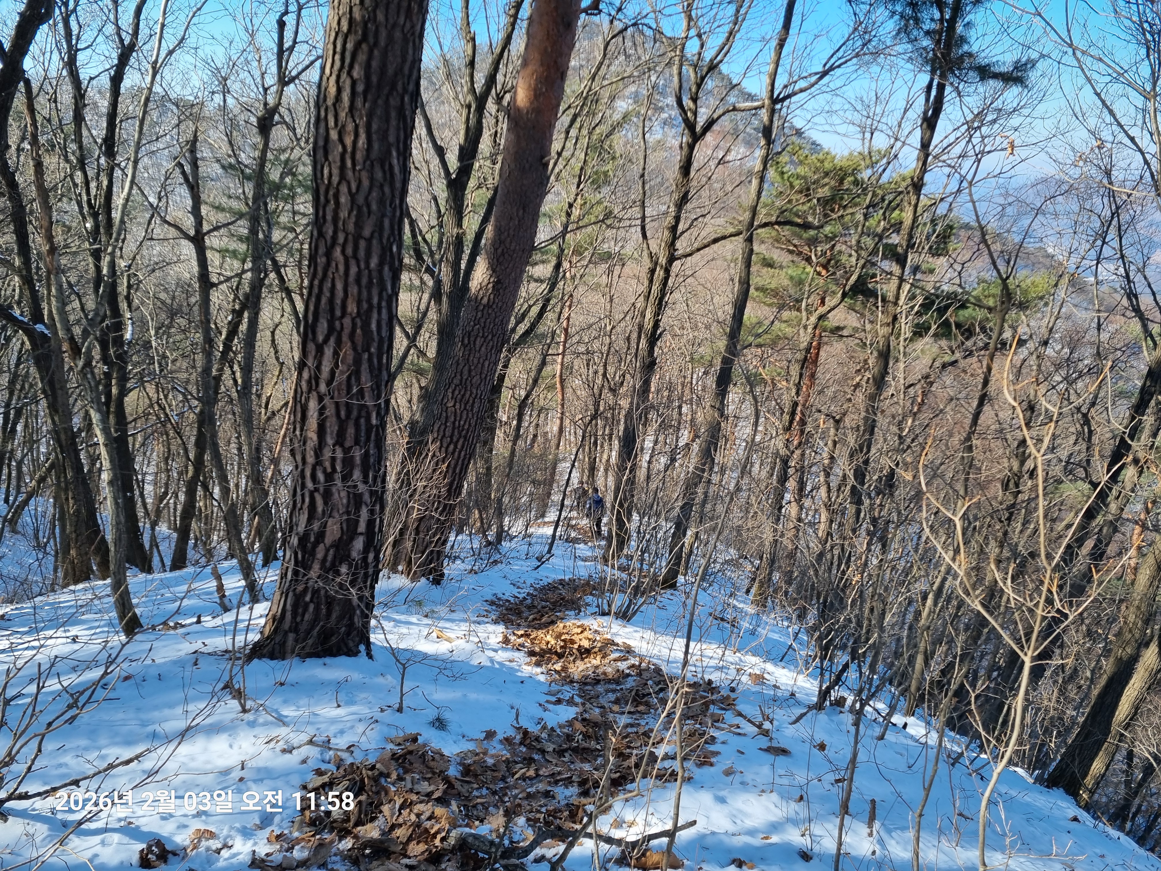 2026년 2월 3일. 화요일. 아침에는 영하 10도로 내려가 추우나 한낮에는 영상기온으로 올라가서 따뜻하다. 눈이 내려 미끄러웠고 전반적인 등산로가 거칠었다.