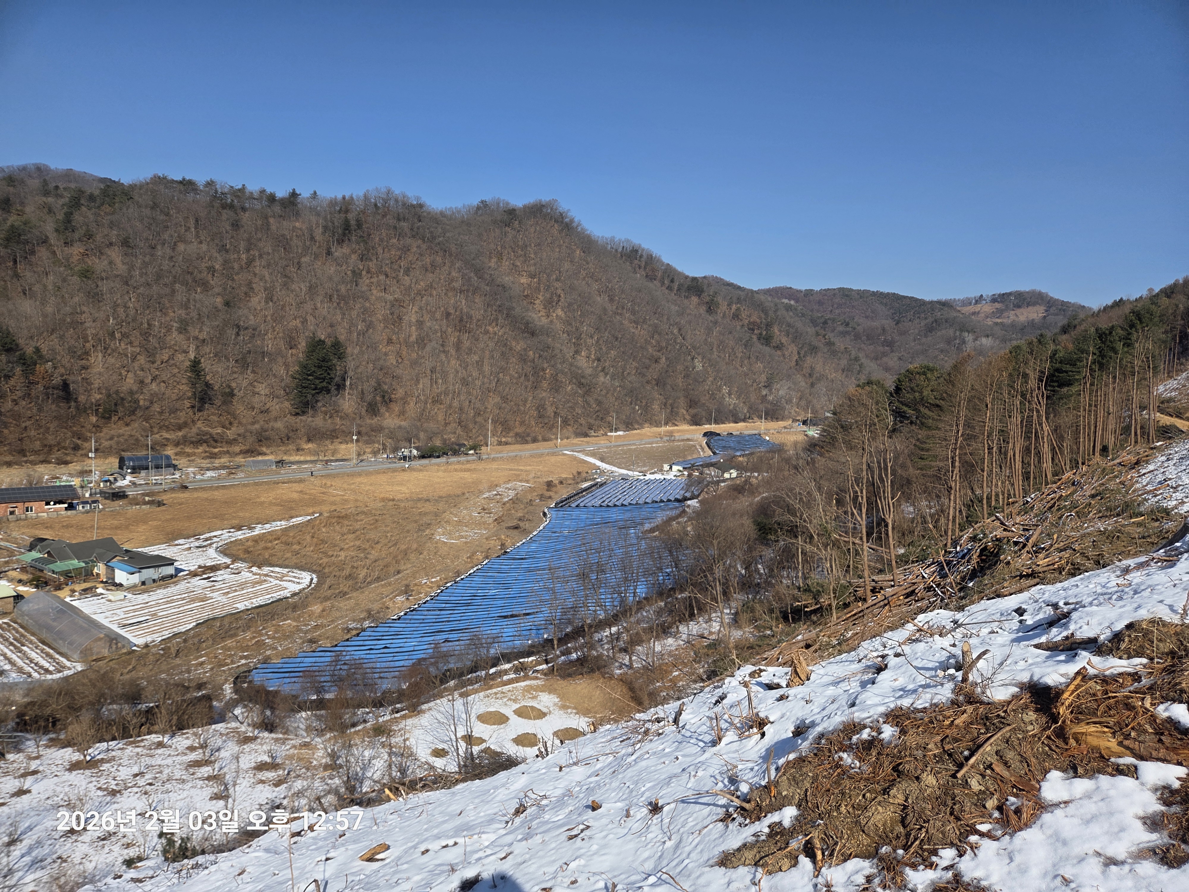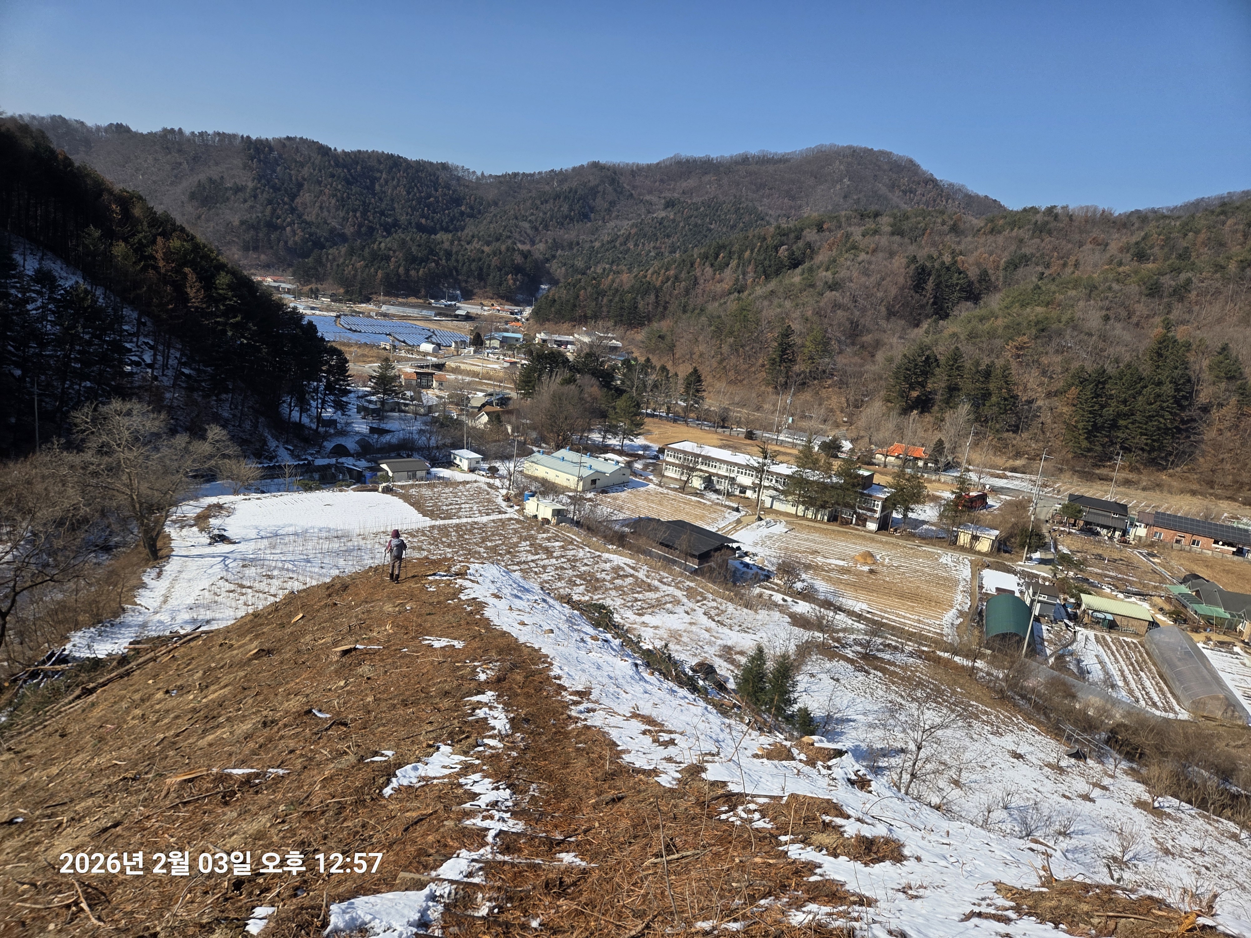 ▼ 벌목지 능선으로 내려가며 ... 춘천시 남면 발산리 '남면 행정복지센터'를 내려다보다.