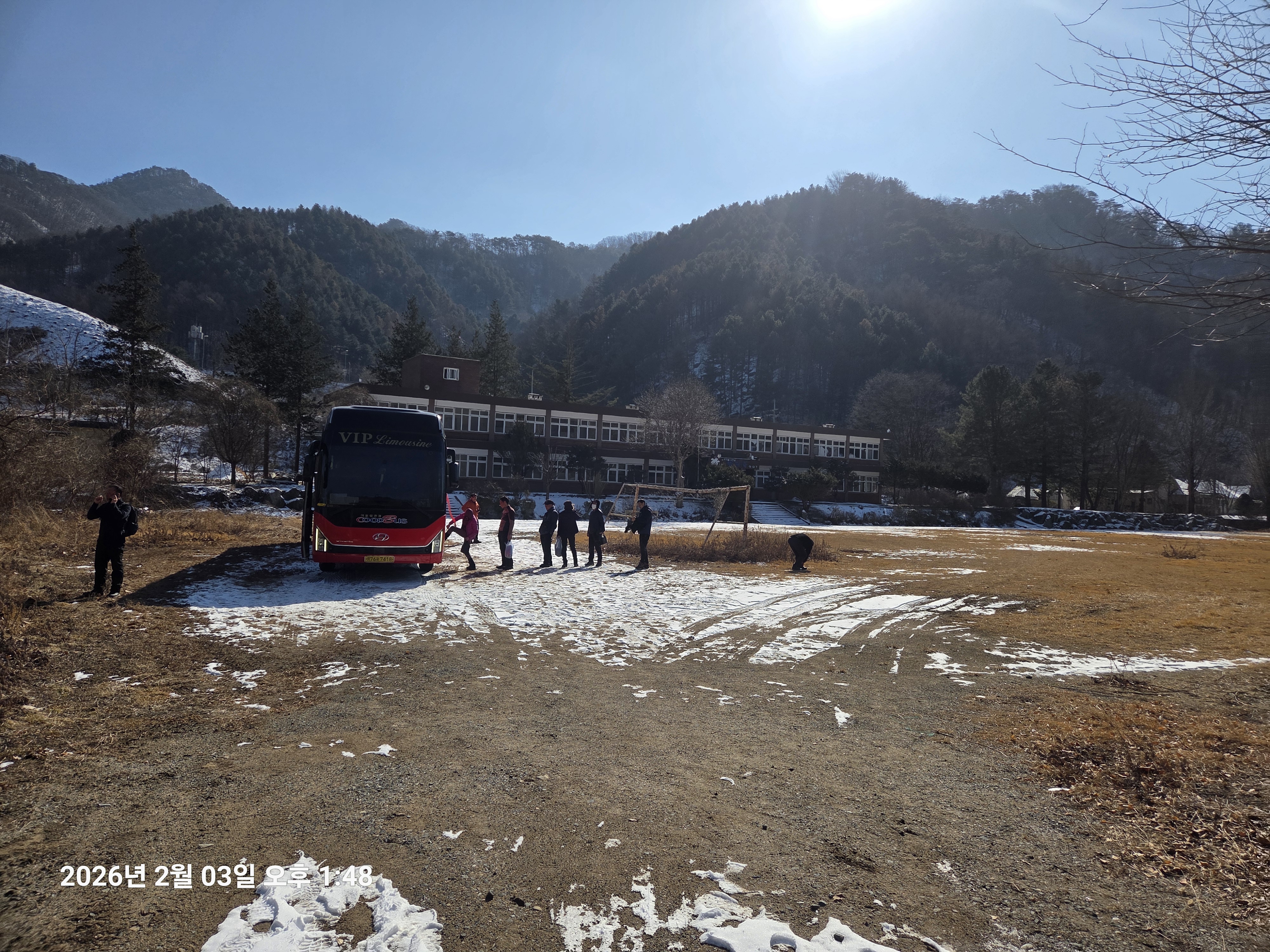 ▼ (구) 발산중학교 운동장에 산악회 버스가 대기중이다.