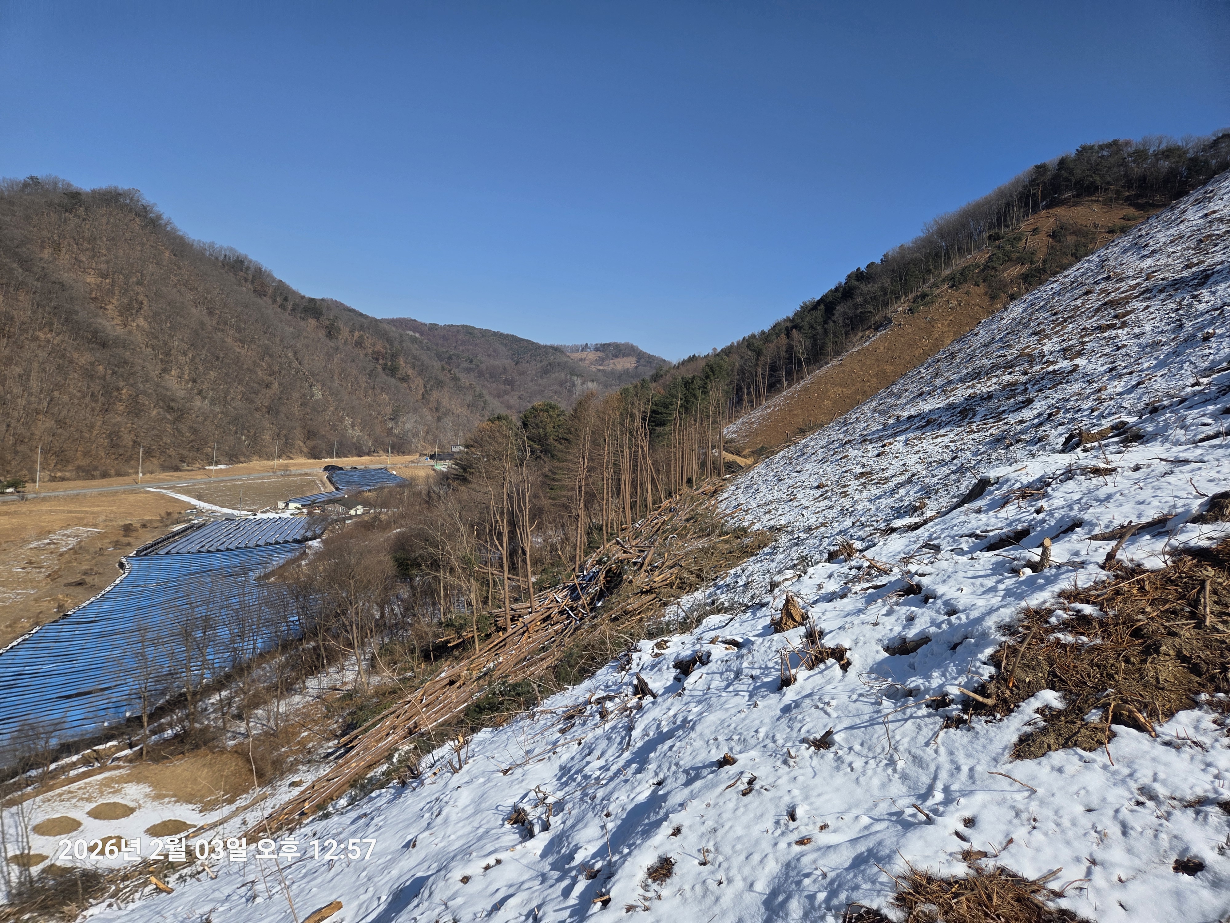 ▼ 윗 사진 우측 ; 내려 온 벌목지 능선을 뒤돌아보다.